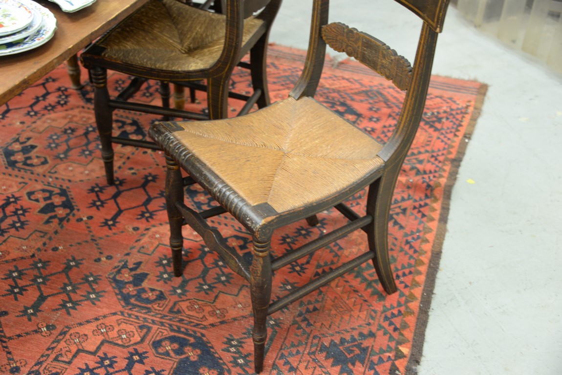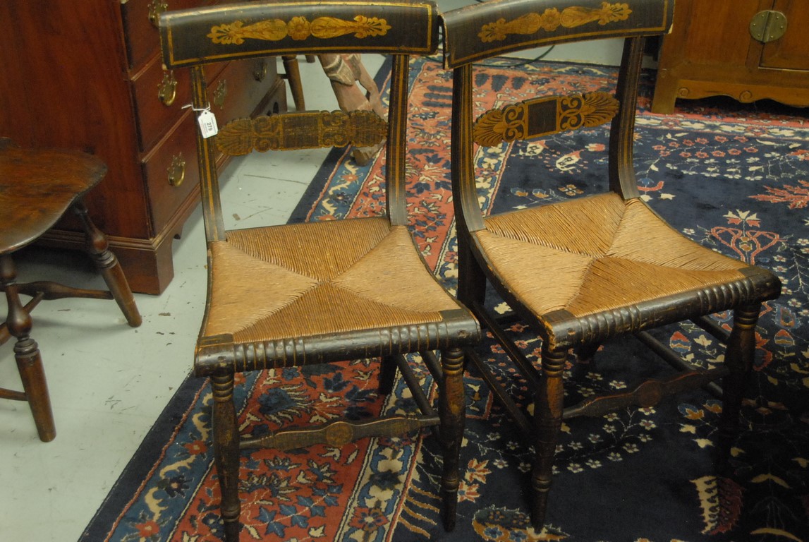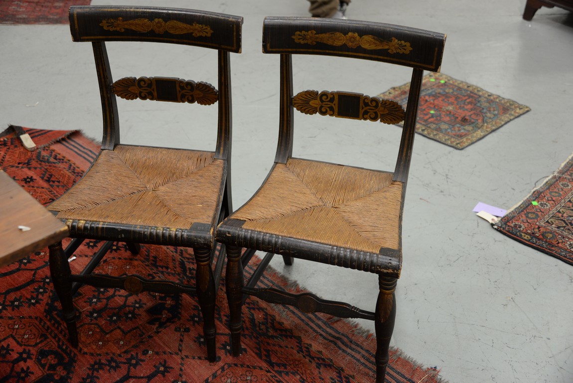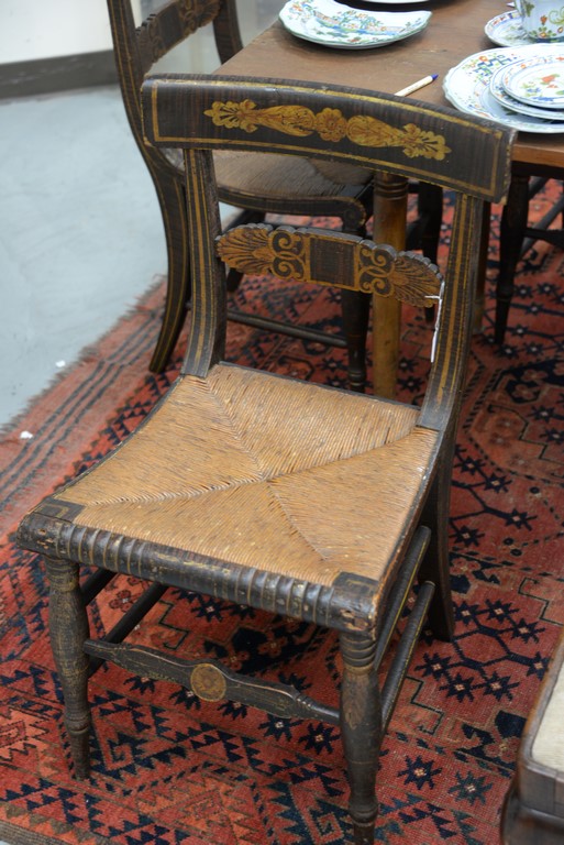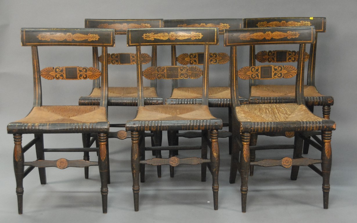 Lot 370: Set of six Sheraton fancy chairs with original paint stenciling and rush seats. seat ht. 18 in.