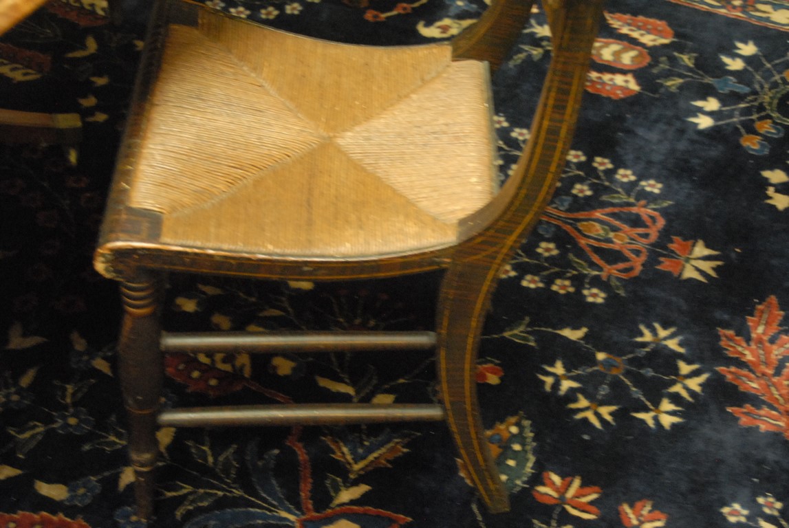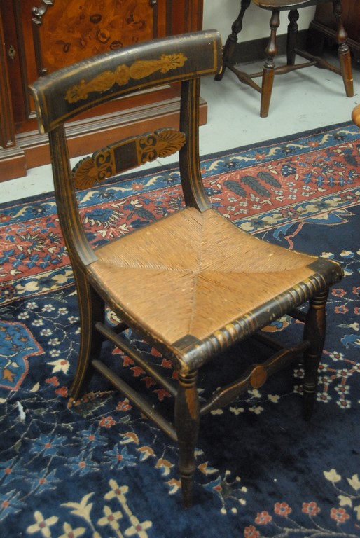 Set of six Sheraton fancy chairs with original paint stenciling and rush seats. seat ht. 18 in.