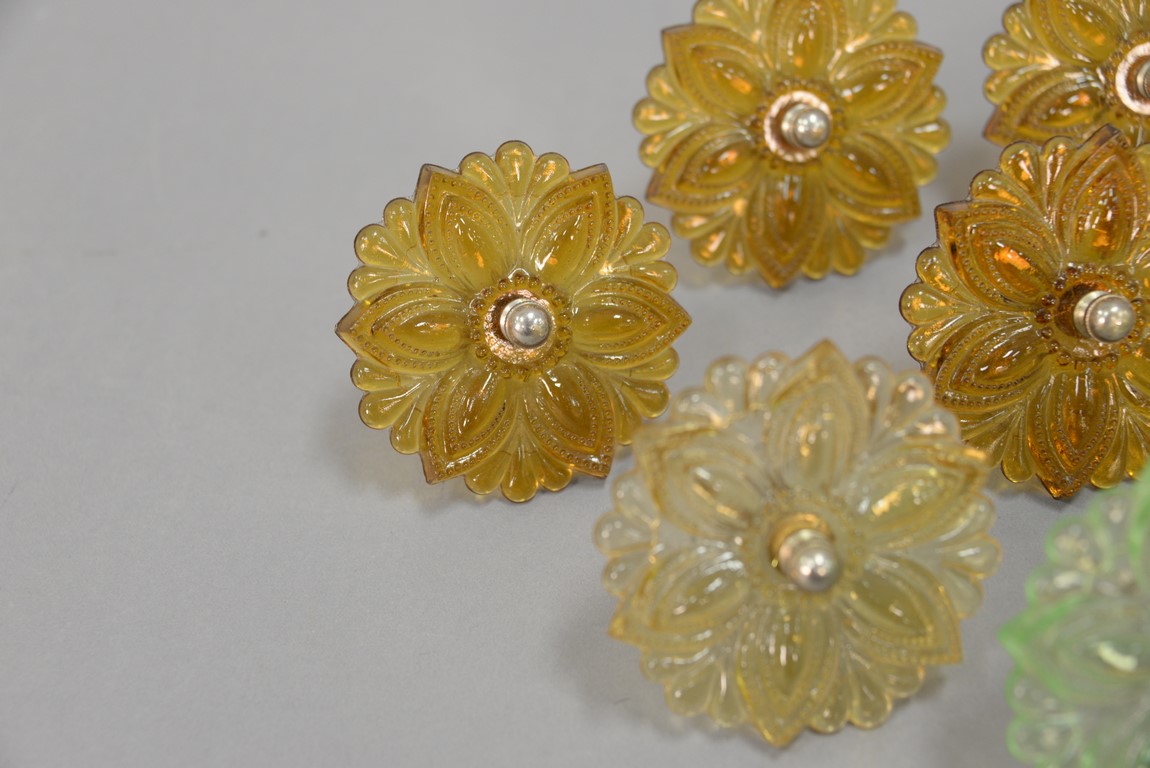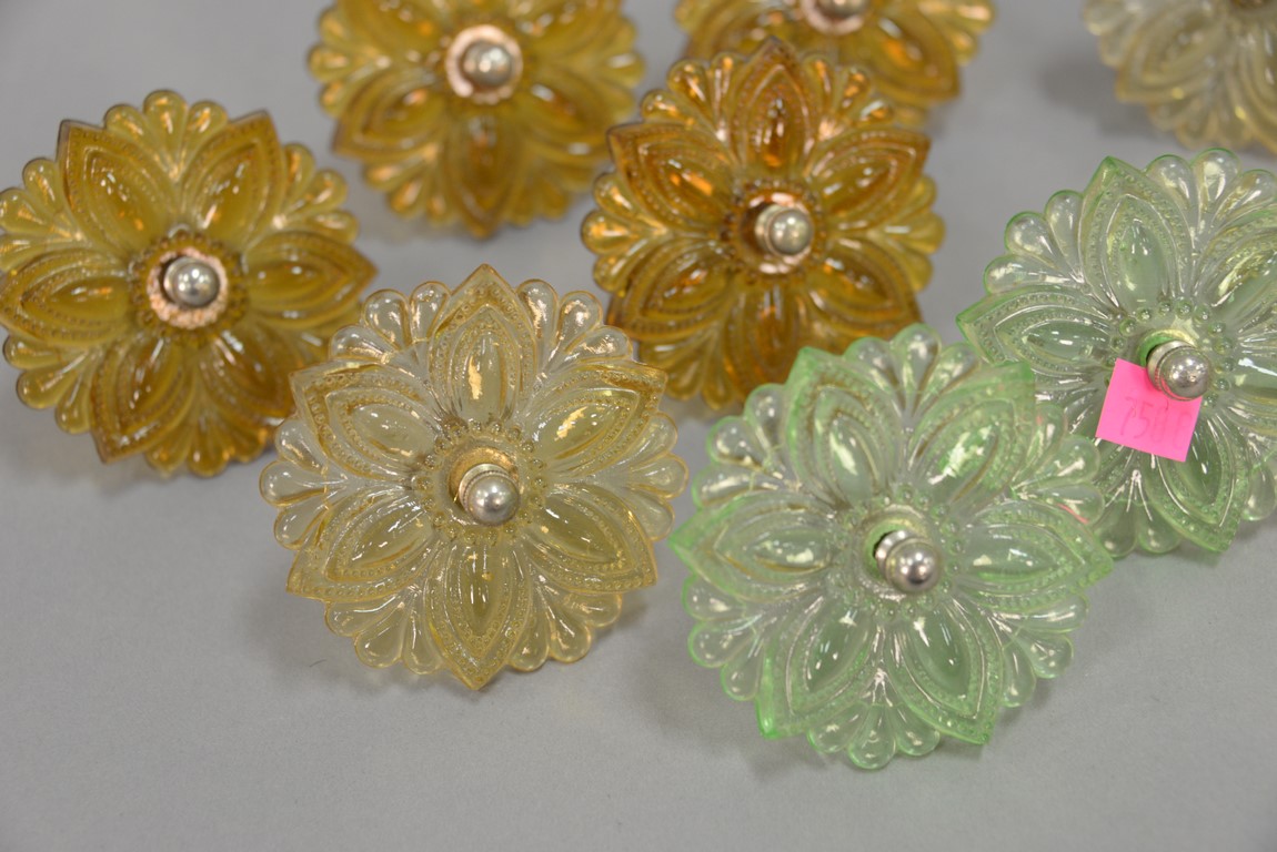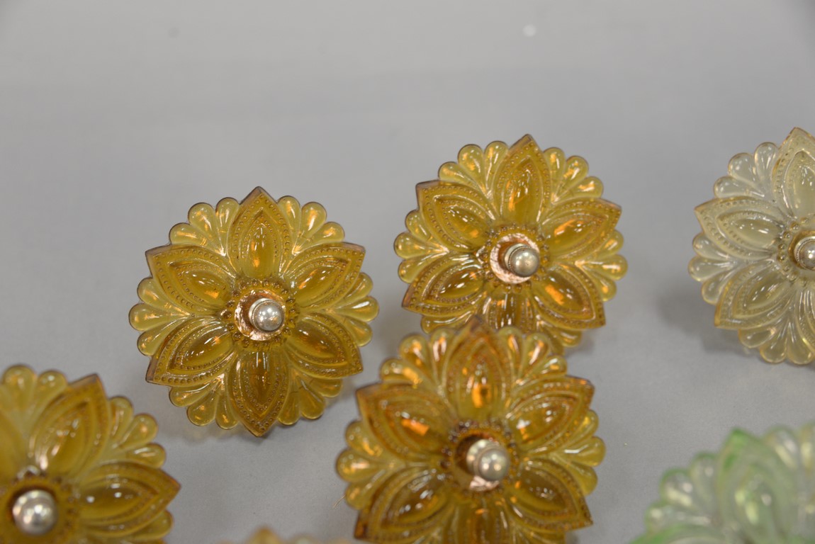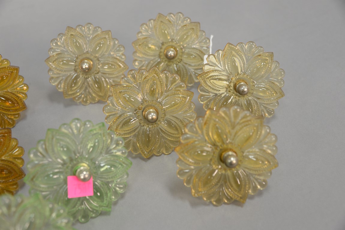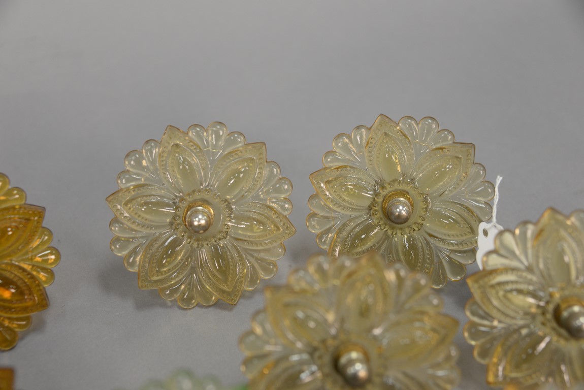 Lot 370: Six pairs of sandwich glass curtain tie backs, floral pattern, one pair green, three pairs peach tan color, and two pairs tan brown …