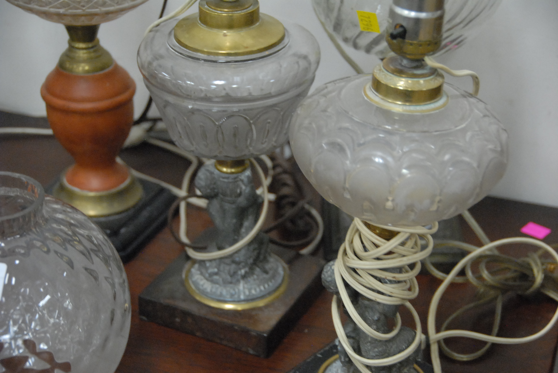 Ten piece lamp lot including four whale oil lamps and one student lamp.