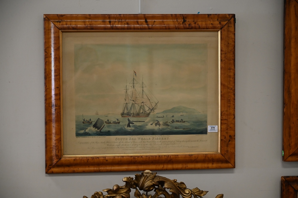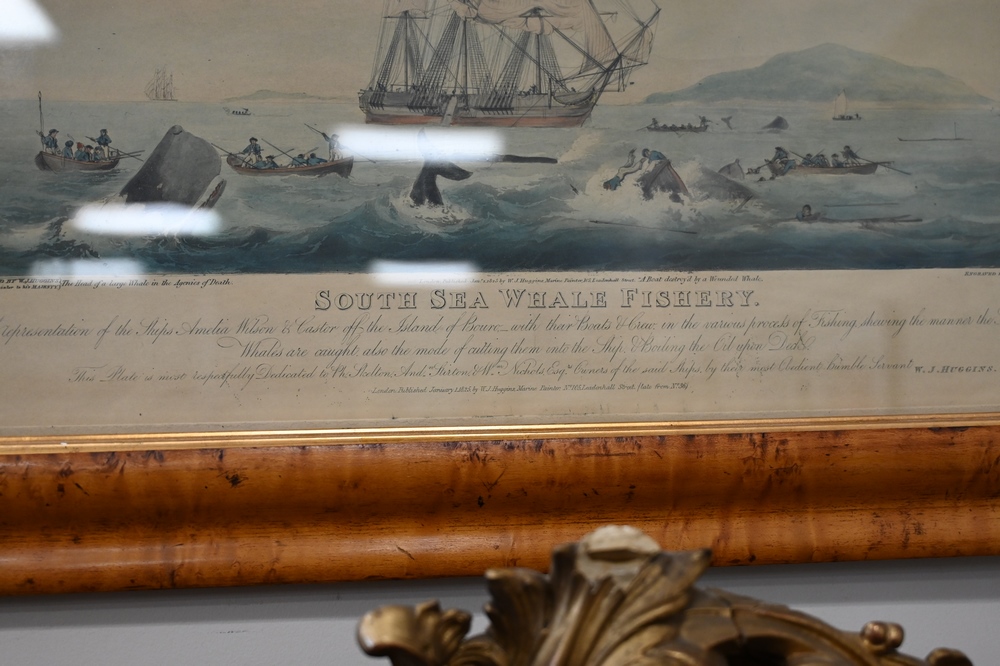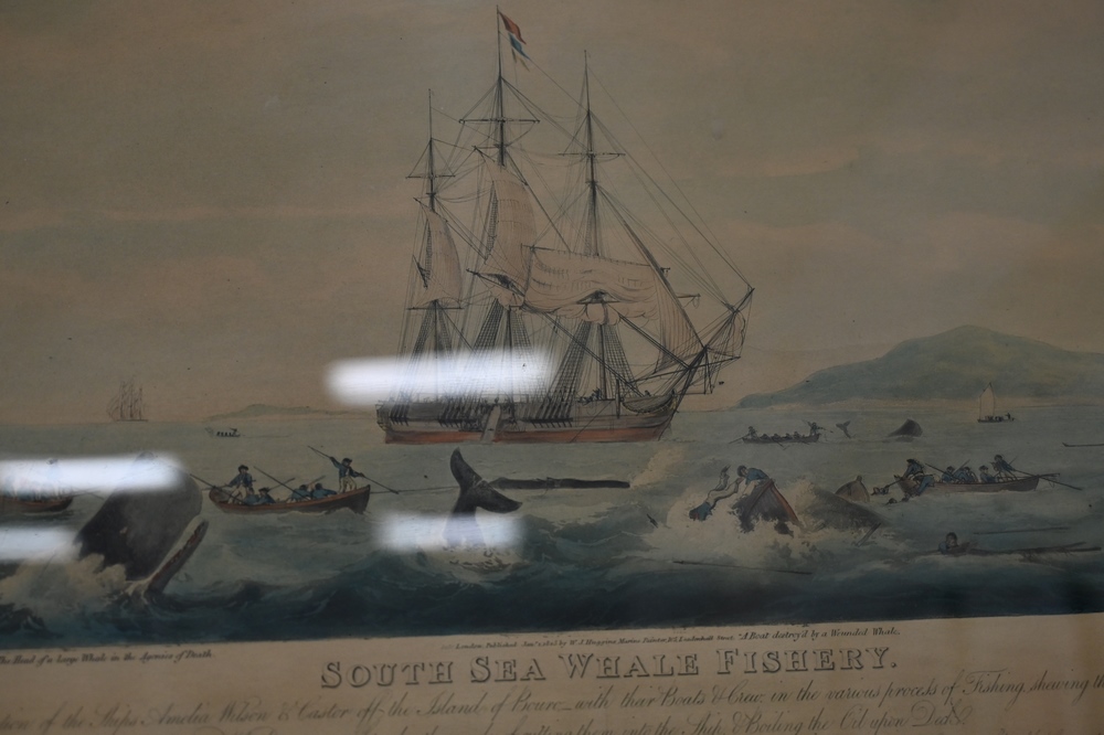 Lot 370: Thomas Sutherland (1785 – 1838), after W.J. Huggins, “South Sea Whale Fishery”, engravings with hand coloring on paper, image size 14″ x 20″.