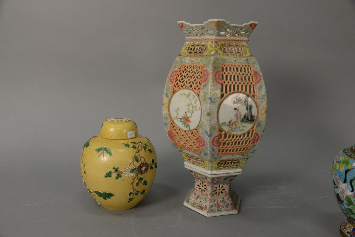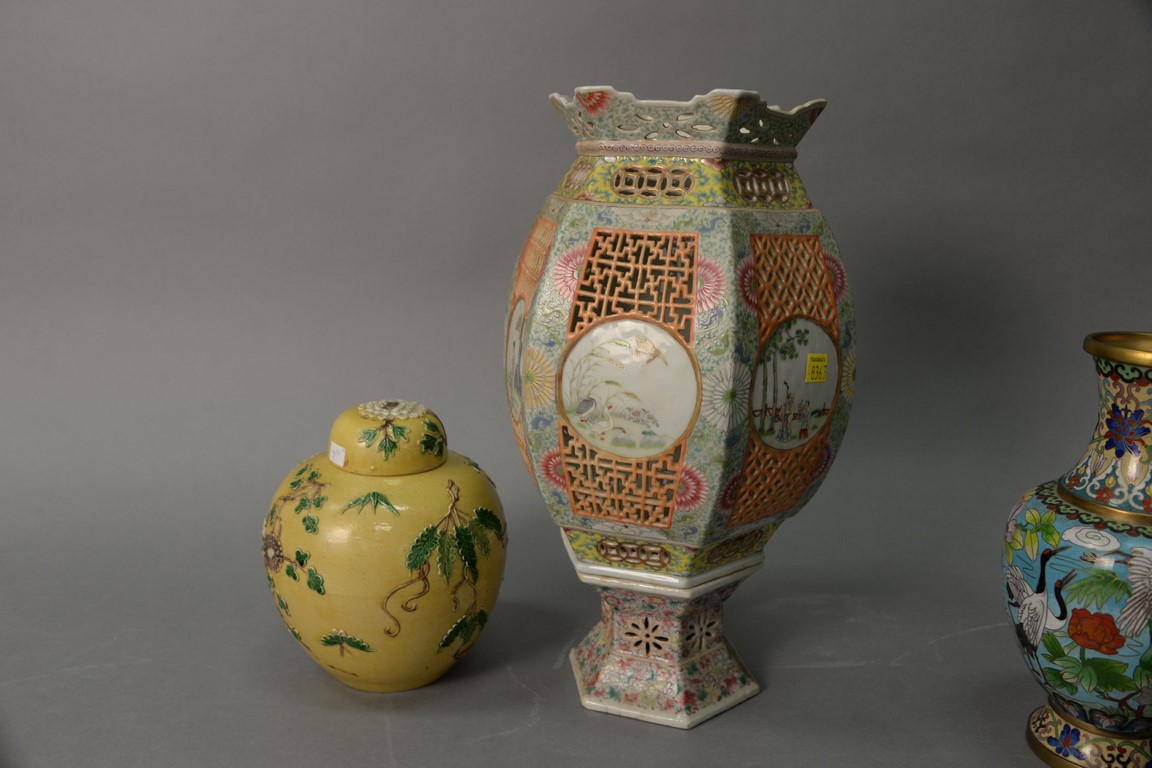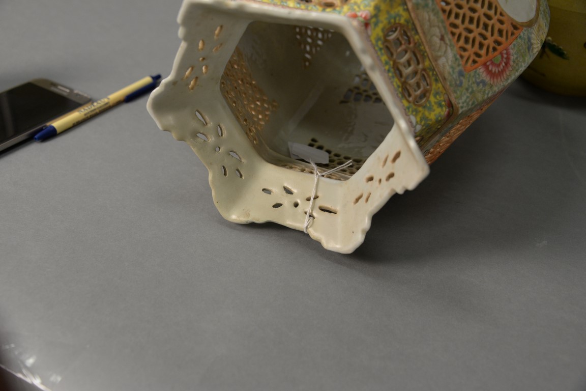 Lot 370: Two Chinese porcelain pieces to include large famille rose porcelain lantern having hexagon shade with reticulated panels repaired…
