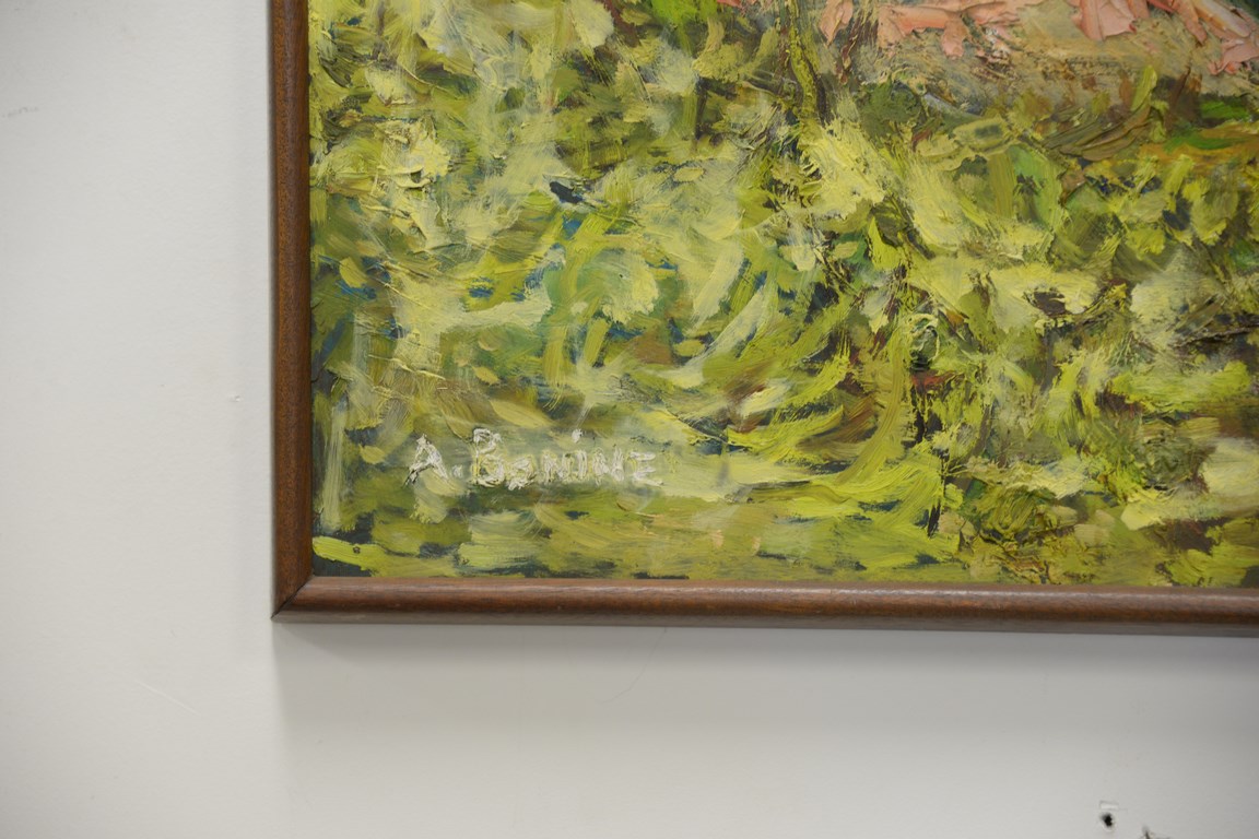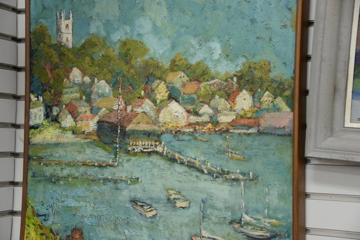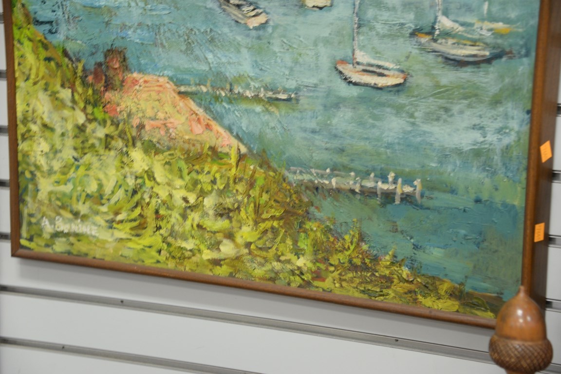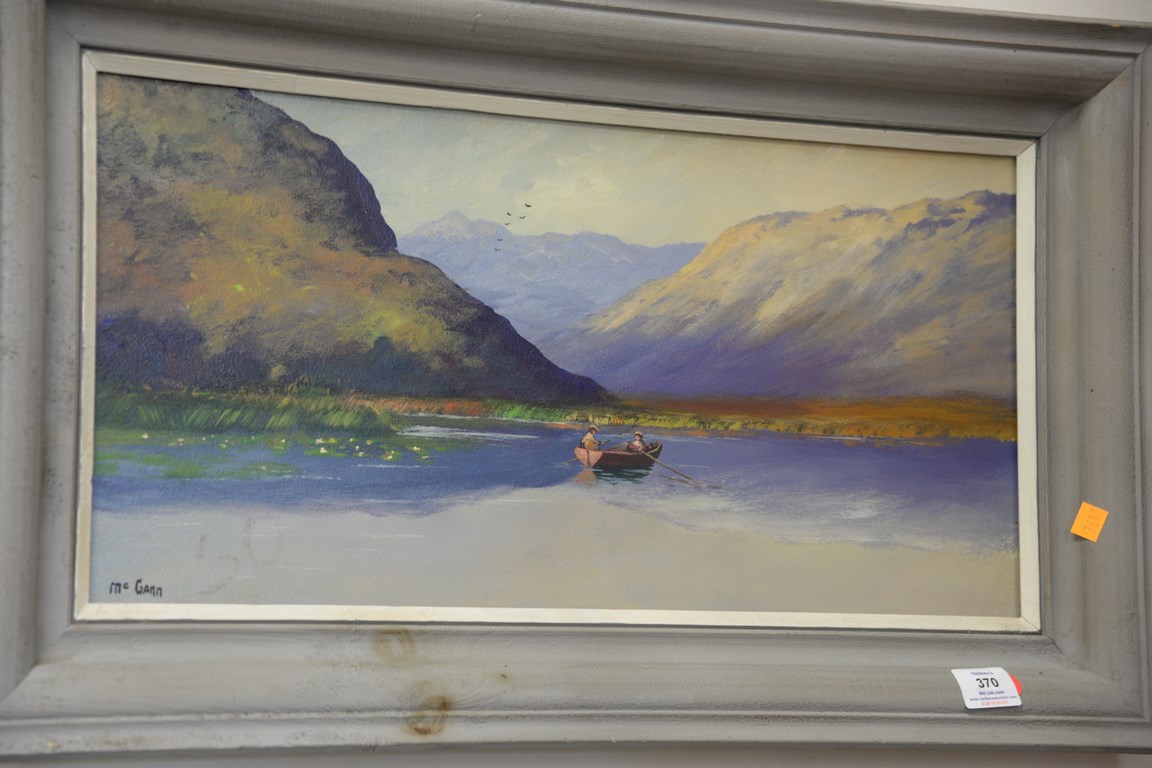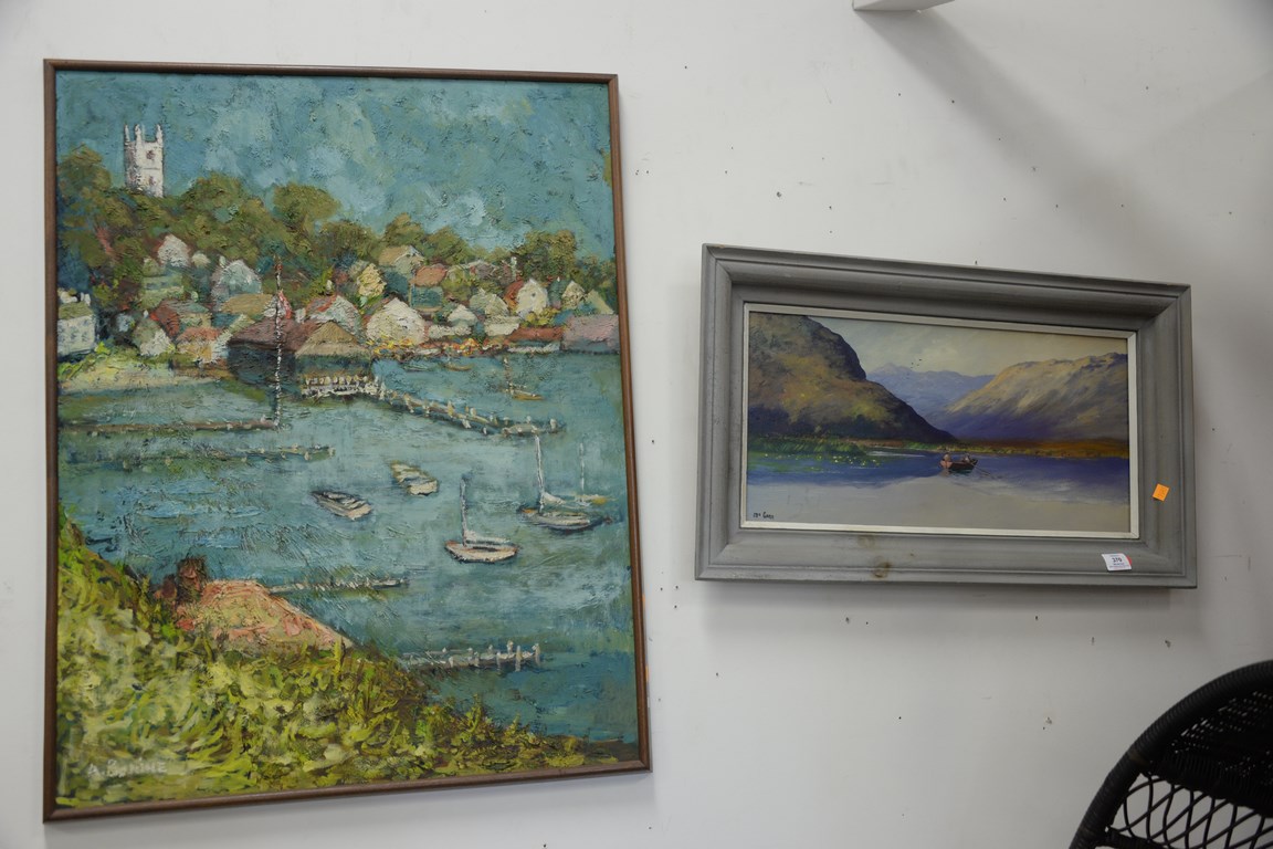 Lot 370: Two oil on board paintings including empty spring marina signed A. Bonine and fishing in a rowboat signed McGann.