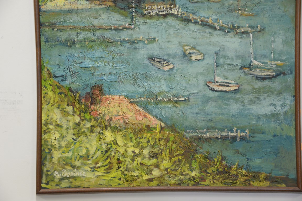Two oil on board paintings including empty spring marina signed A. Bonine and fishing in a rowboat signed McGann.