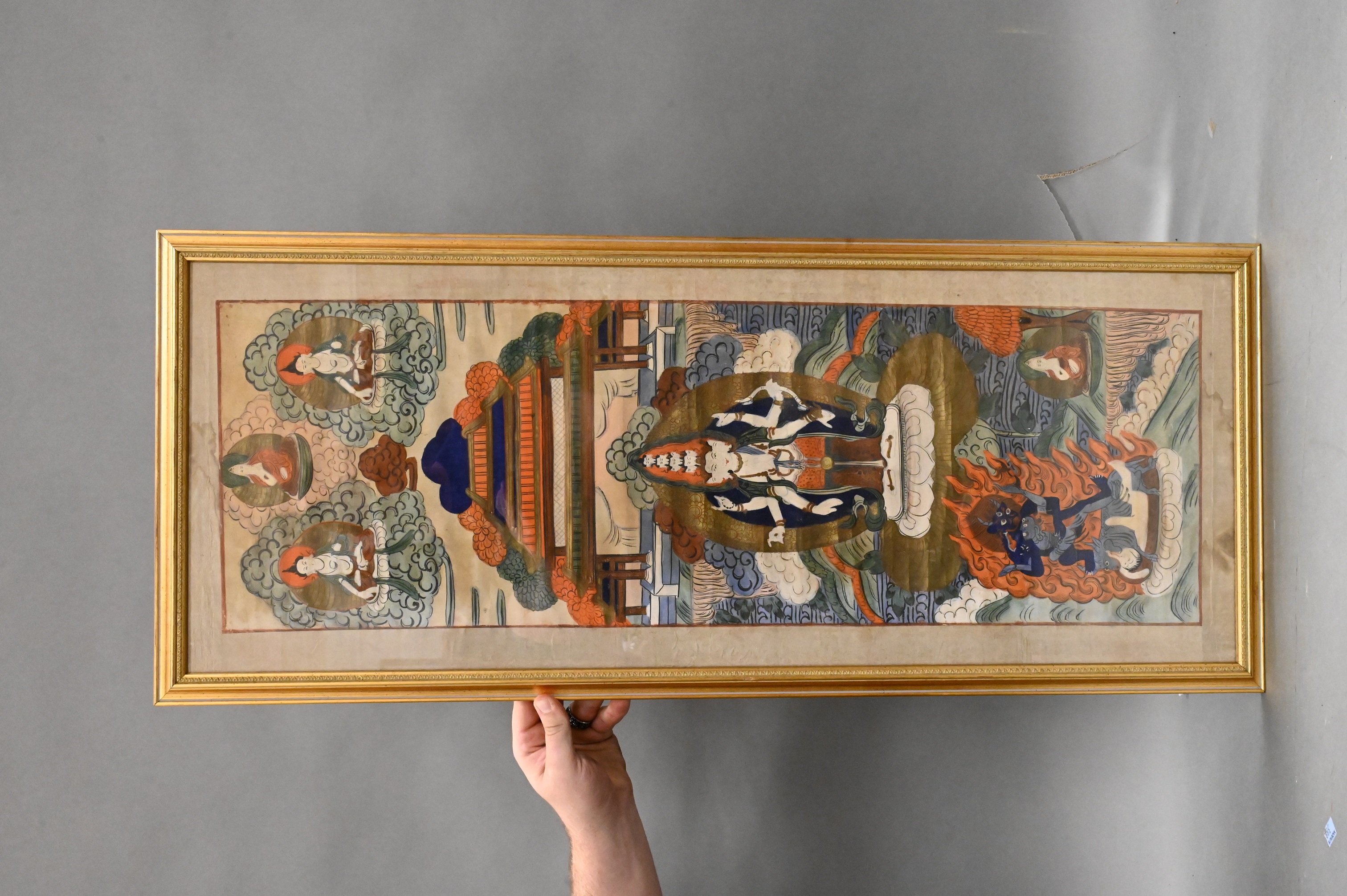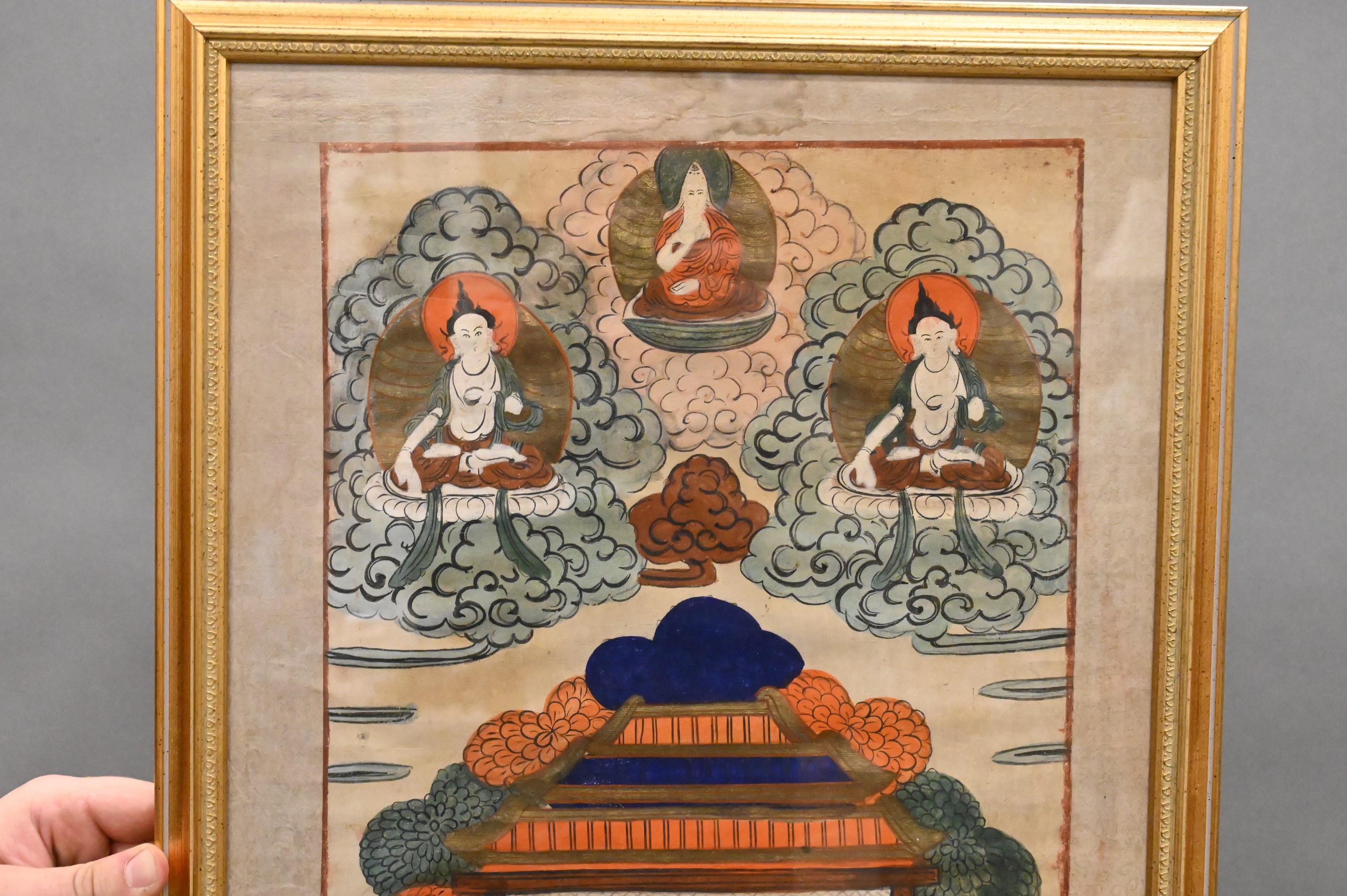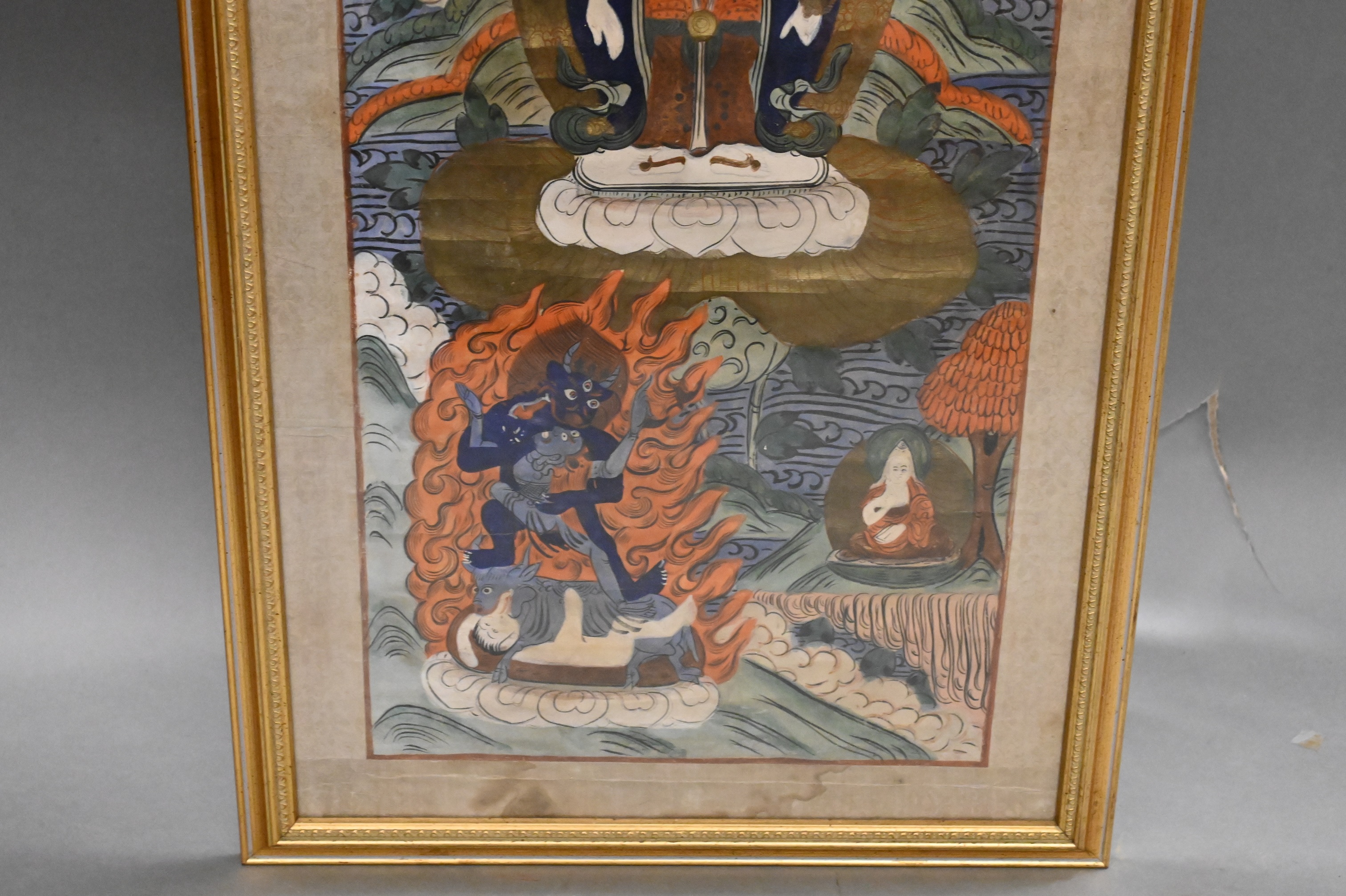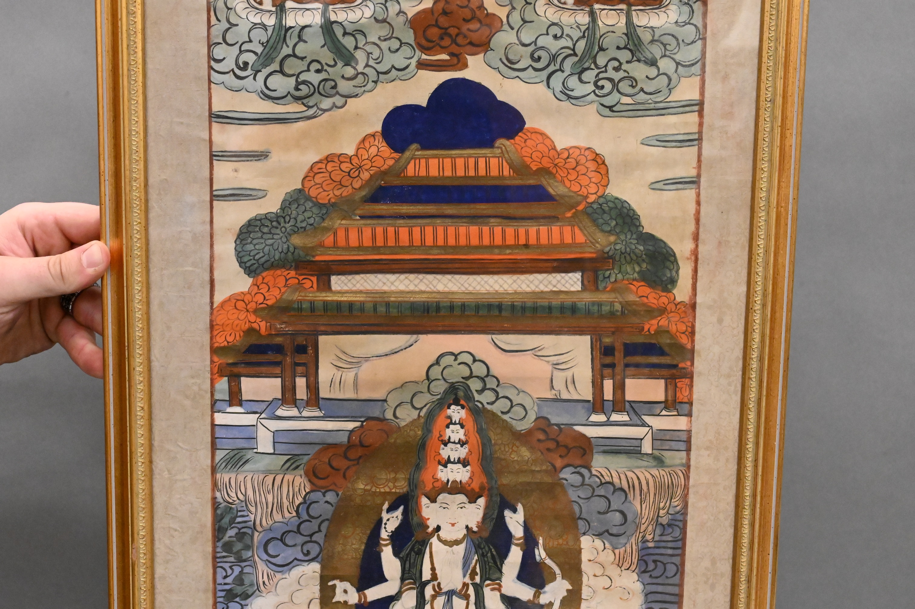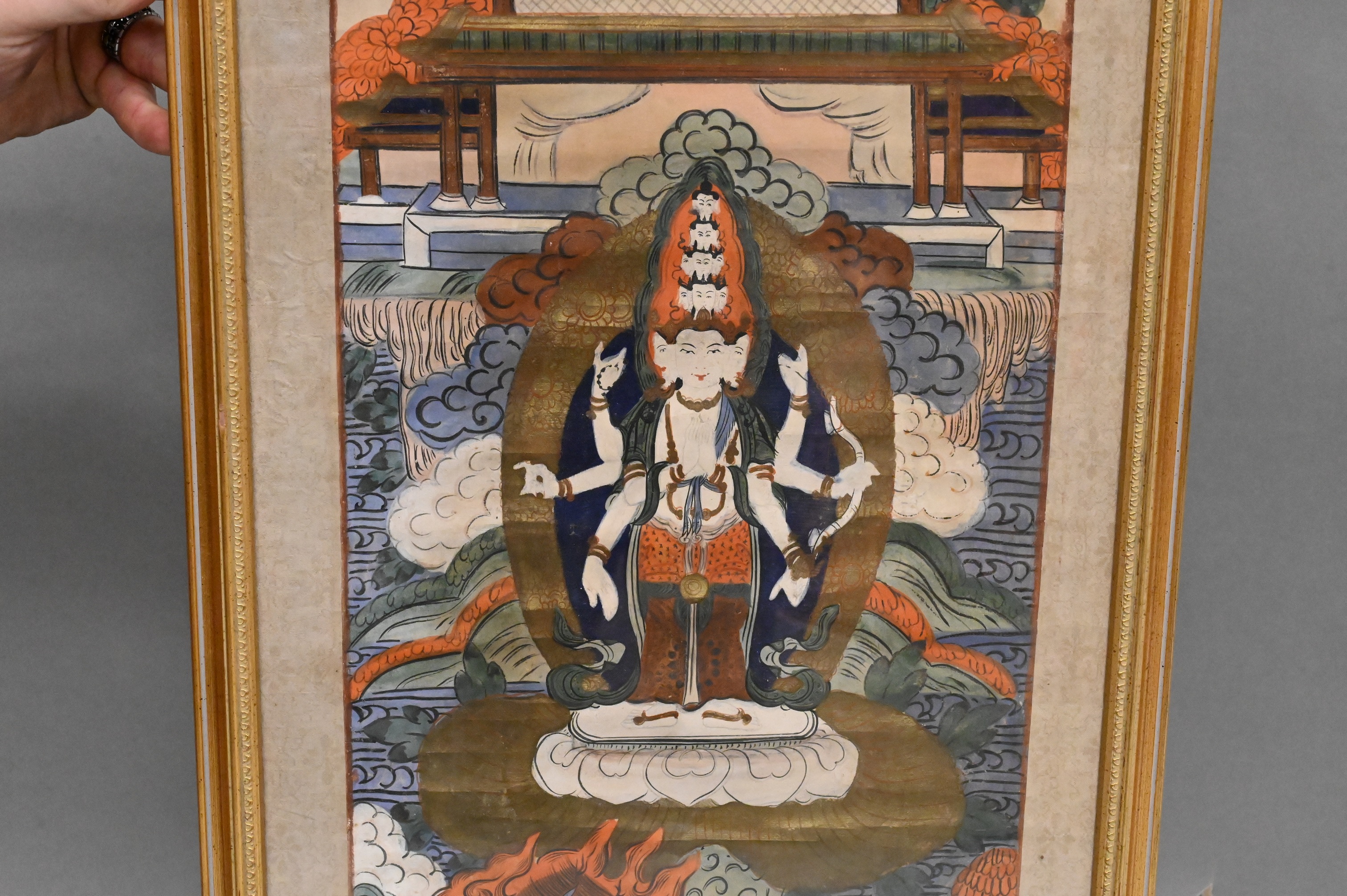 to include Tibetan style Thangka 18th century or later featuring on 11 headed deity (Guanyin or Avalokiteshvara) standing between the heavens and the underworld, gouache on silk mounted on paper, along with reverse glass painted mirror of a Geisha and fruit