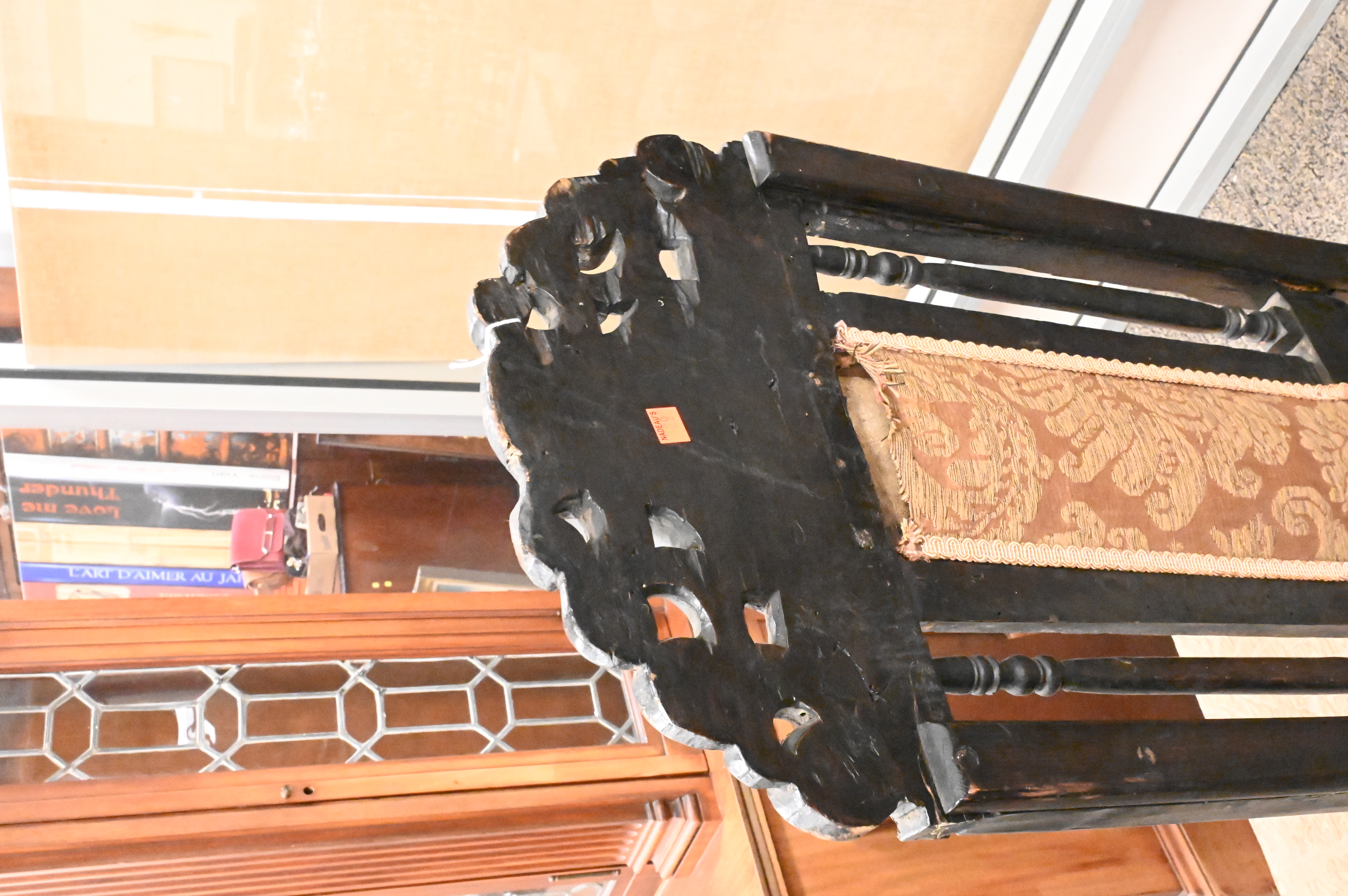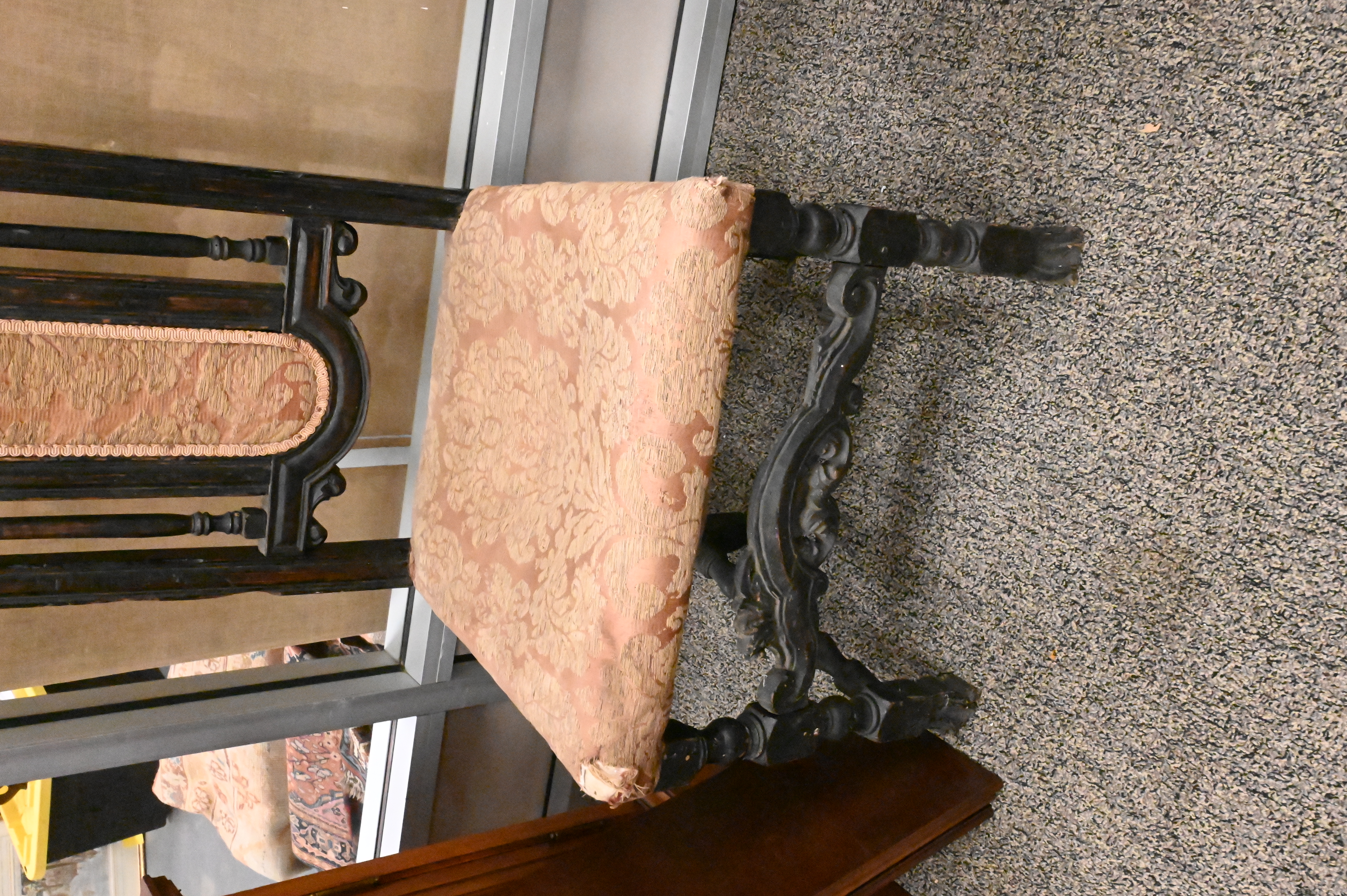having open carved back and front stretcher, set on Spanish feet, likely late 17th century, (reinforced back)