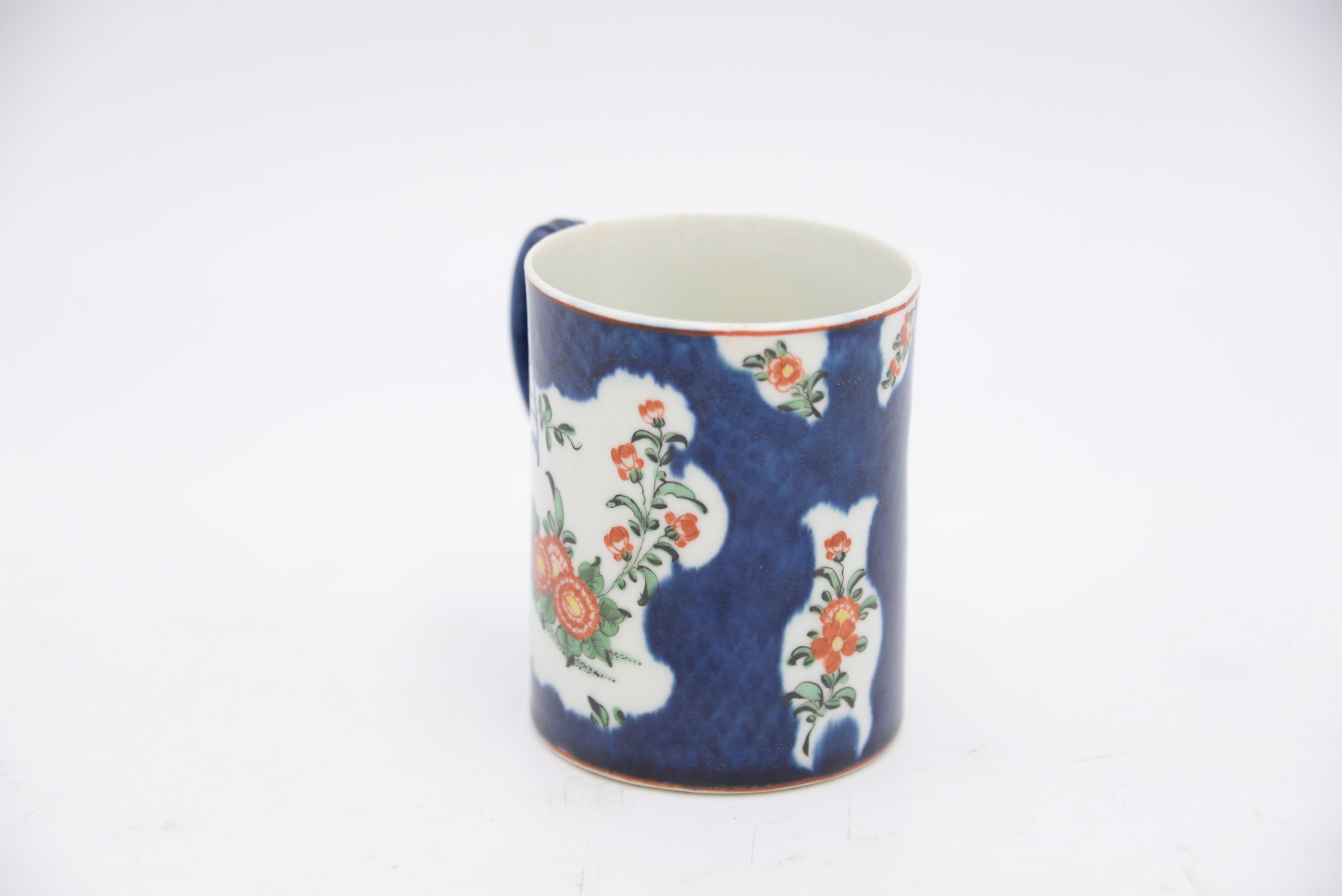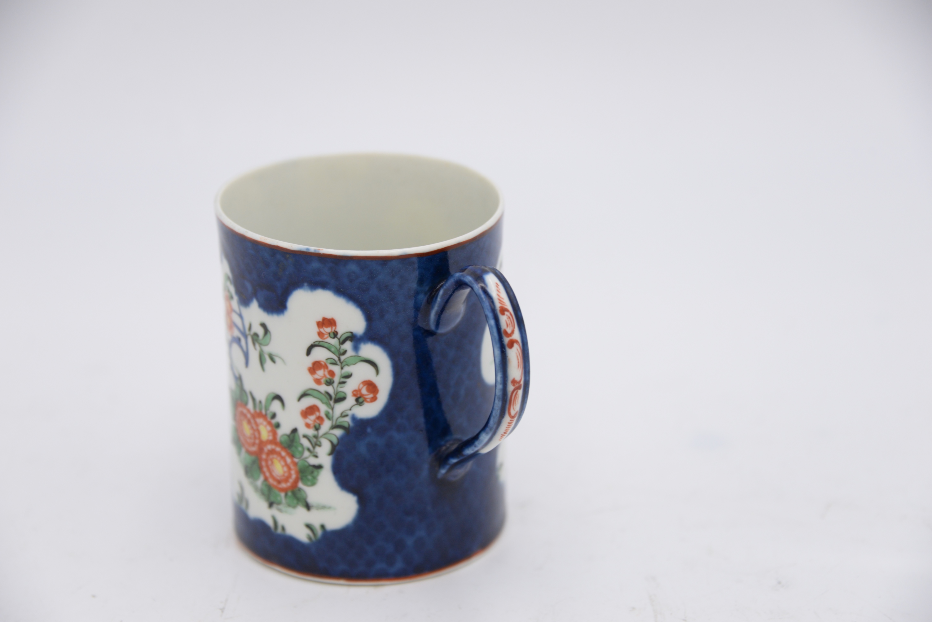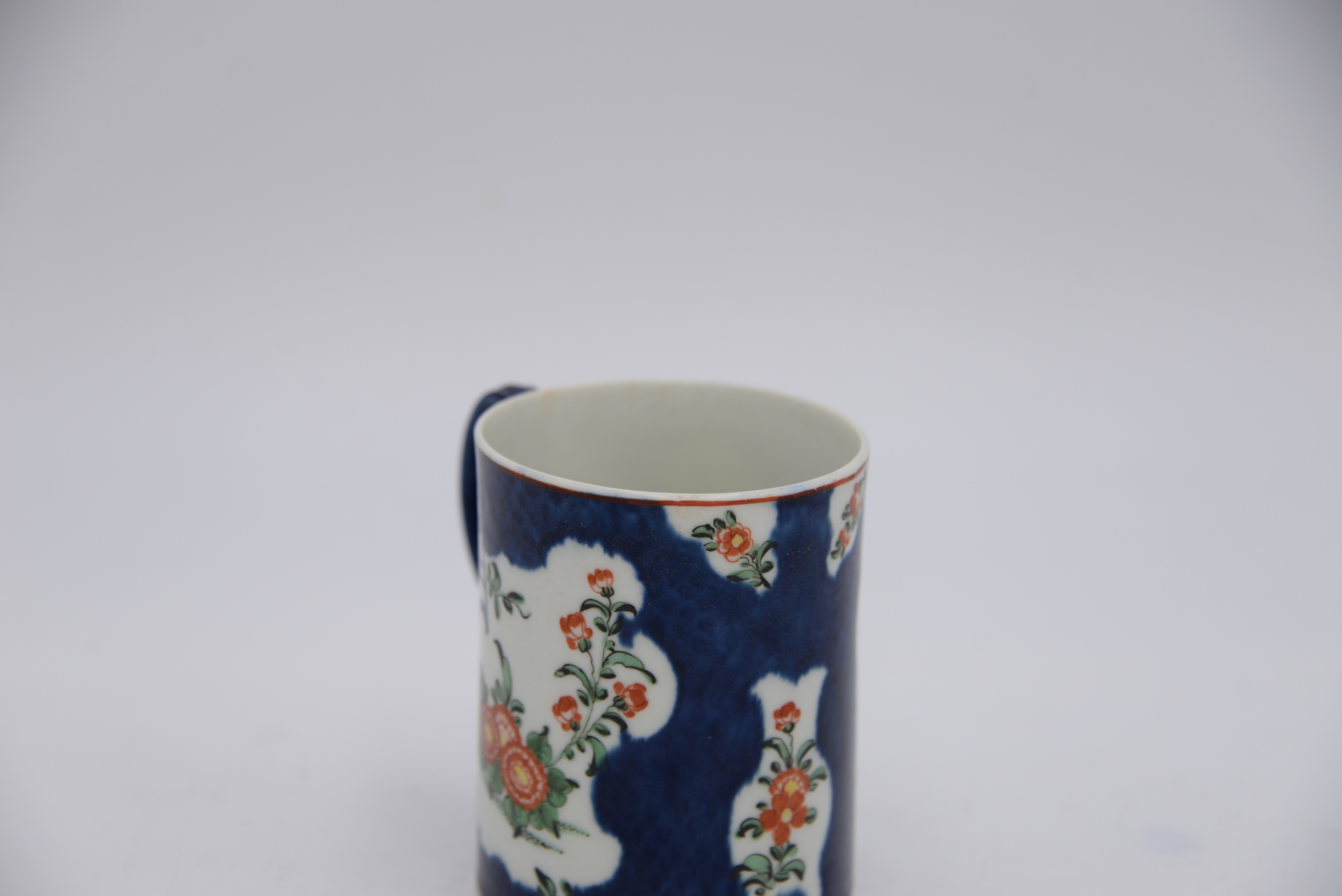 Worcester Blue-Scale-Ground Porcelain Mug, 18th century, painted in the Japanese taste with iron red and yellow flowering shrubs, blue square seal marks, height 3 1/2 inches.