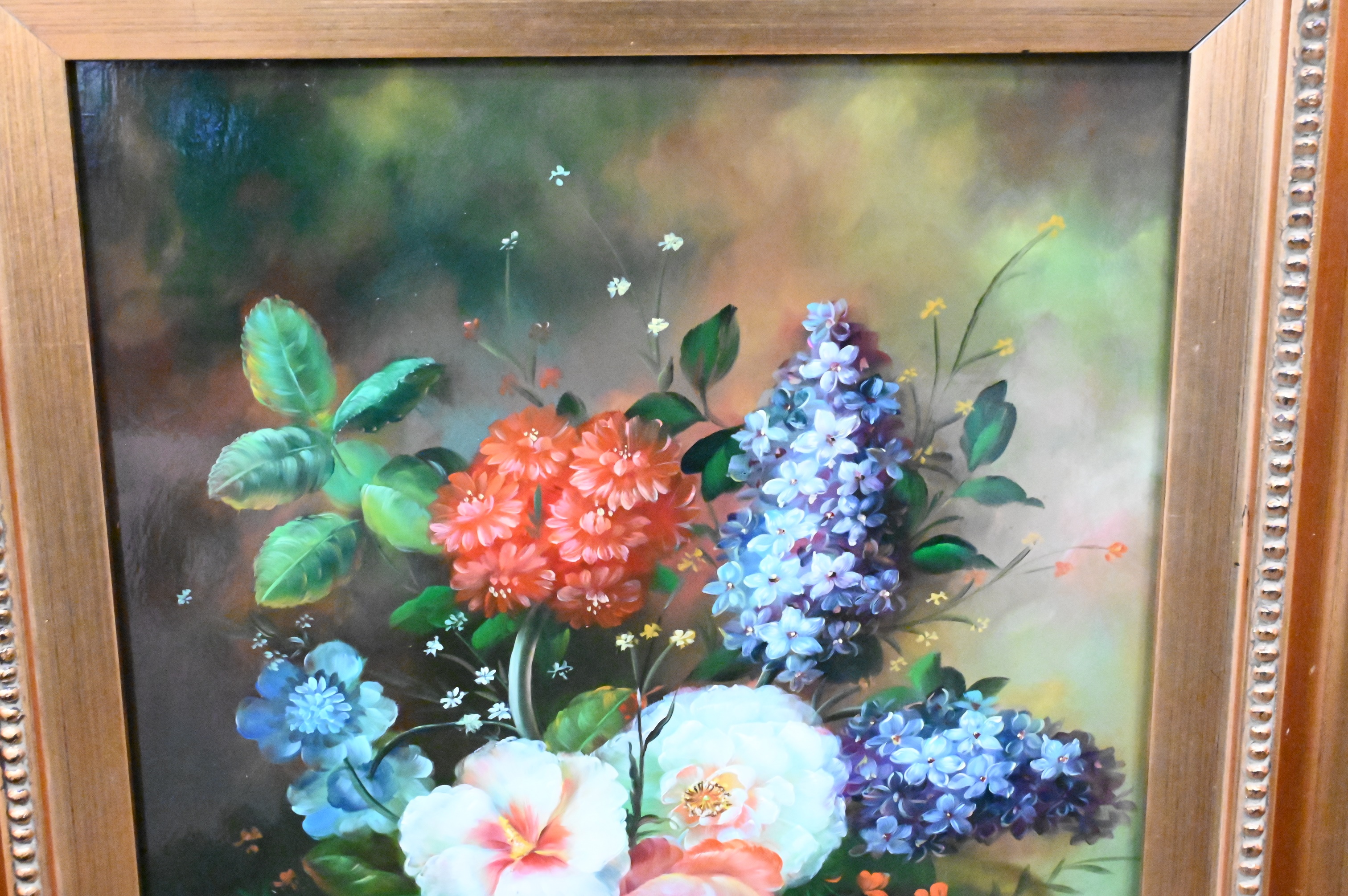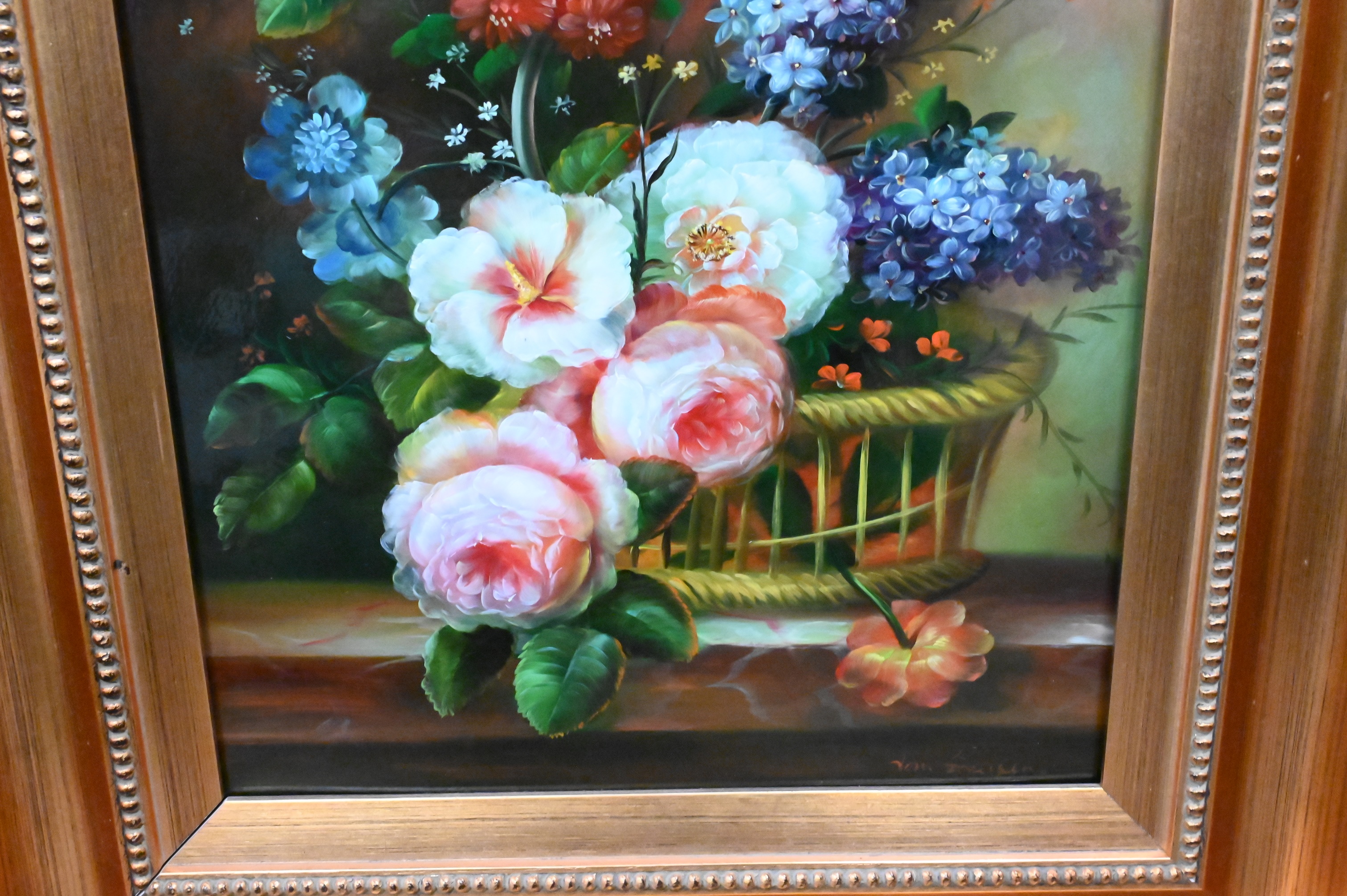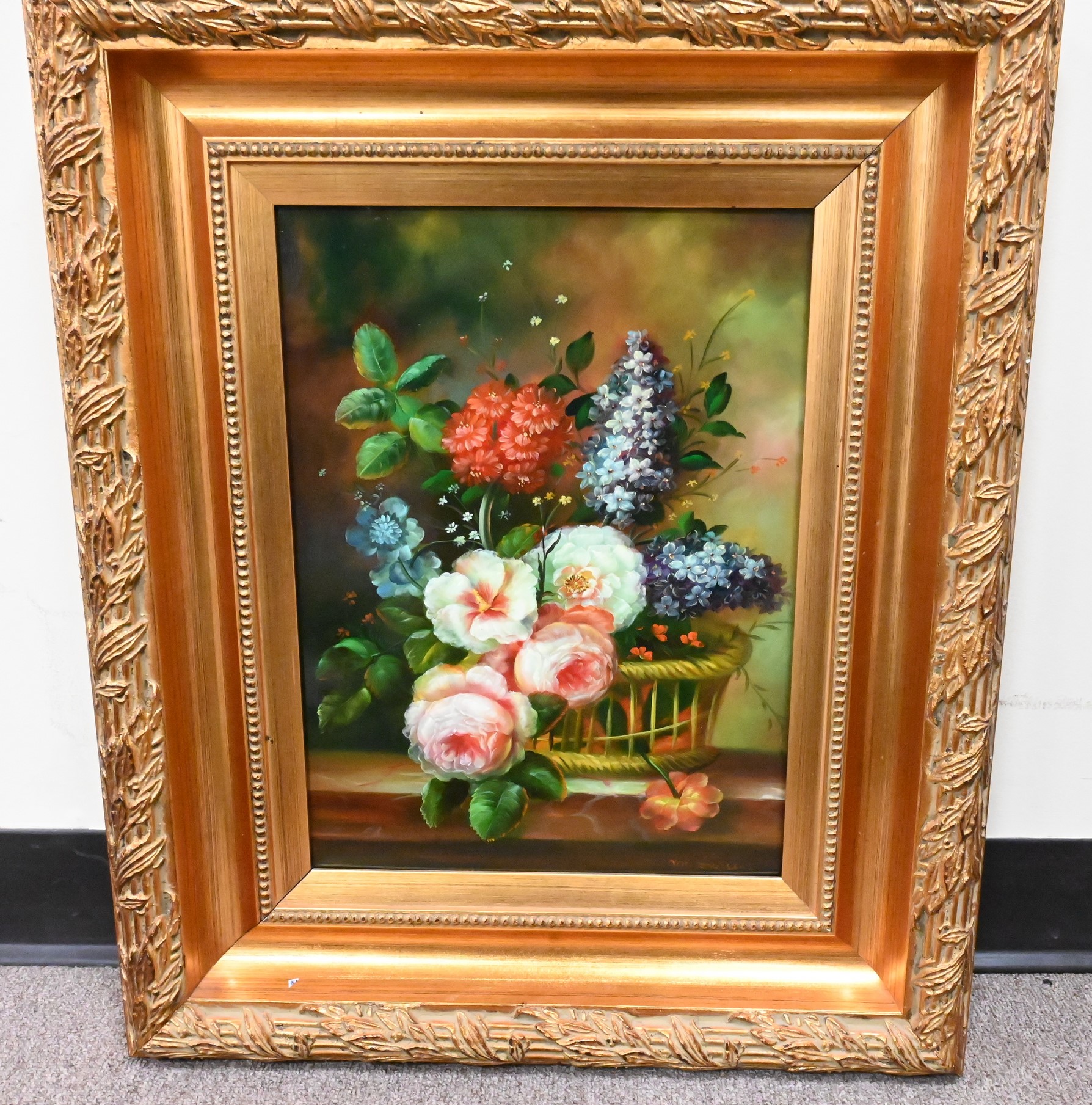 Still Life of Roses and lilacs in a basket