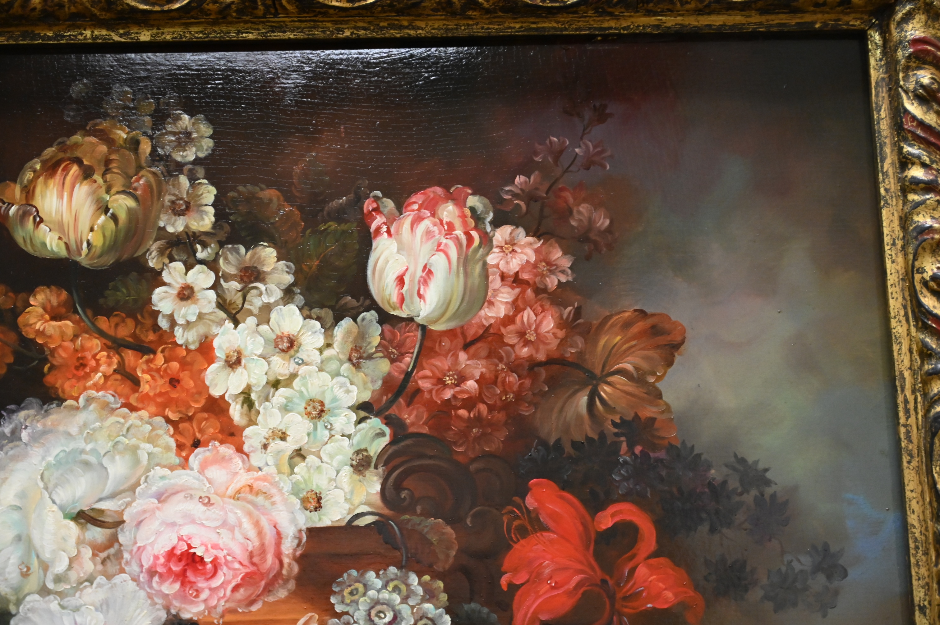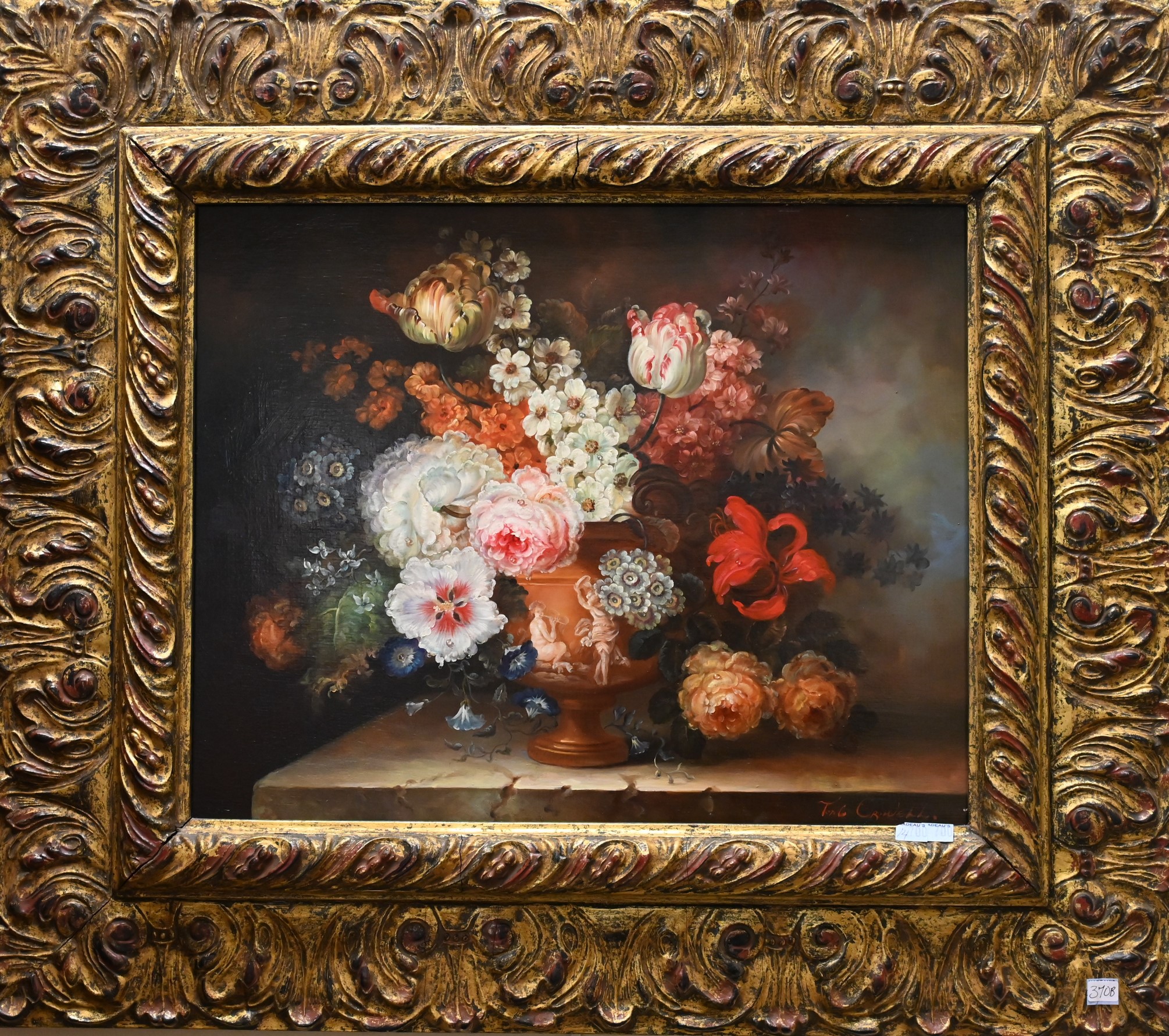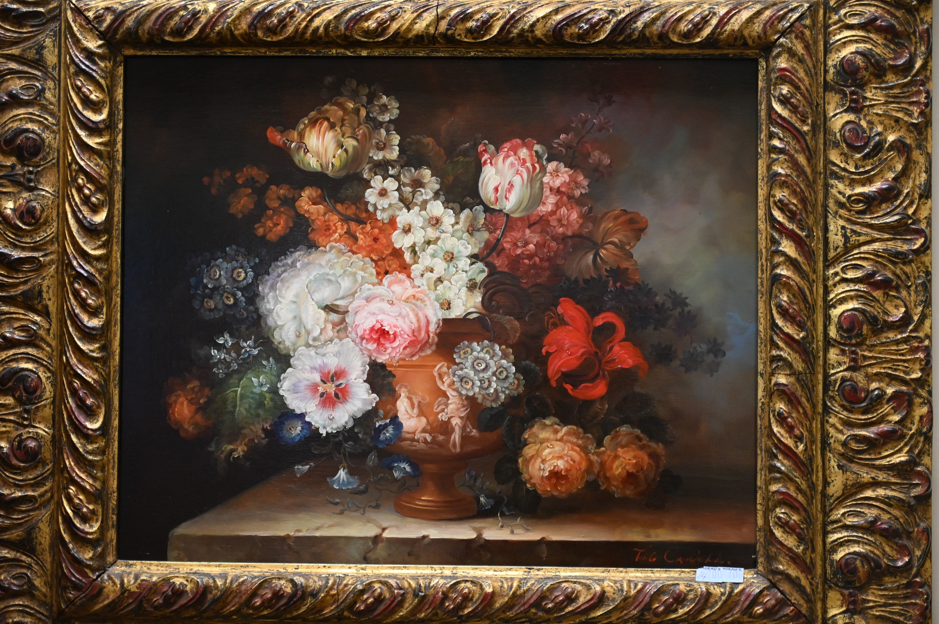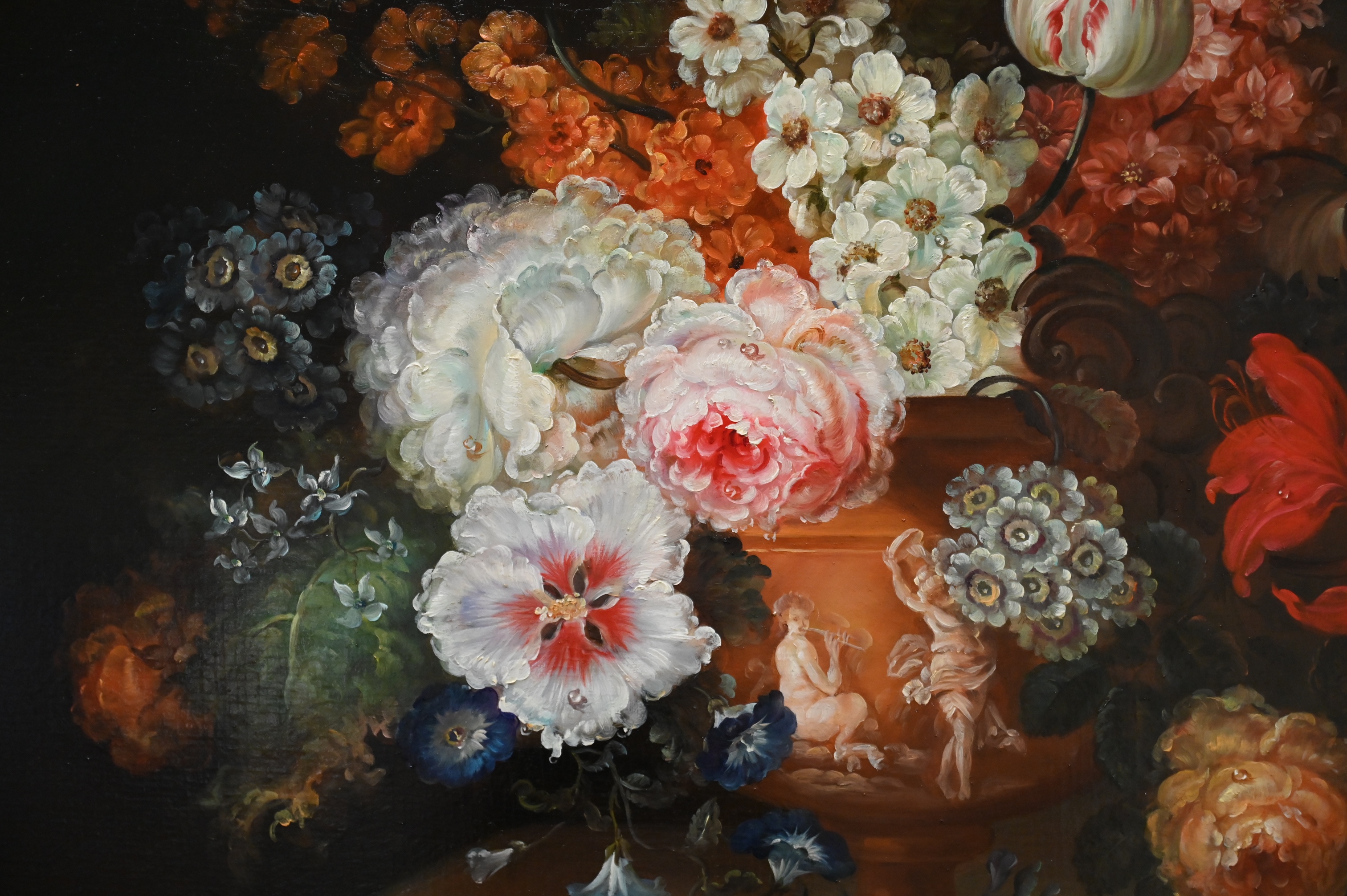 Still life with tulips and roses in a figural vase