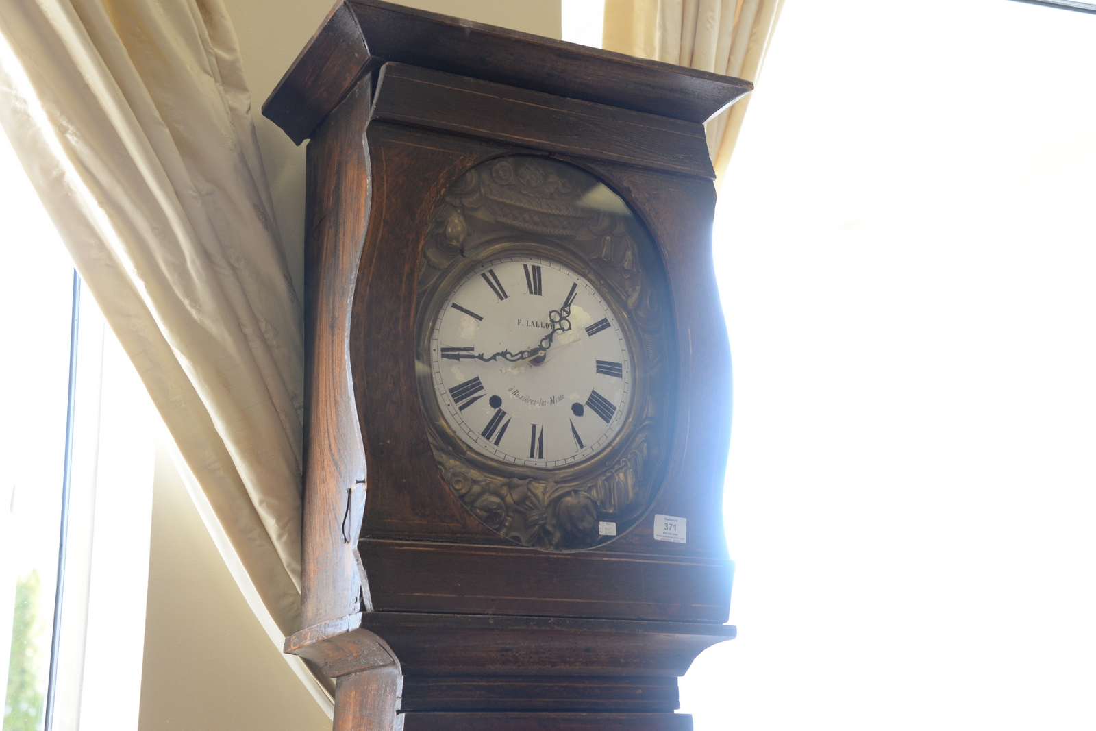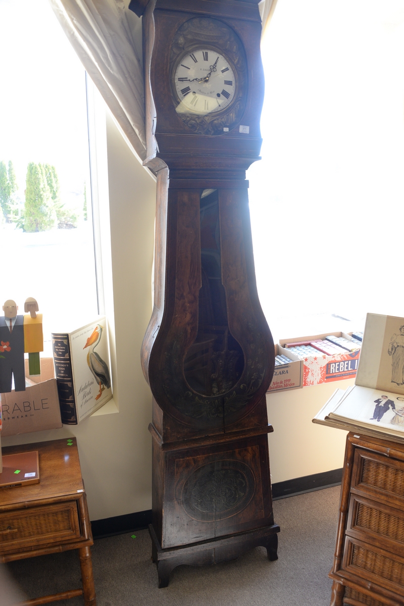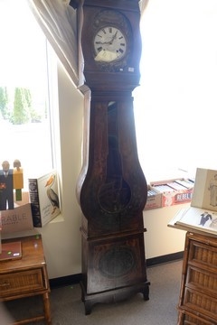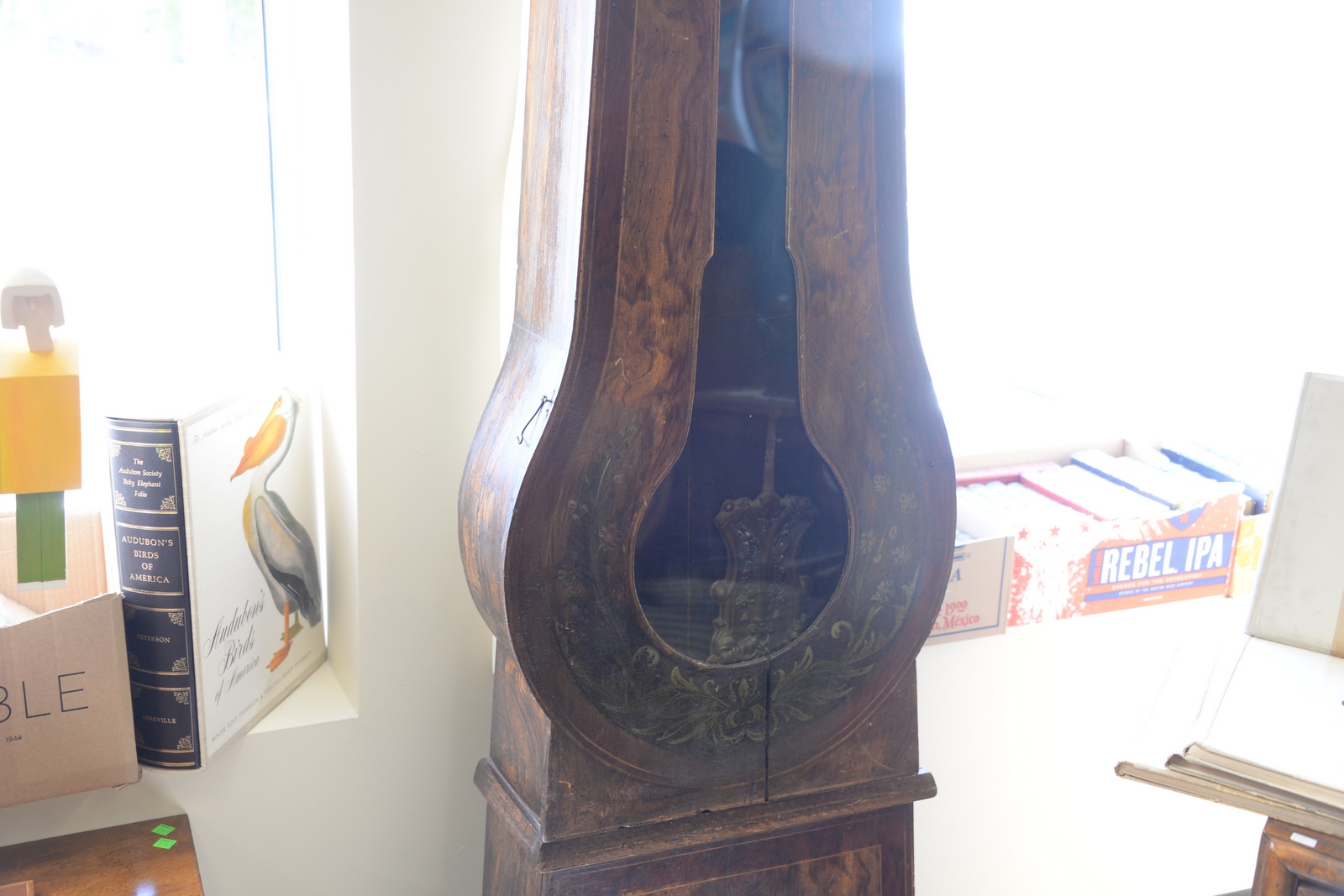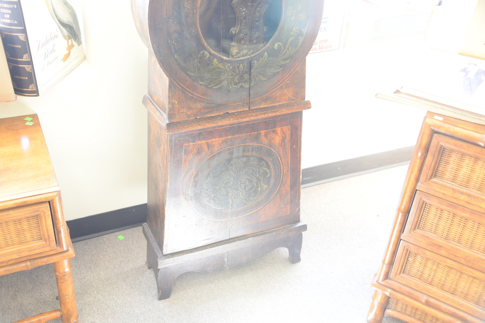 Continental tall clock with paint decorated case and embossed brass pendulum. ht. 90in.