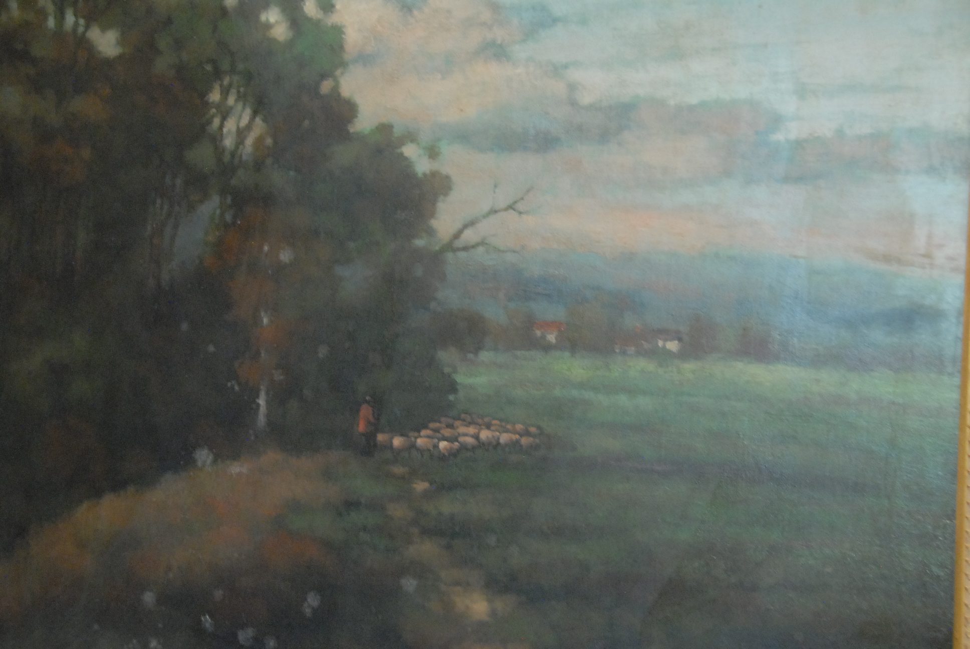 Decorative oil on canvas of sheep and shepherdess.ht. 43 1/2 in. wd. 35 1/2 in.