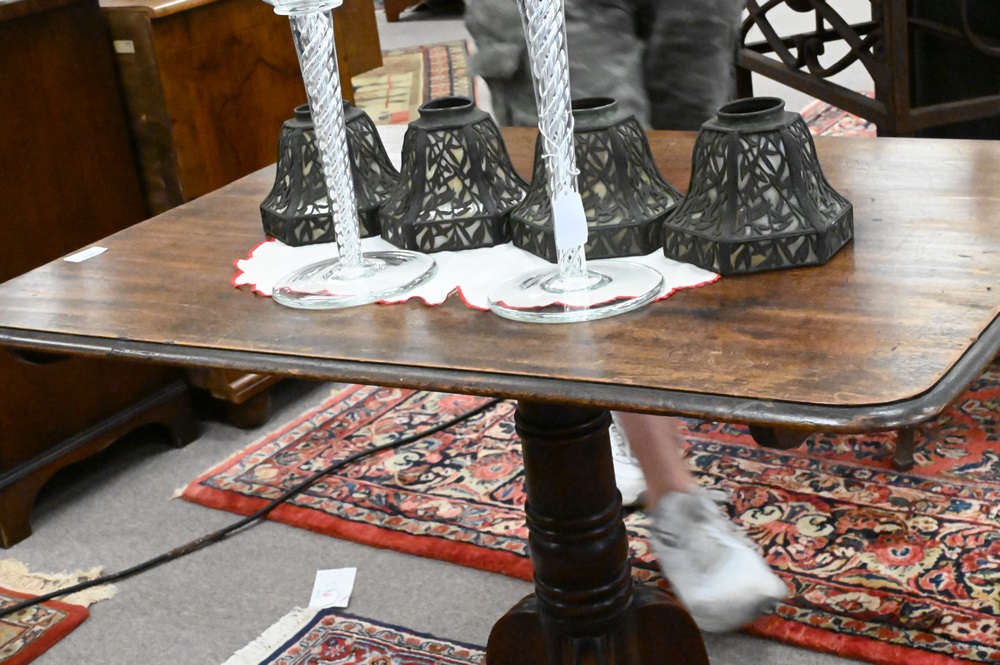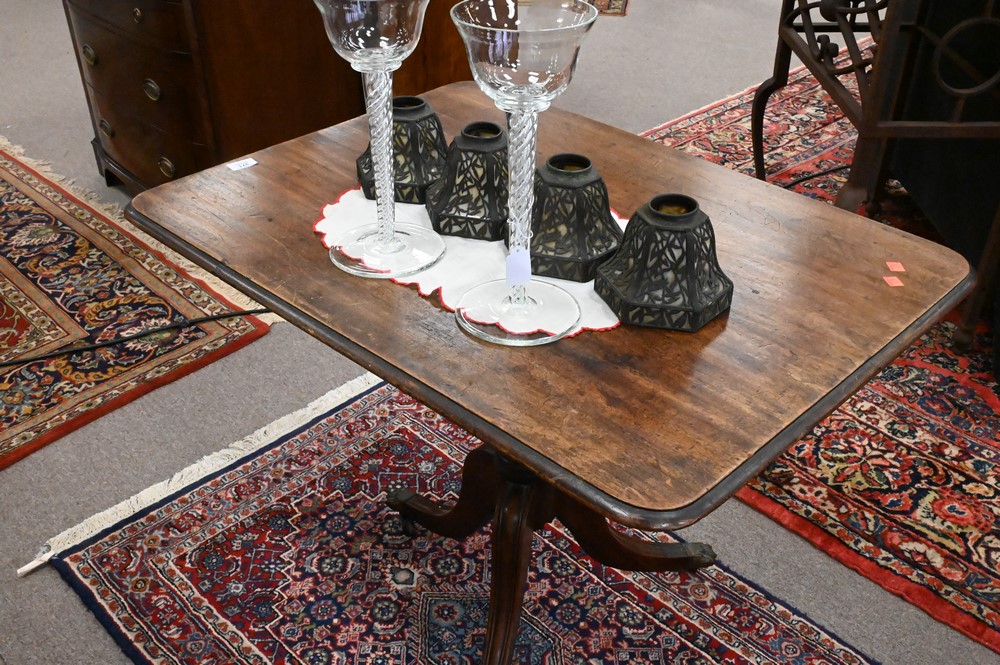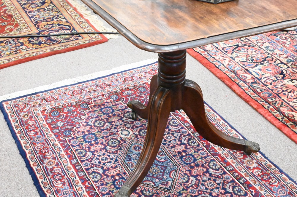 English Mahogany Breakfast Tip Table, on pedestal base, early 19th century, height 28 1/2 inches, top 26 1/2″ x 36″.