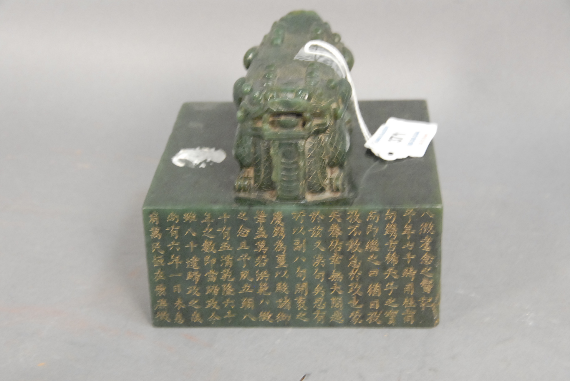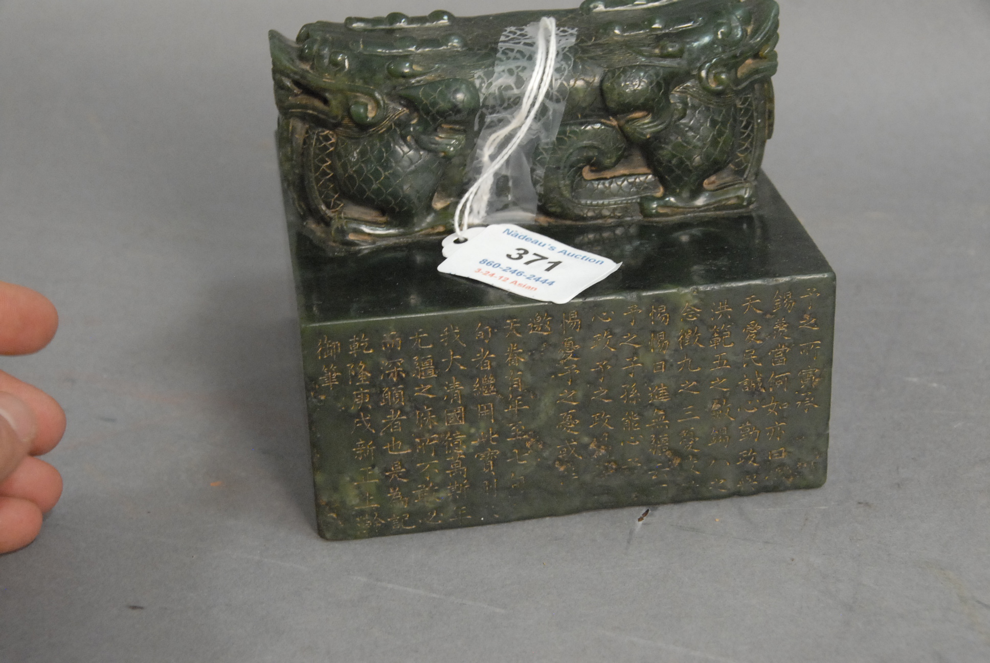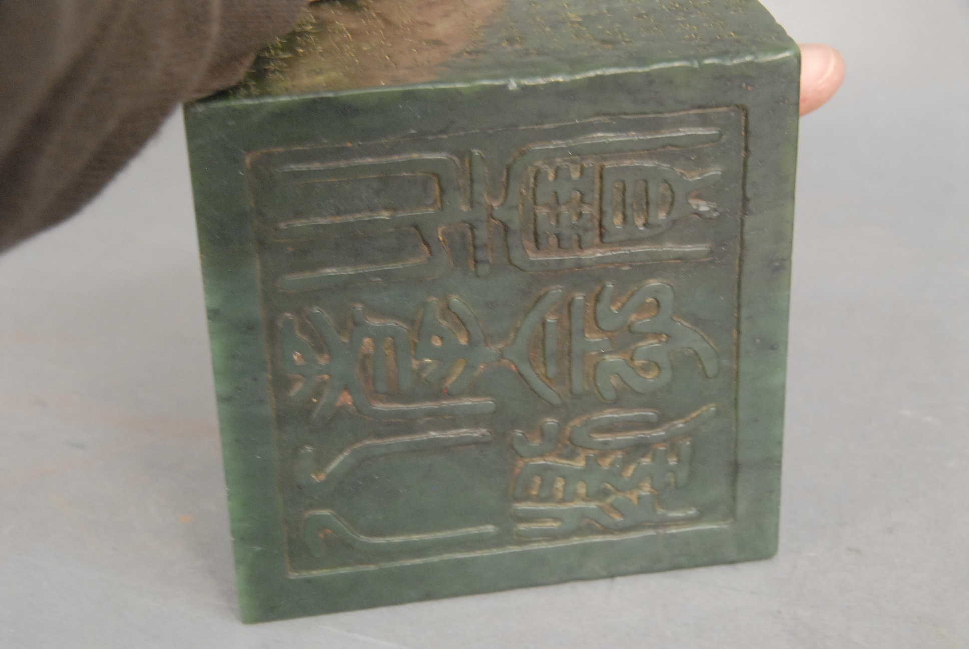 Large spinach jade square seal, solid square block having a large carved handle formed by a pair of addorsed dragons, square block having characters around all sides.ht. 4 1/2in., wd. 5in.