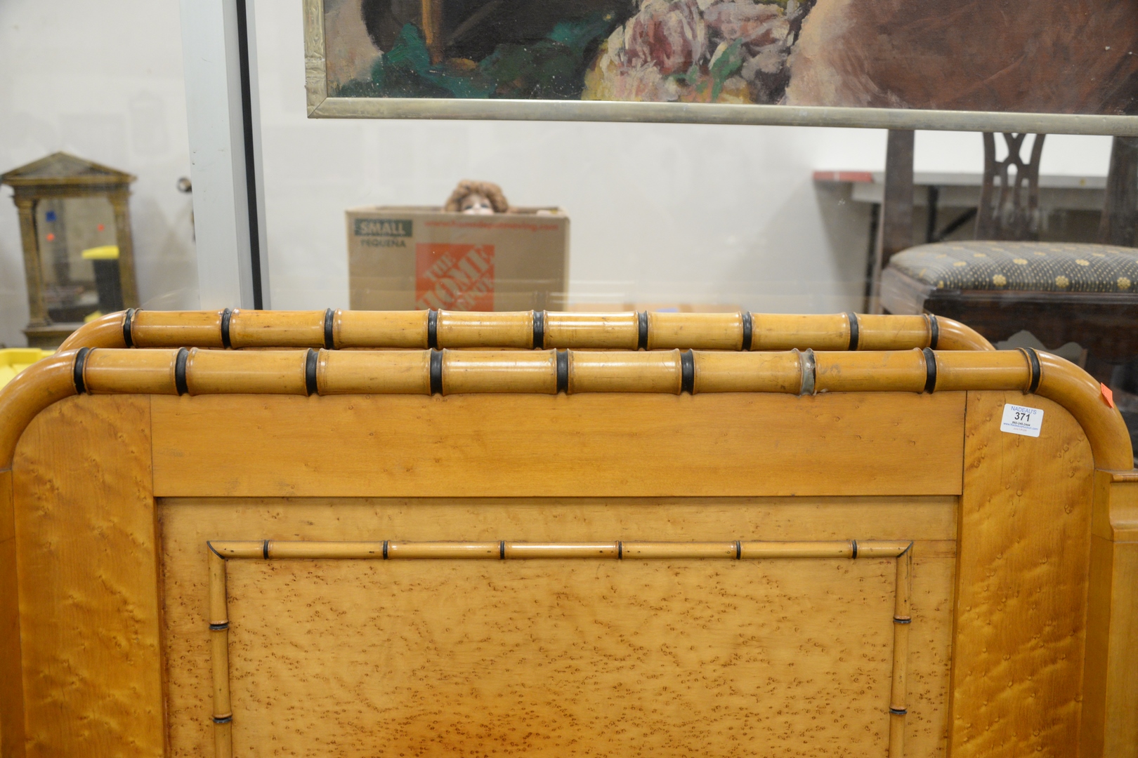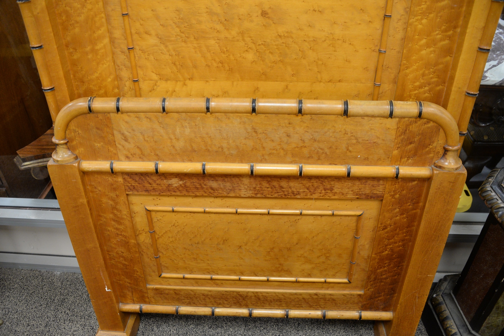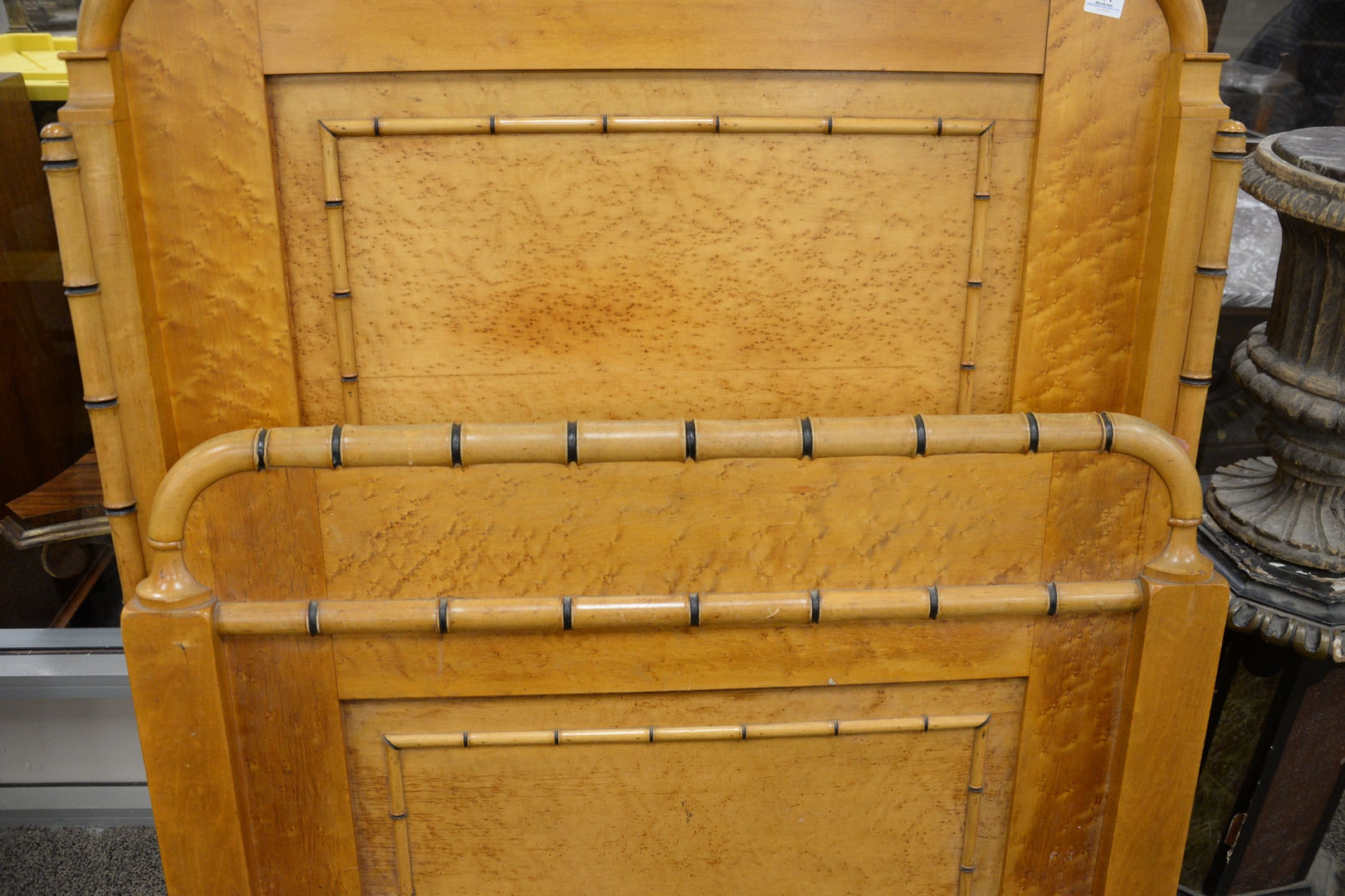 Lot 371: Pair of Faux Bamboo and Birdseye Maple Victorian Twin Beds, along with rails, attributed to Horner, height 55 inches.