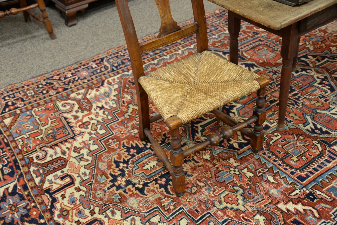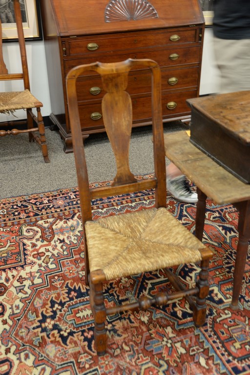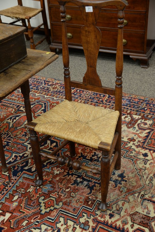 Pair of Queen Anne side chairs with vasiform splat and rush seats on turned legs with duck feet. ht. 41in., seat ht. 17 1/2in.