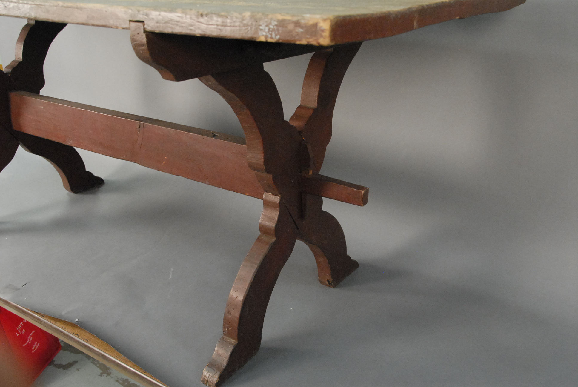 Lot 371: Sawbuck table, two board top on modified X scroll base with stretcher, old red paint over original red, possibly South Shore, Mass top in scrubbed finished. ht. 29 1/2in. top: 33 x 70 3/4