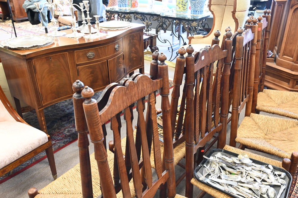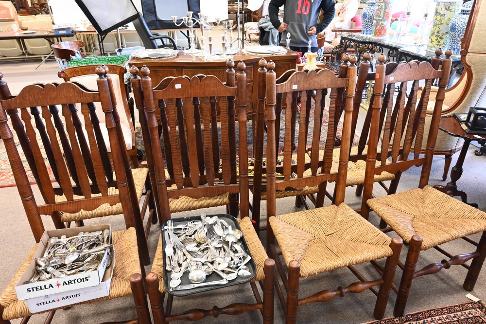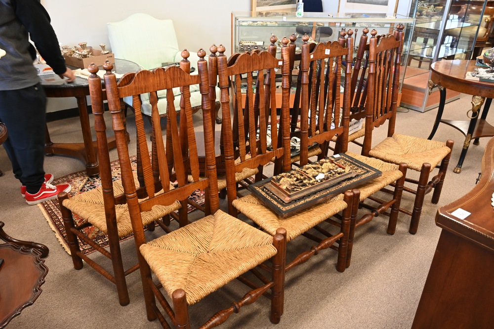 Lot 371: Set of Eight Tiger Maple Custom Bannister Back Side Chairs, having rush seats, height 45 inches, width 20 inches, (maker unknown).