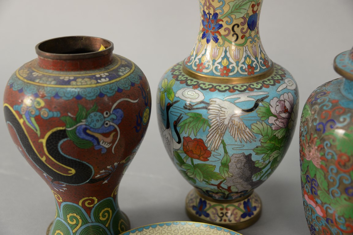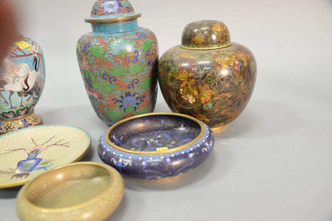 Seven cloisonne pieces to include vase with flowers and cranes, enameled wild flower and lotus cover urn, enameled tea box, five claw dragon vase, two small bowls, and a plate.