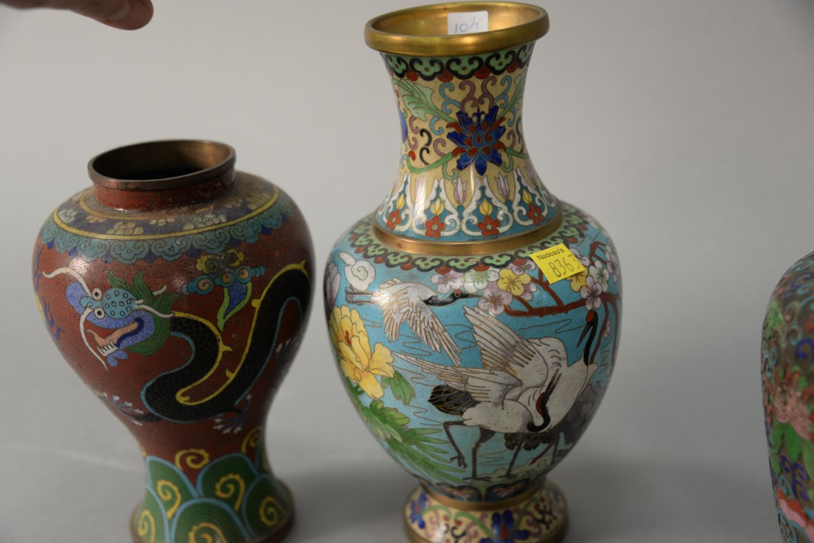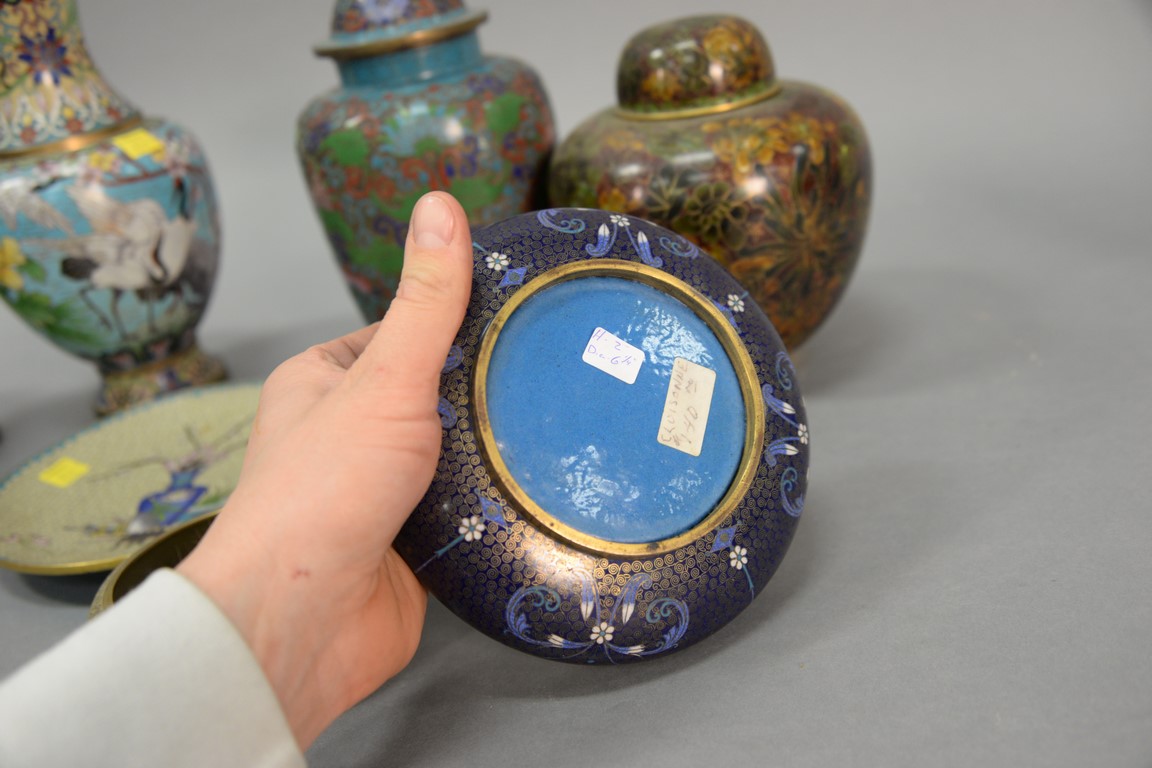 Lot 371: Seven cloisonne pieces to include vase with flowers and cranes, enameled wild flower and lotus cover urn, enameled tea box, five cla…