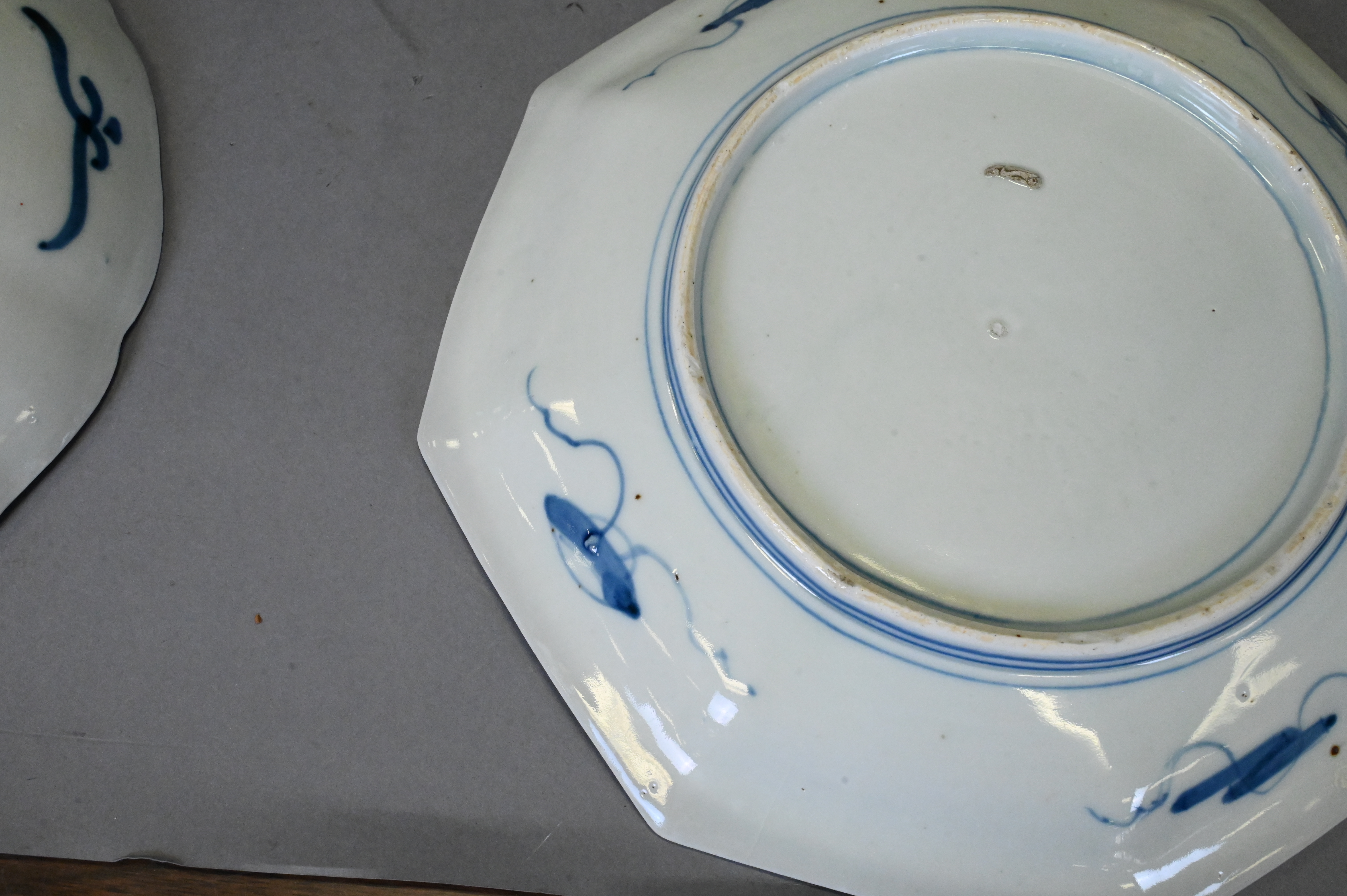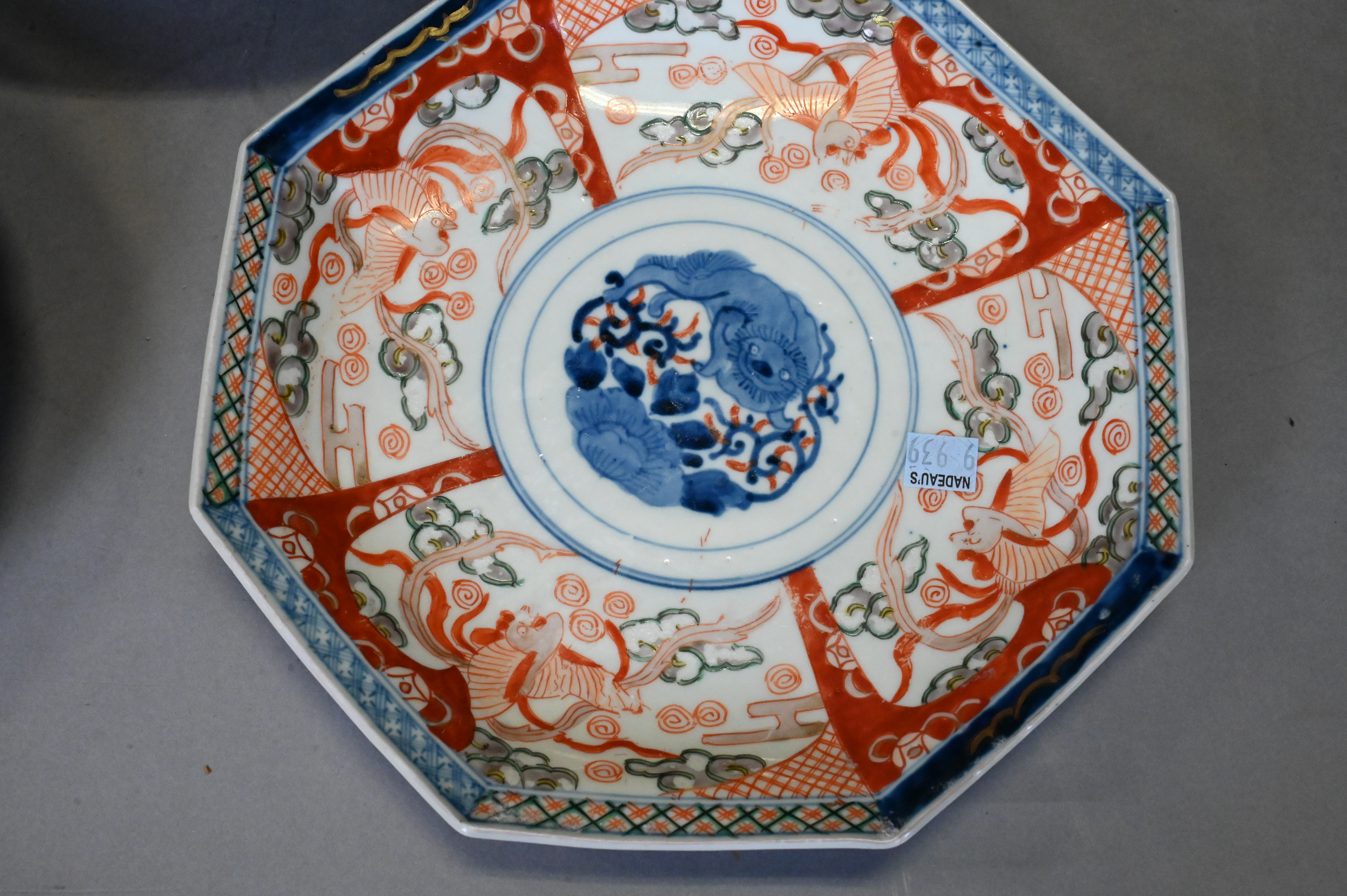 to include large platter having character marks to bottom, octogonal plate along with scallop edge plate, each in iron red, blue, and white with green accents and decorative cartouches