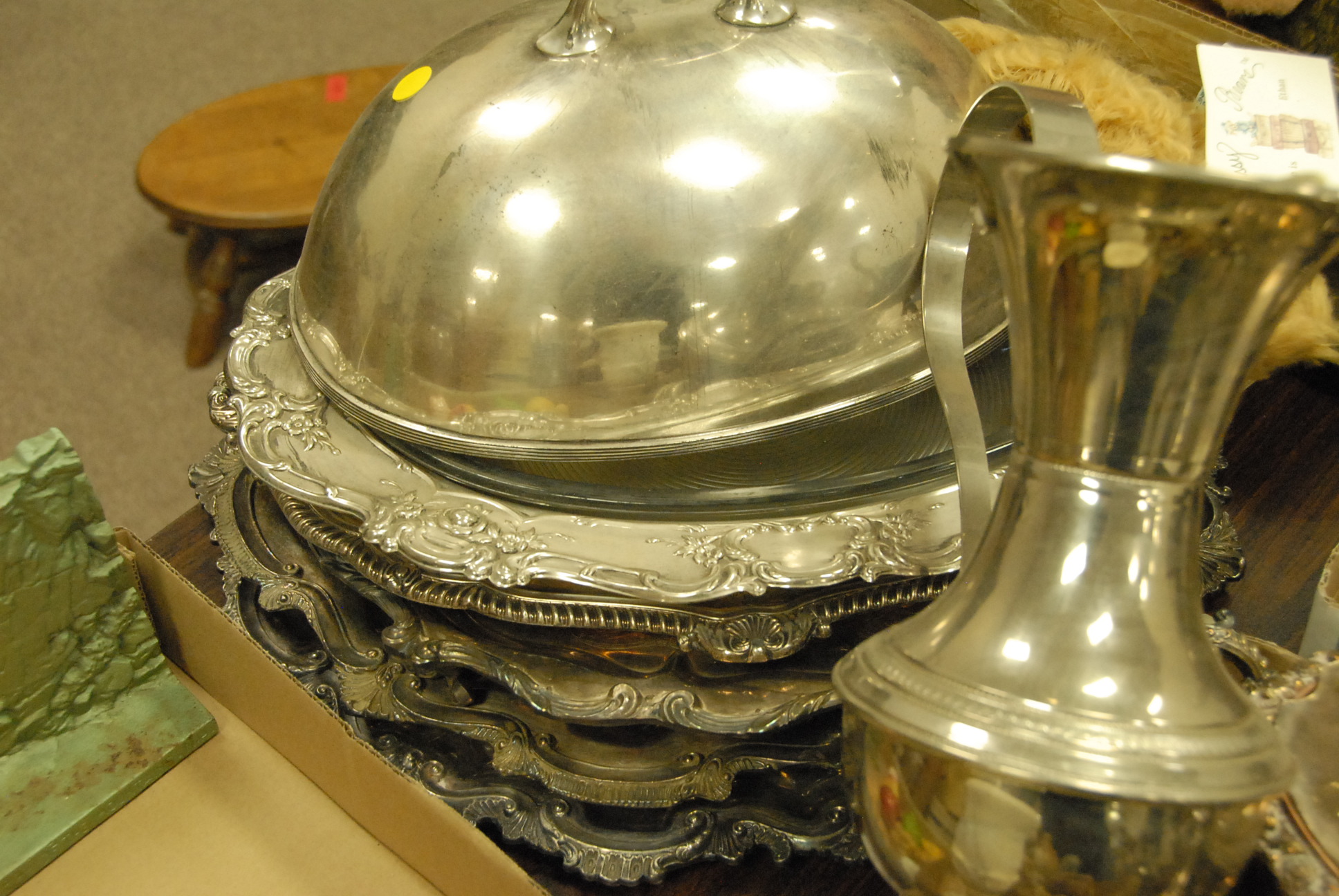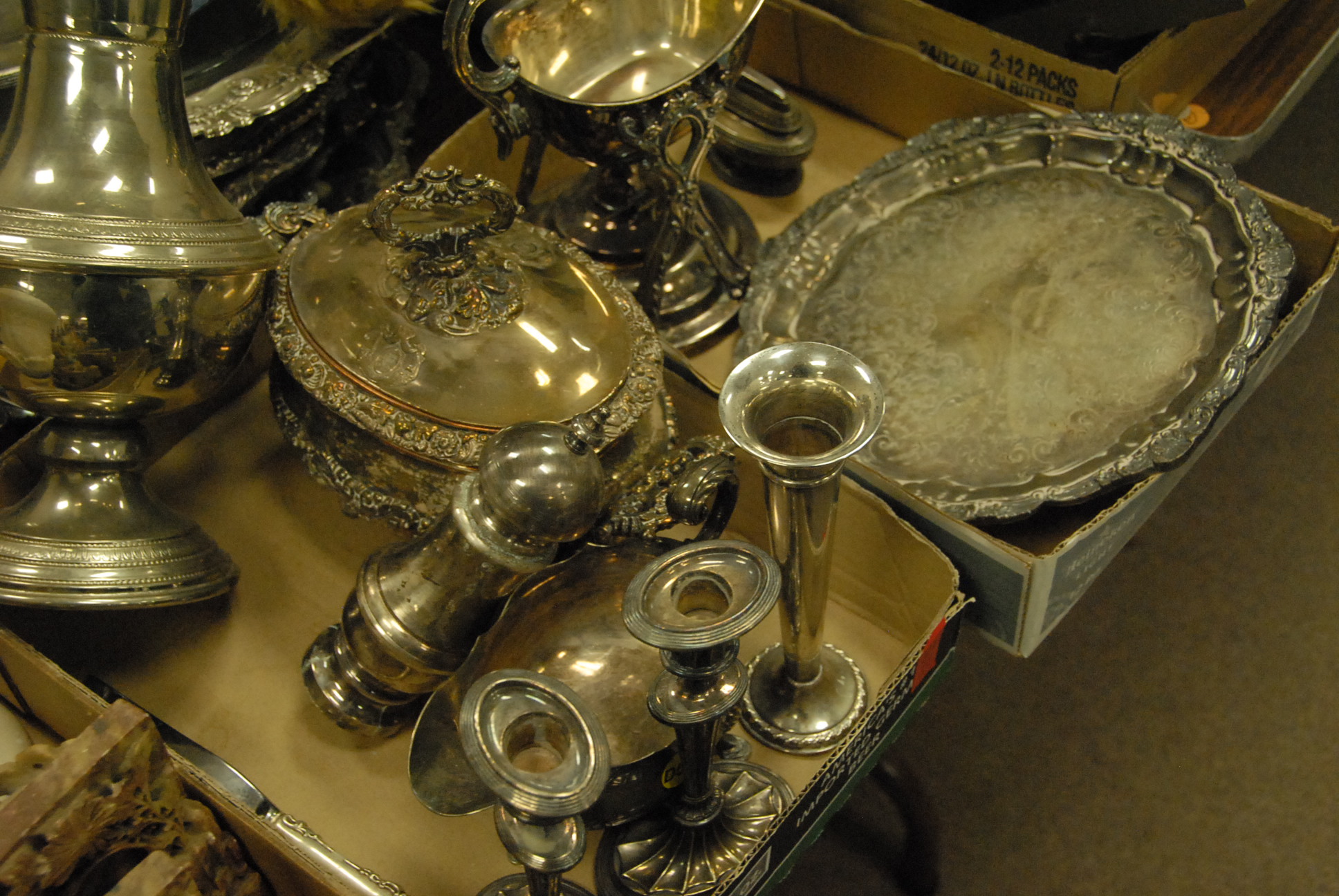 Three lots of silver plate to include a covered tureen, candlesticks, pitchers, trays, and miscellaneous
