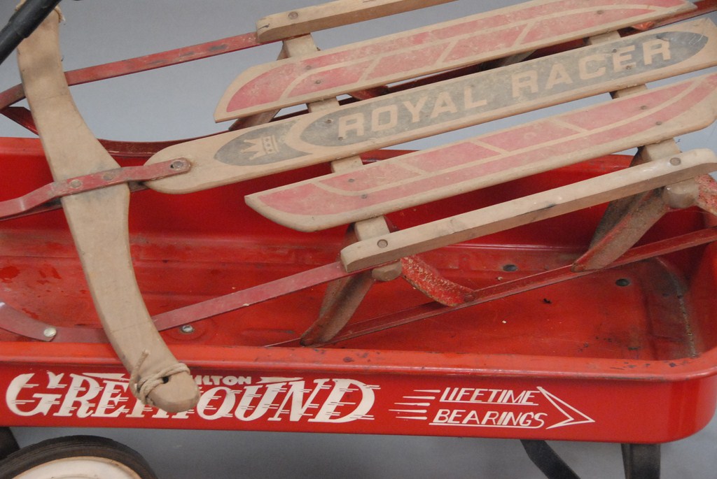 Three piece lot greyhound child’s metal wagon, sled, and pair of roller-skates.