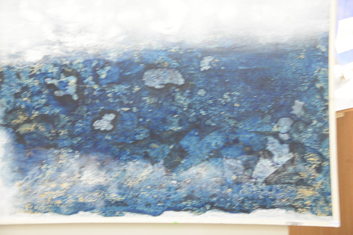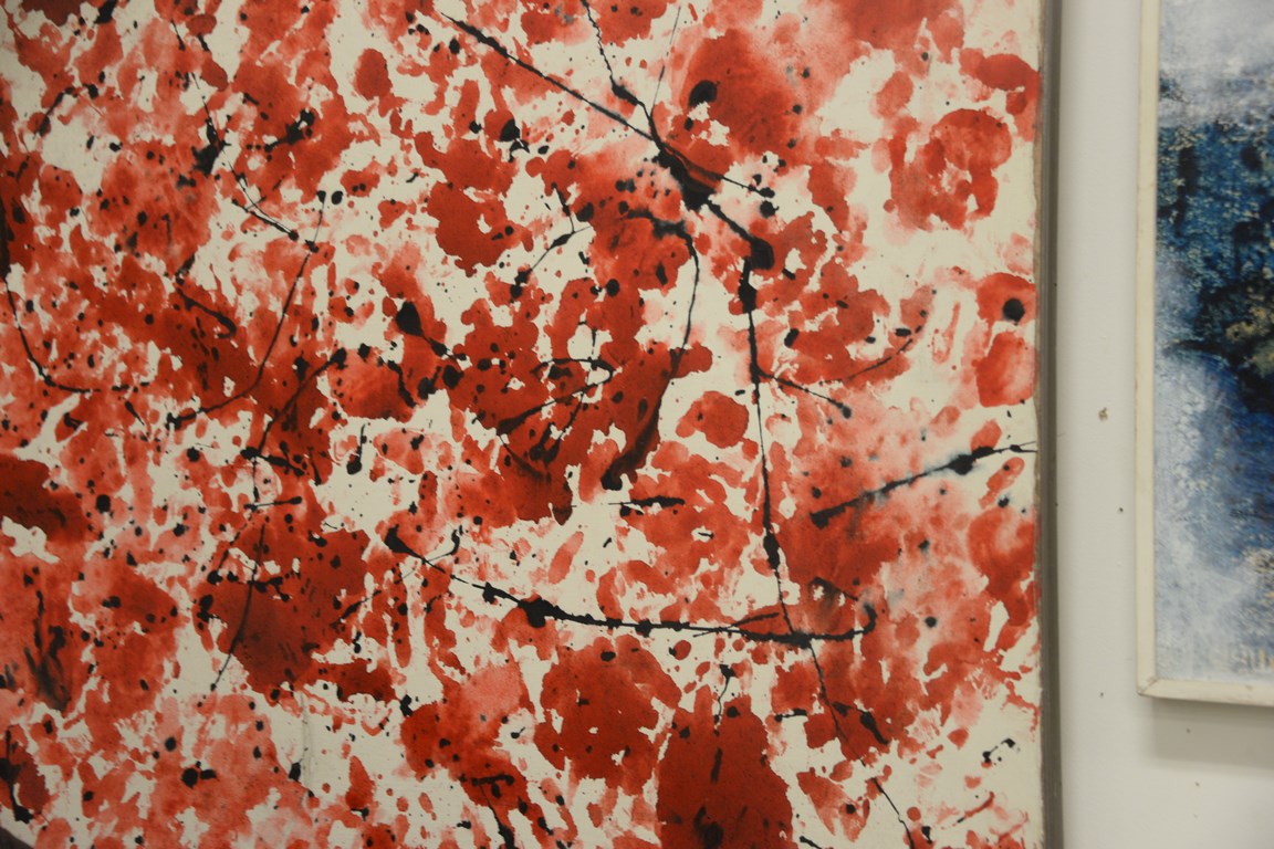 Two abstract paintings including Koo Stroo mixed media on paper mounted on canvas with Galleria George Lester label on reverse and signed on reverse Koo Stroo 61 along with an unsigned mixed media splash painting. 40 x 49 1/2 and 22 1/2 x 30 1/2