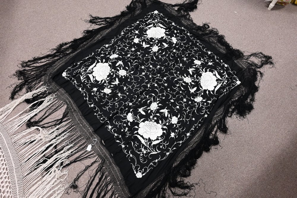 Lot 371: Two Silk Embroidered Piano Shawls, both black and white having flower motifs, 4′ x 4′ 3″ and 5′ x 5′.