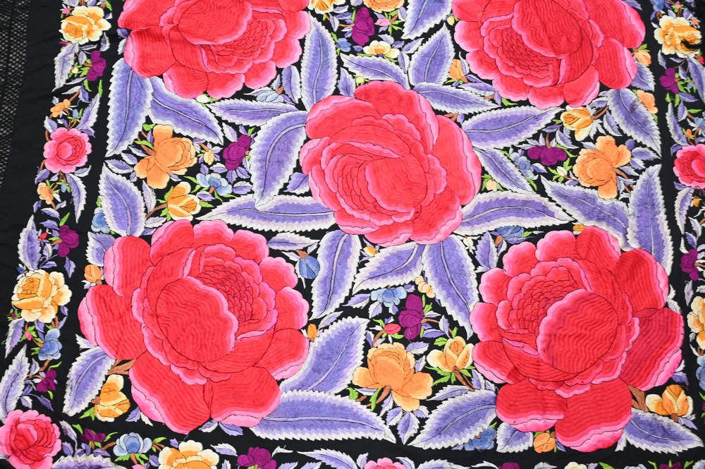 Lot 371B: Chinese Silk Embroidered Piano Shawl, black with large red flowers, approximate size 5′ 3″ x 5′ 6″.