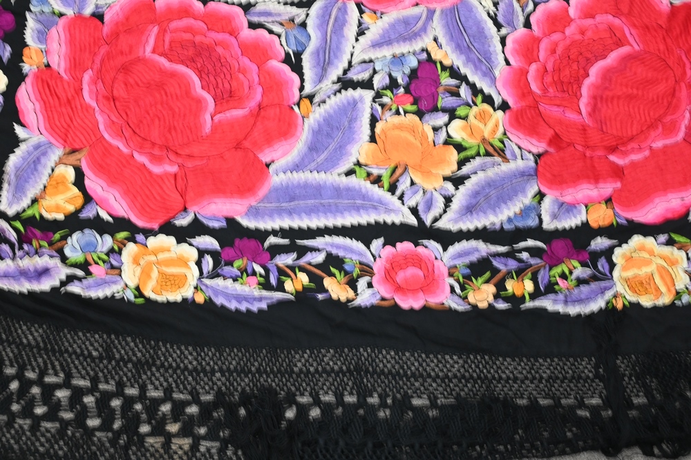Chinese Silk Embroidered Piano Shawl, black with large red flowers, approximate size 5′ 3″ x 5′ 6″.