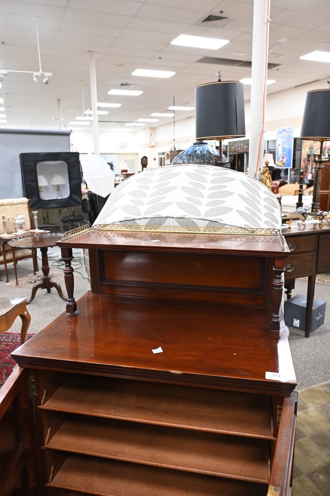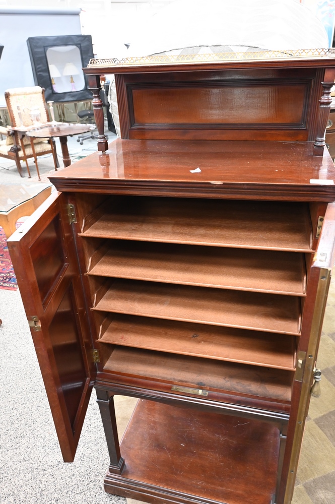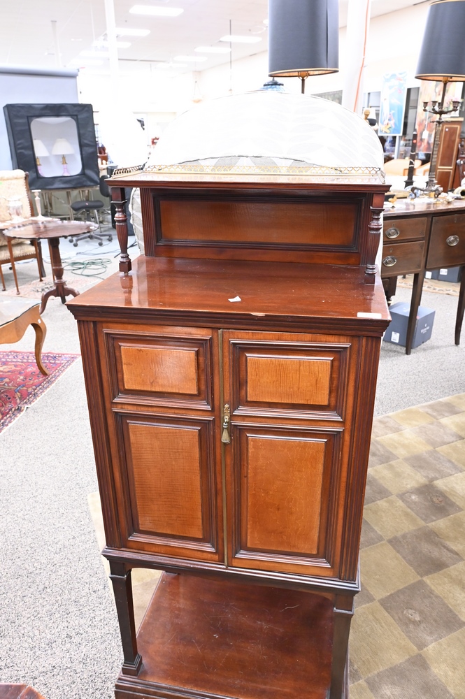 Lot 372: Collinson and Lock London Mahogany Cabinet, having shelf and satinwood door panels with fitted slide out interior drawers, signed on door with number 6145, height 51 inches, top 15 1/2″ x 22″.