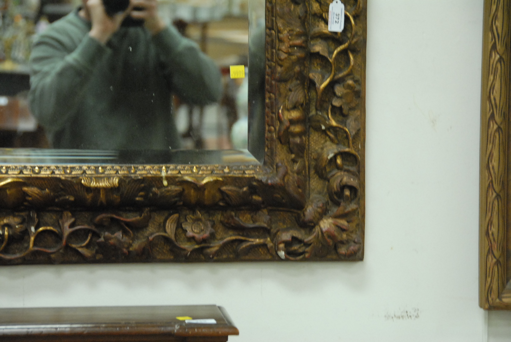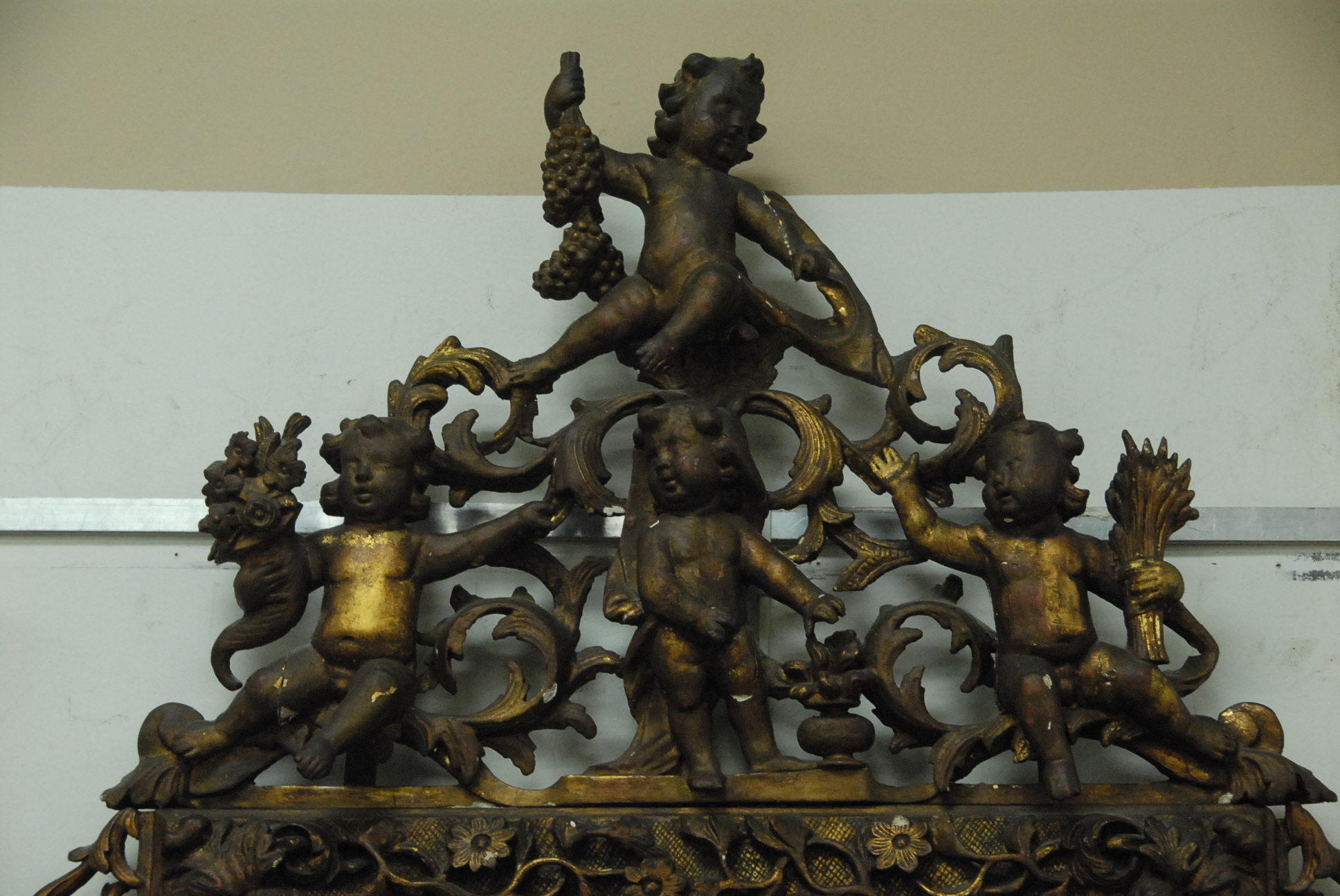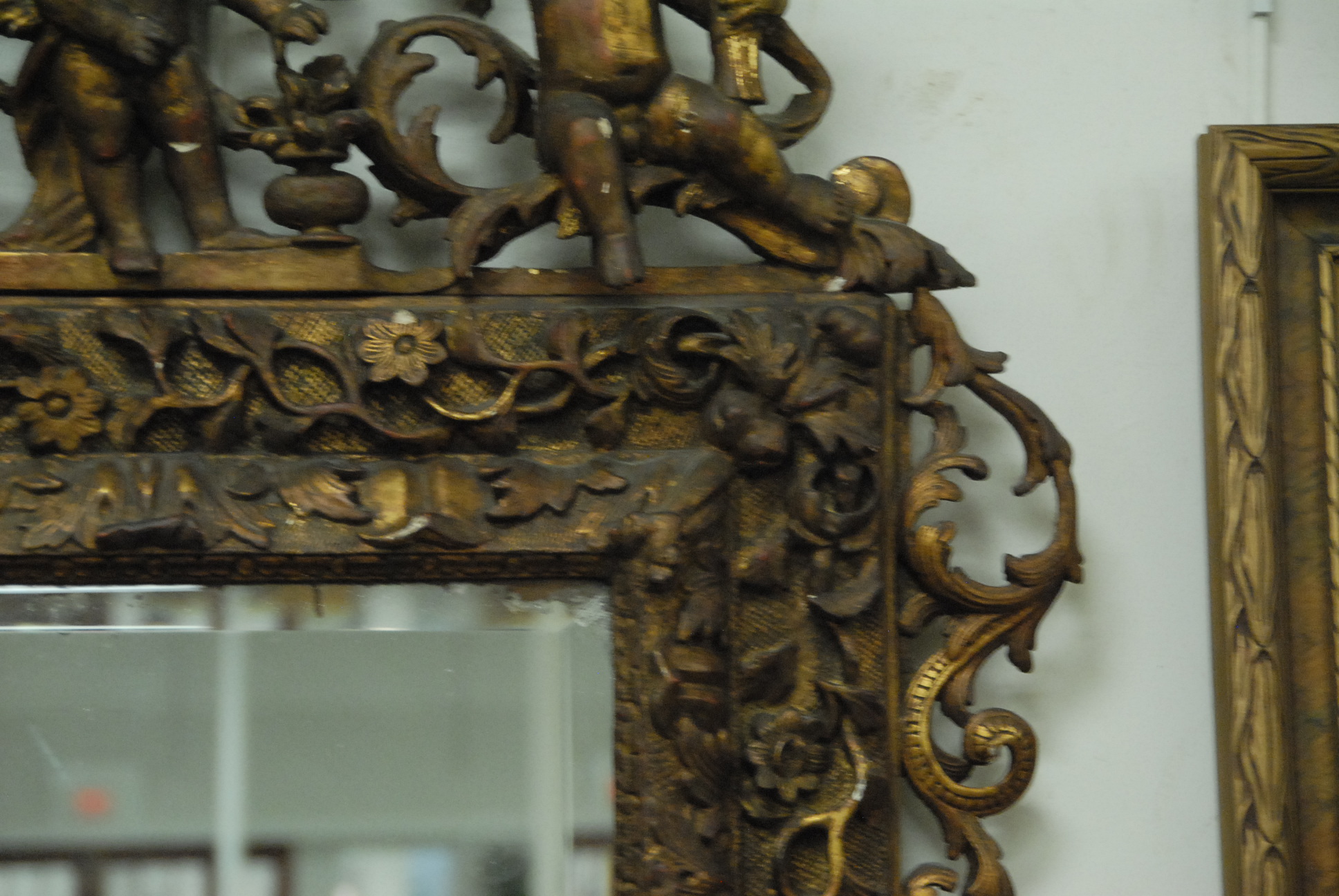 Lot 372: Continental Baroque gilt gesso and carved wood mirror surmounted by four putti, the frame with foliate decoration, 18th/19th century with later mirror plate. ht. 56in. wd. 38in.