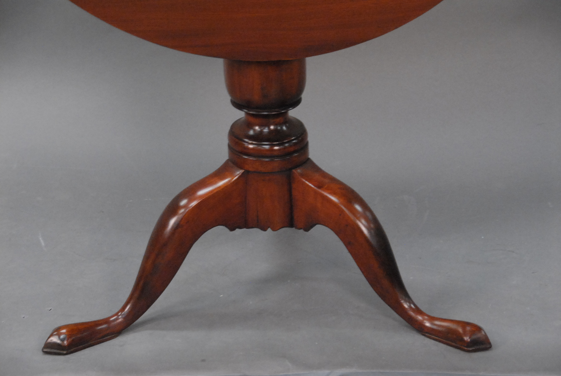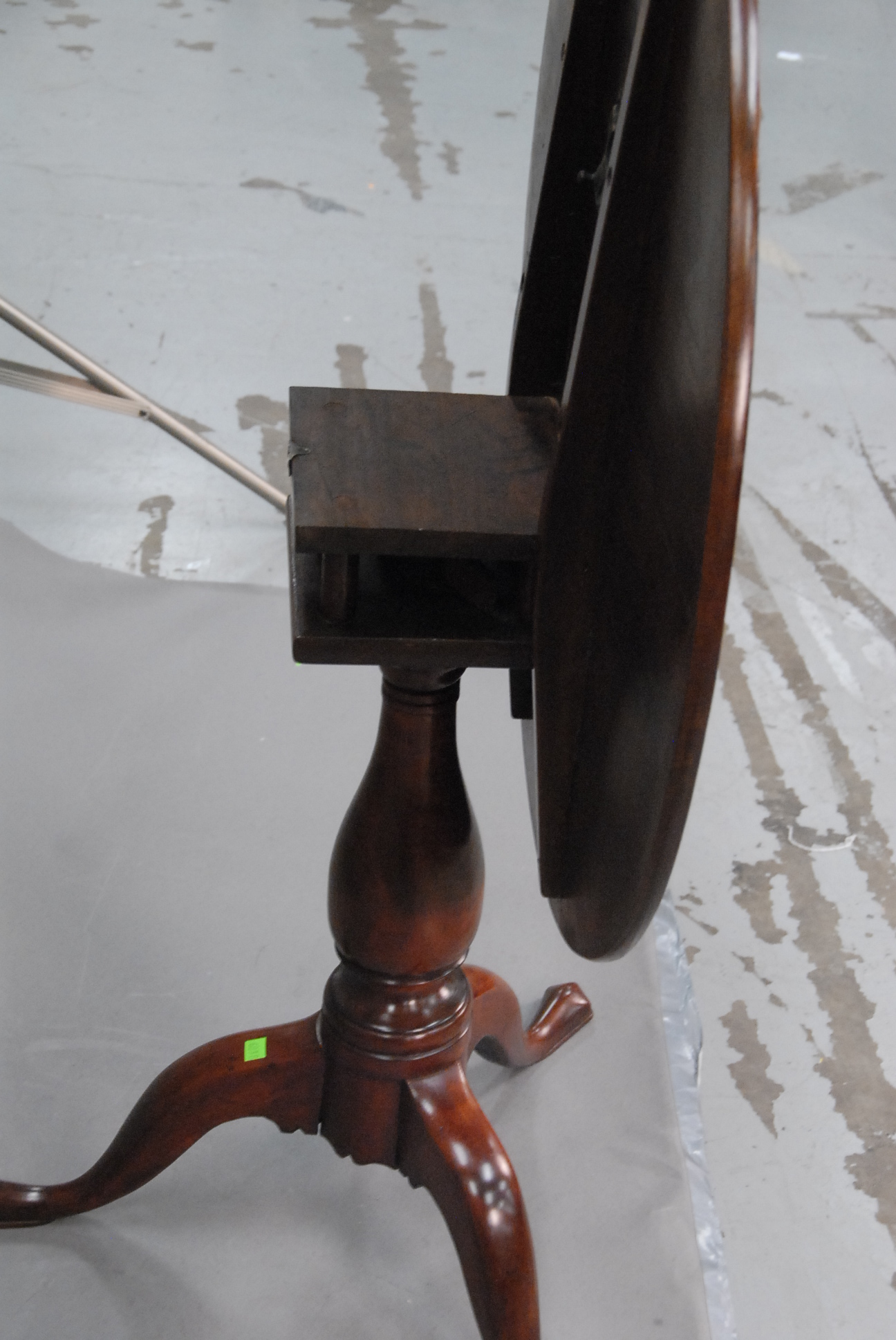 Federal mahogany tip table with round top on birdcage with turned shaft on tripod base.