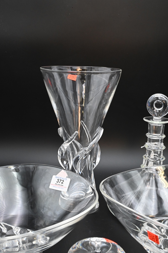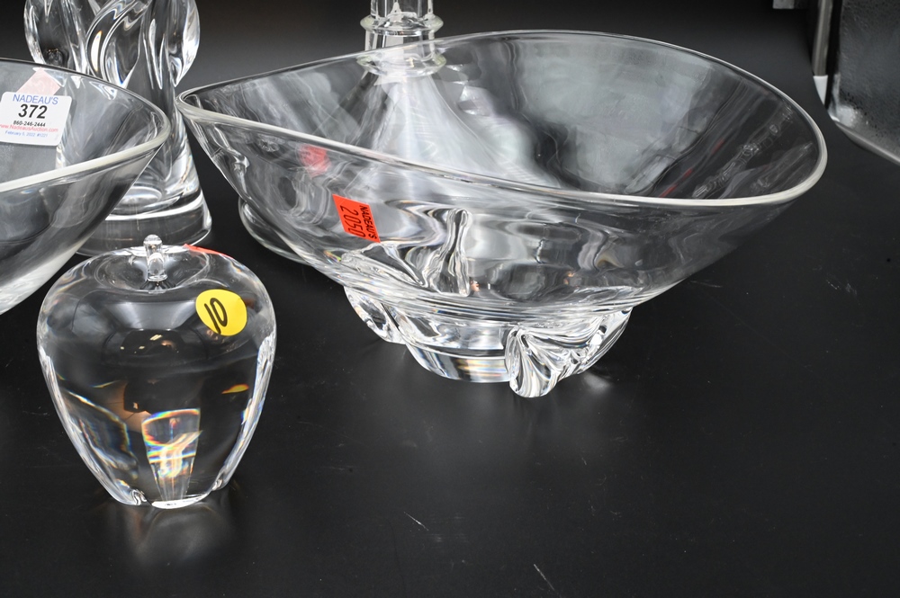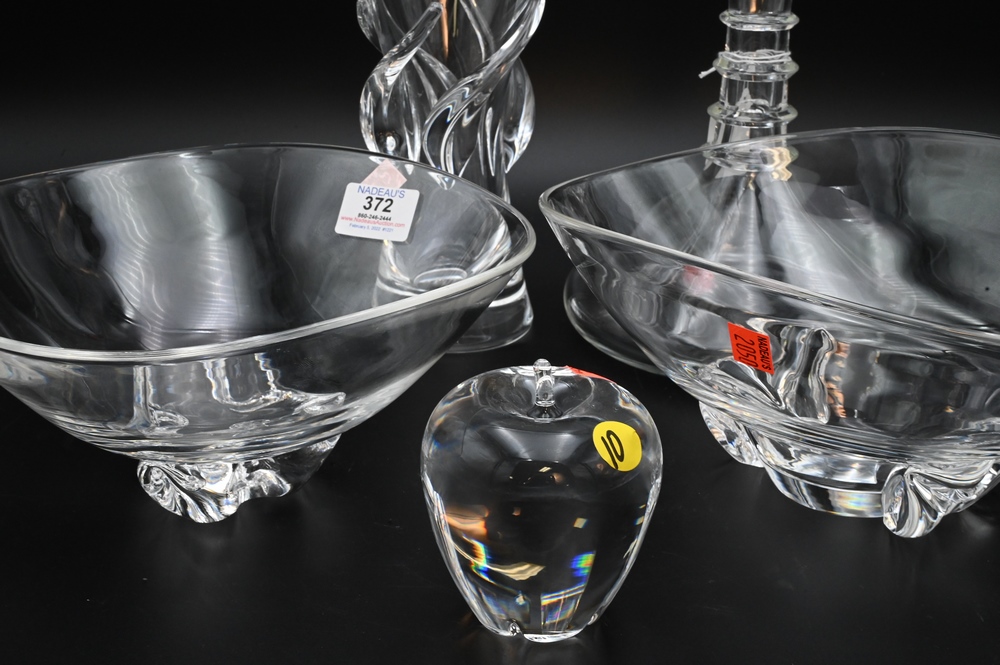 Lot 372: Five Piece Steuben Group, to include two large bowls, a vase, decanter and an apple, tallest 12 inches.