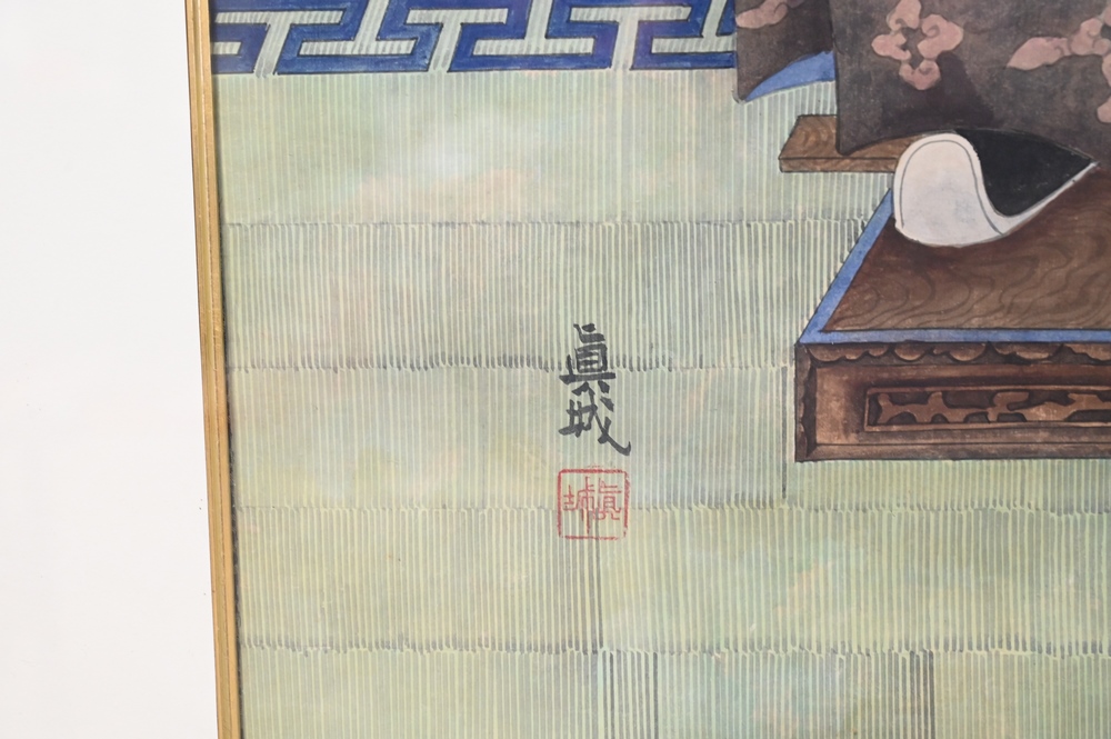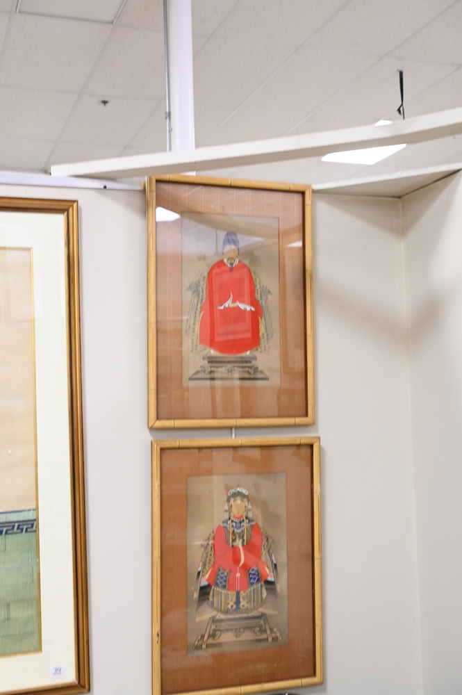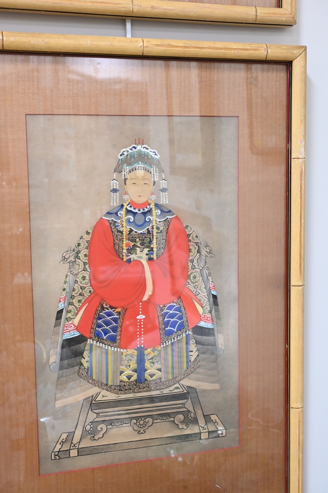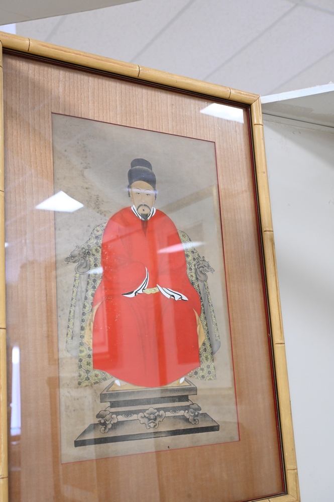 Four Piece Oriental Framed Group, to include an oriental scroll of a painted scholar; orientalist silver plated embossed wall plaque; along with a pair of watercolor portraits on cloth; largest 40″ x 25″.