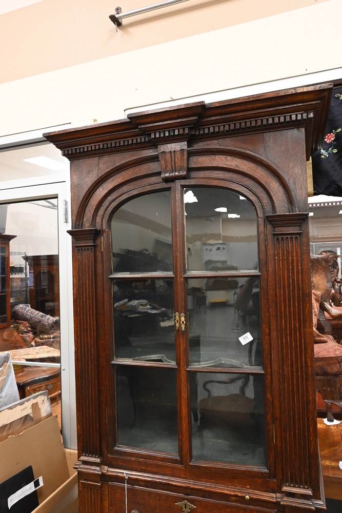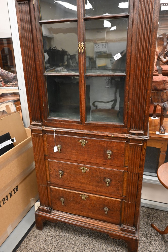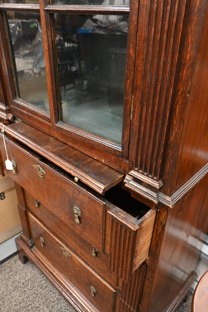 and lower section having three drawers flanked by pilasters all set on bracket feet