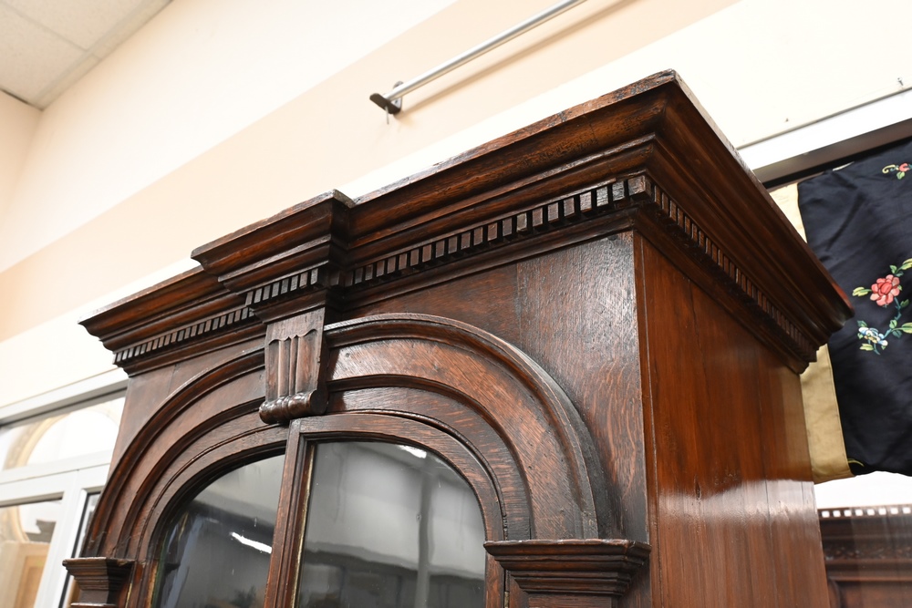 having dentil molded cornice over two arched doors and flanked by pilasters