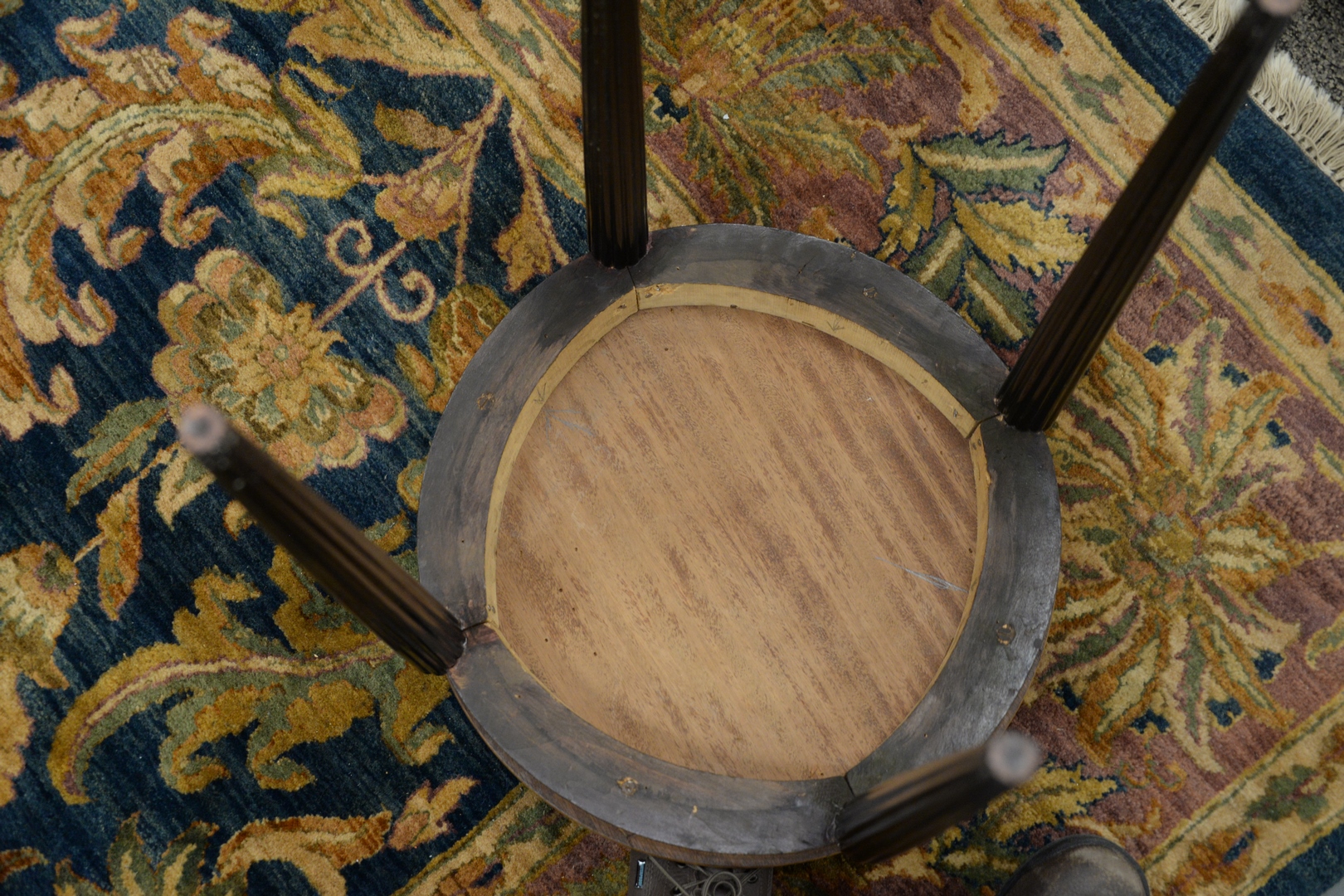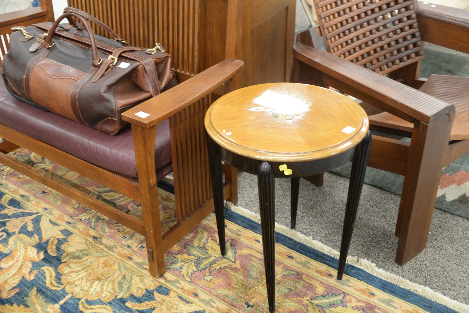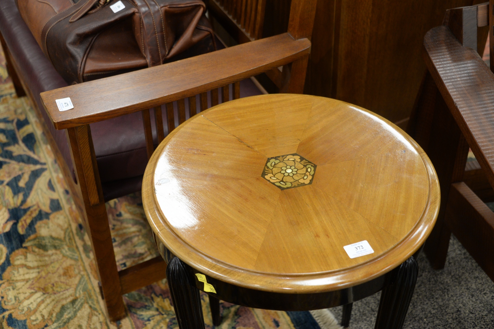 Lot 372: Inlaid Art Deco Side Table, having fluted legs, height 24 1/2 inches, diameter 19 1/2 inches.