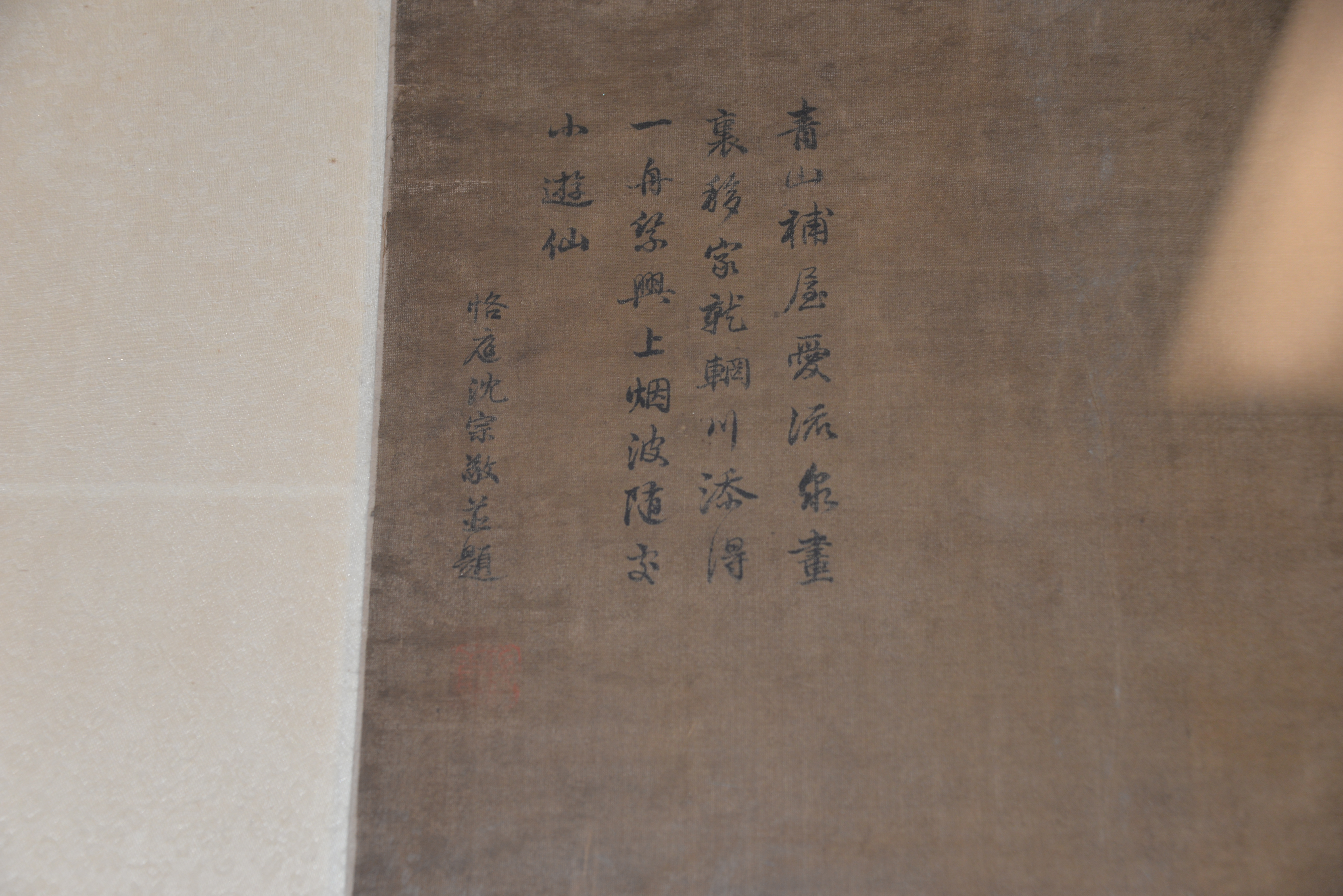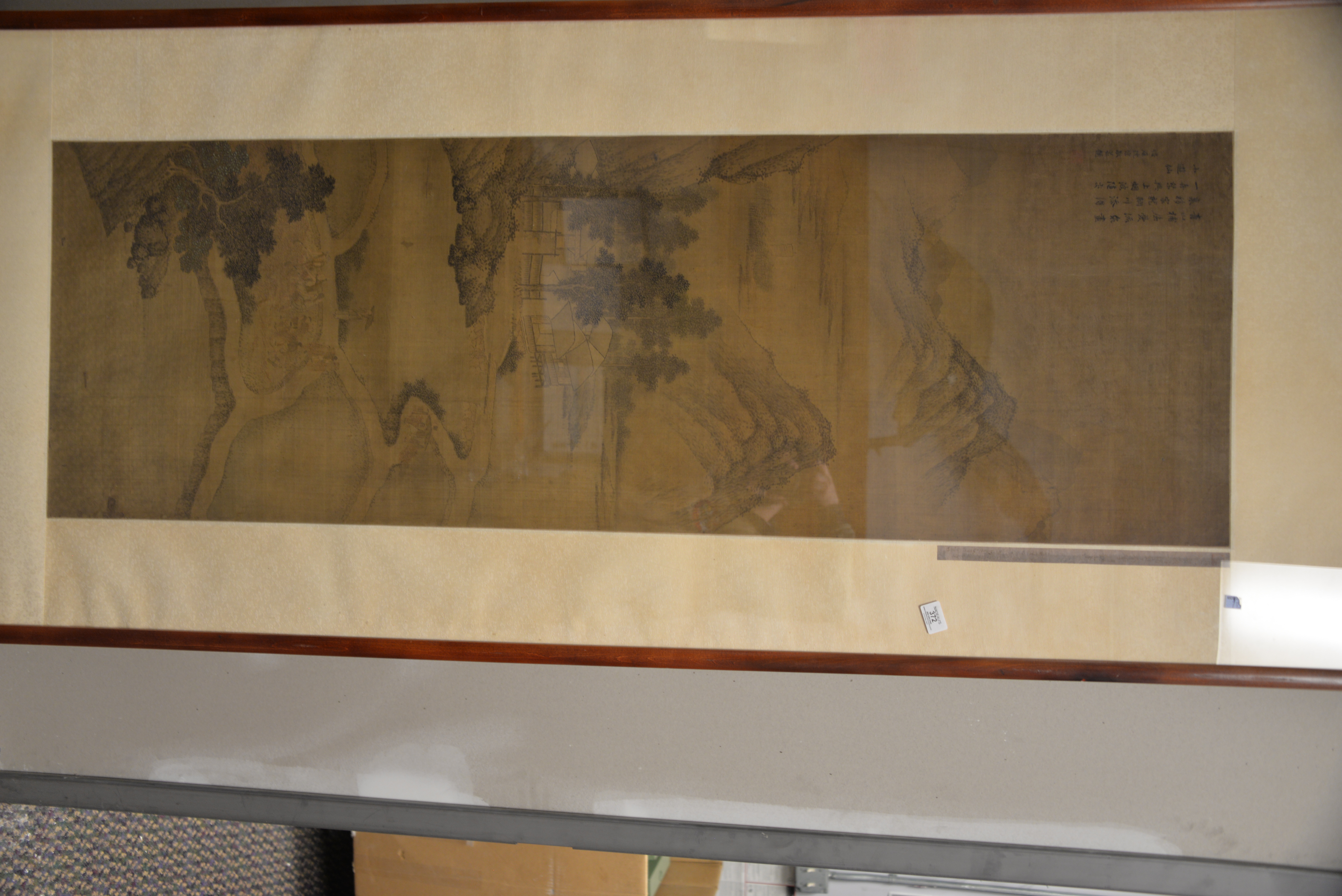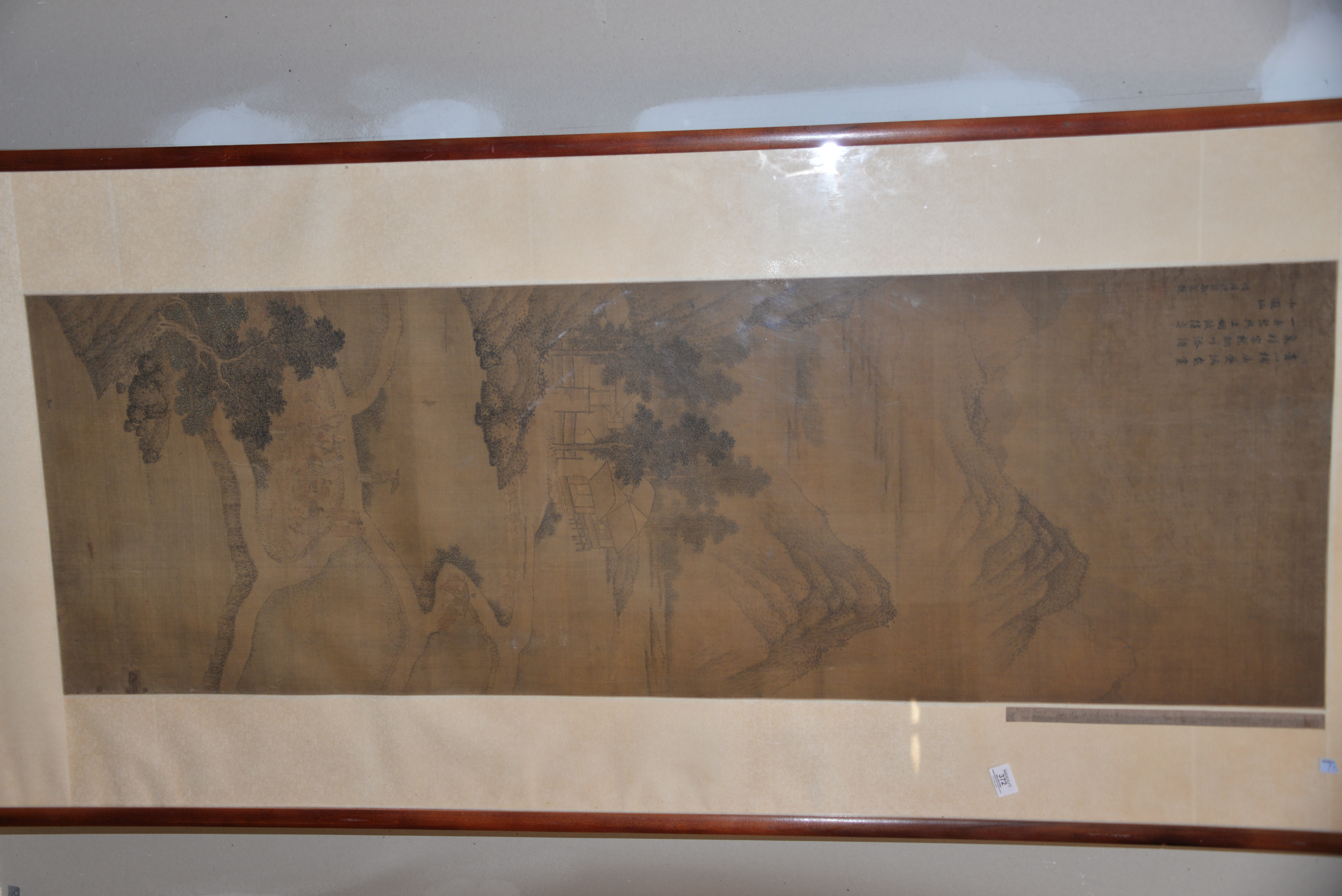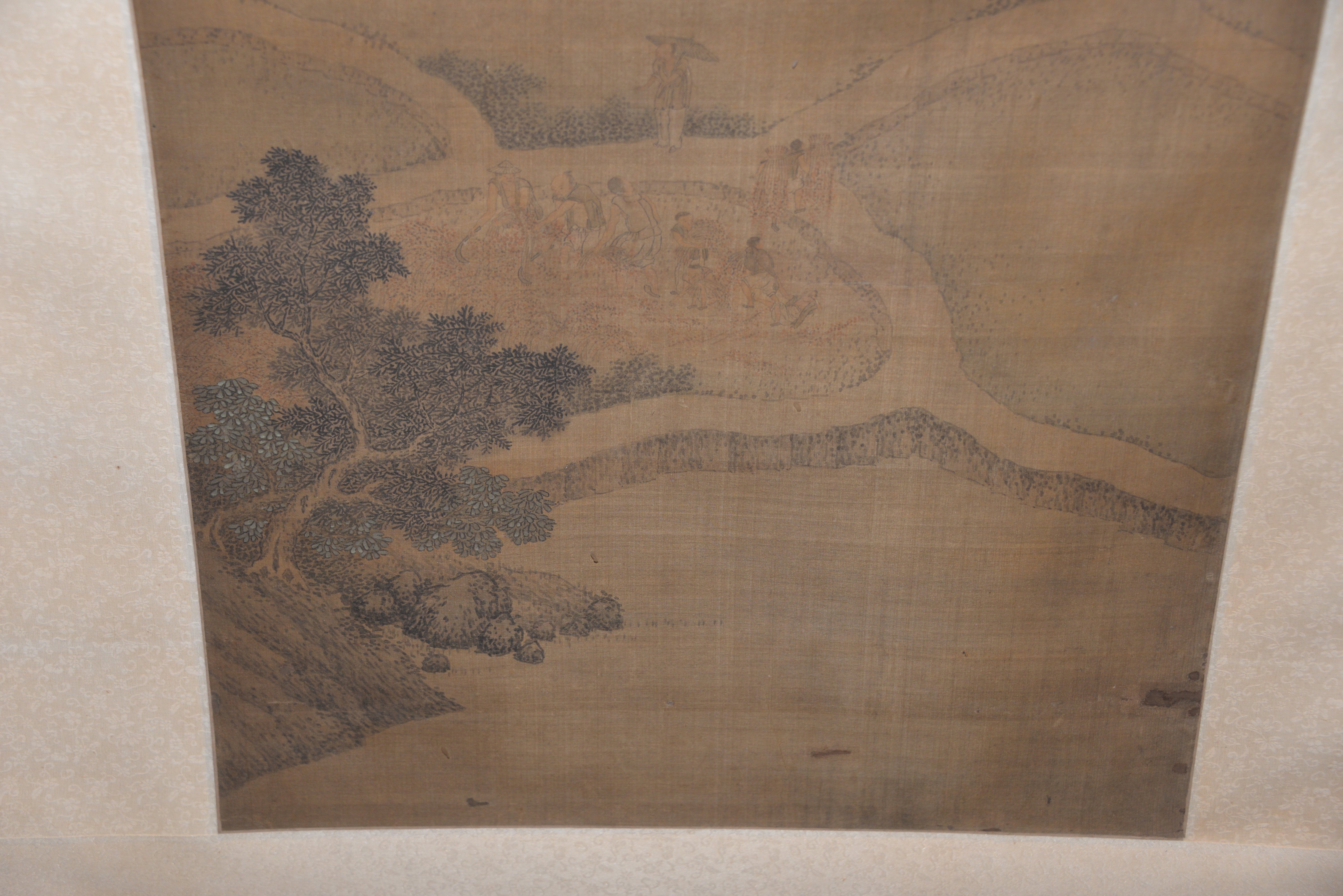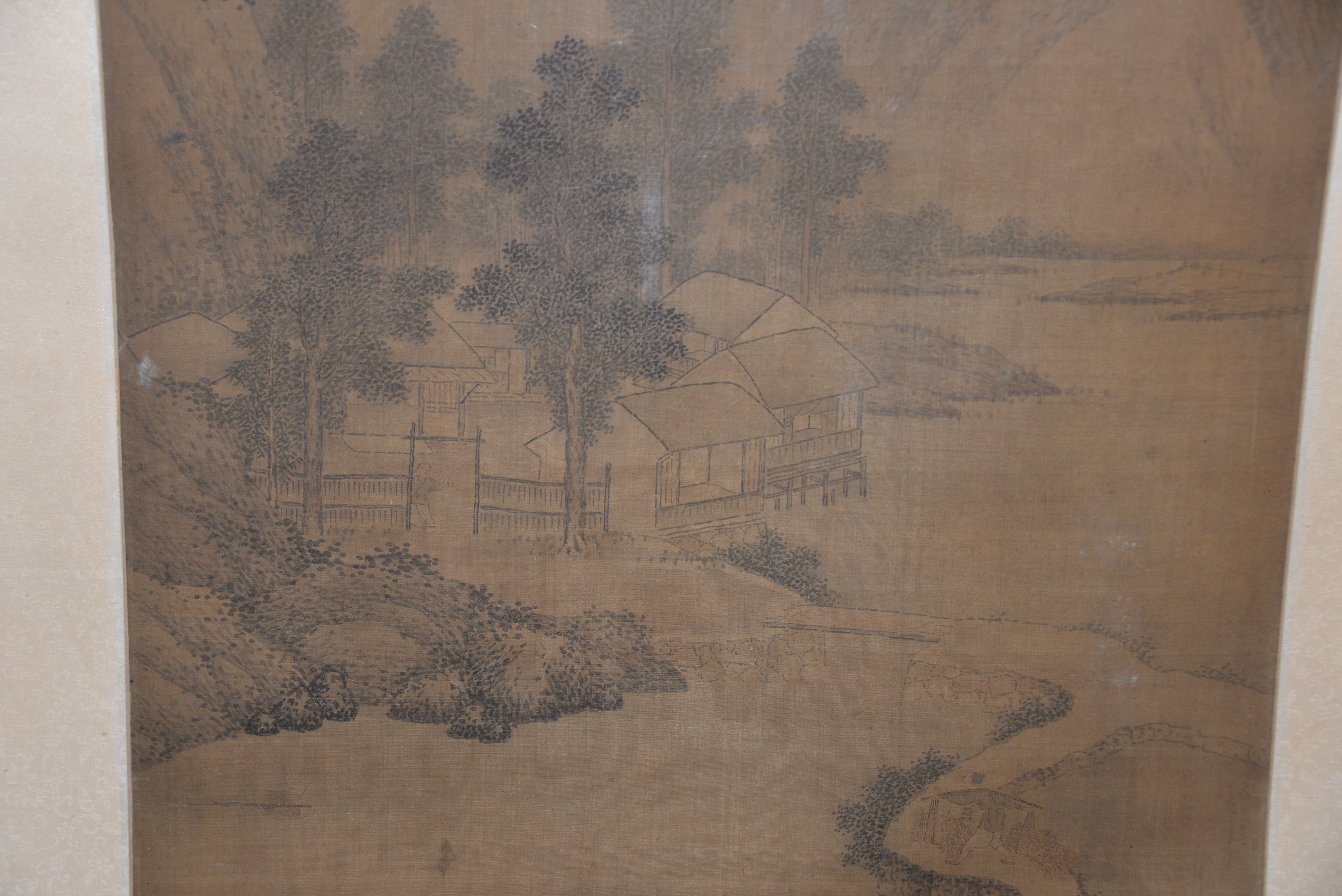 depicting a mountain landscape with villagers and cottages having character marks upper left, inscription upper right, now framed