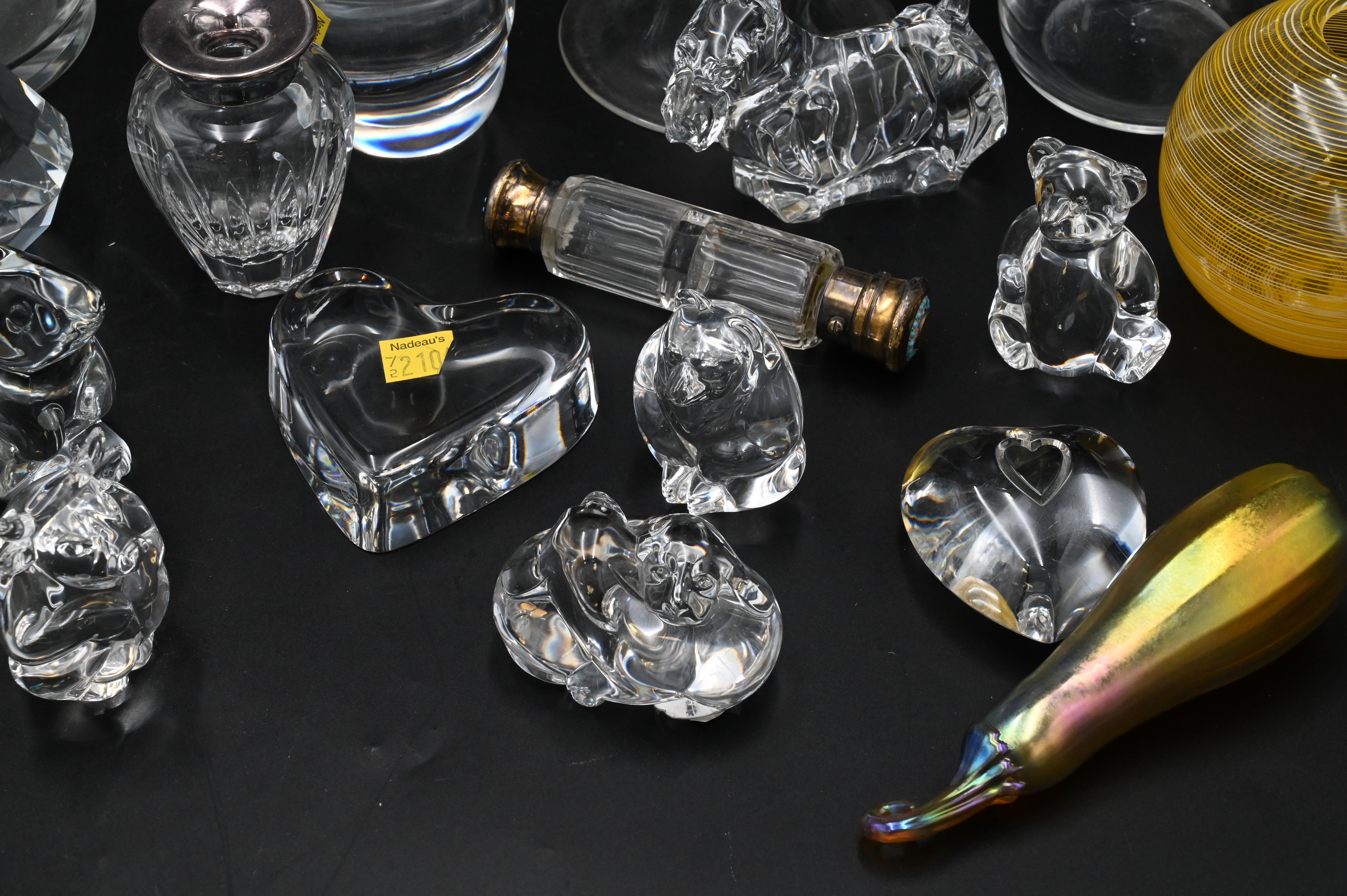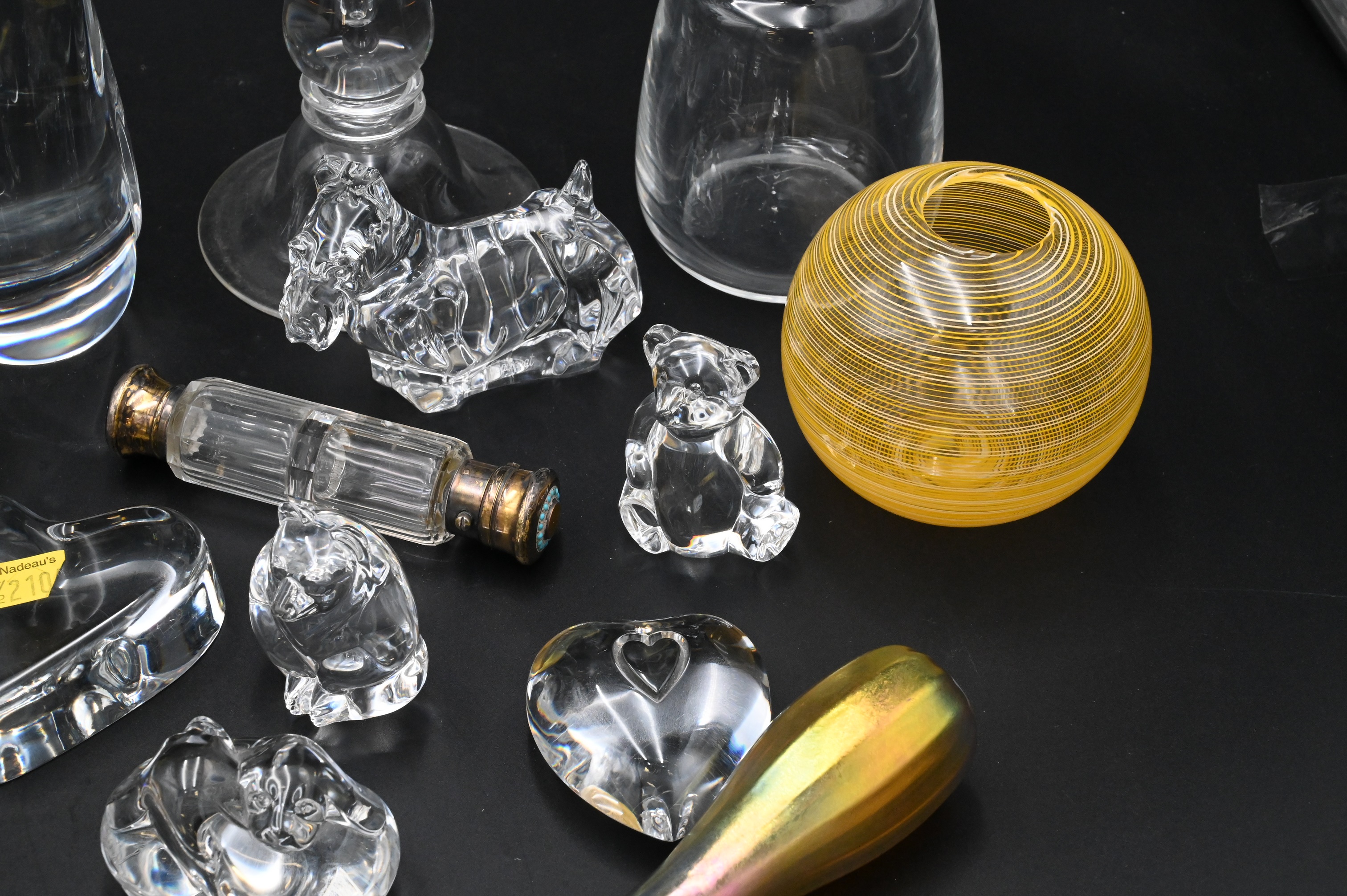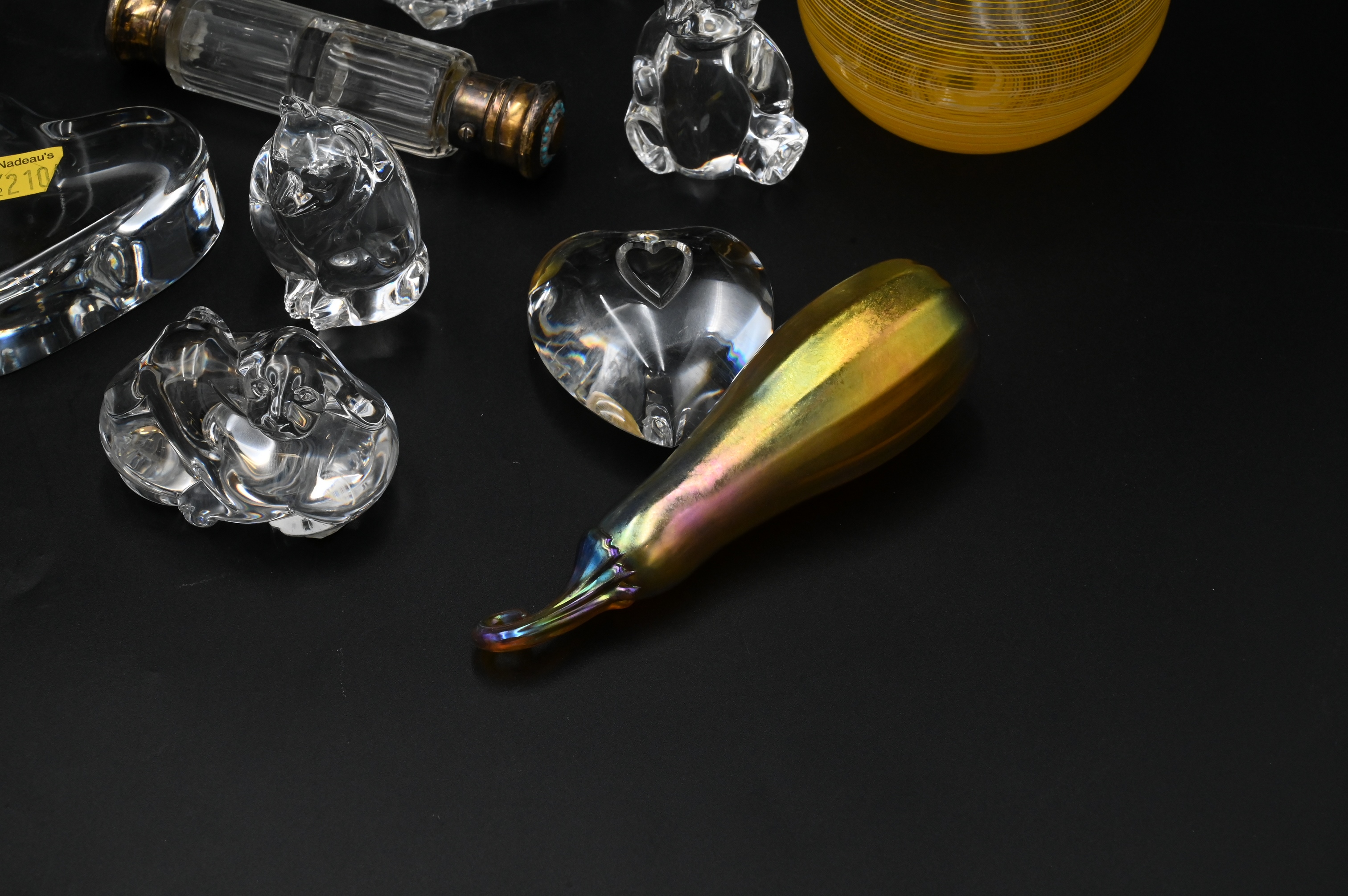 to include 10 Steuben animal paperweights and candlesticks, Baccarat ice bucket and animal paperweights, Lundberg Studios 94 gourd, Tiffany and Company diamond paperweight, etc