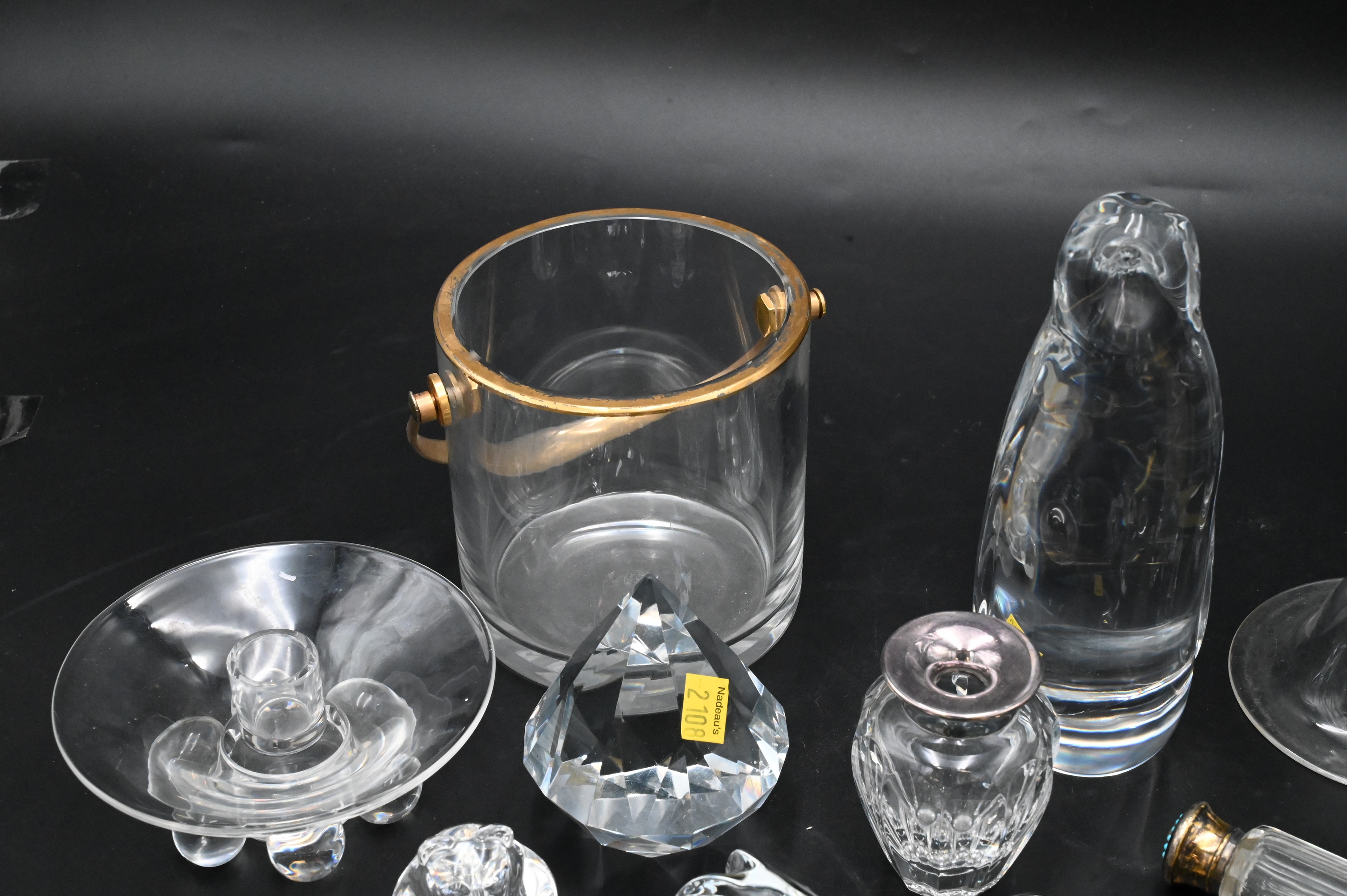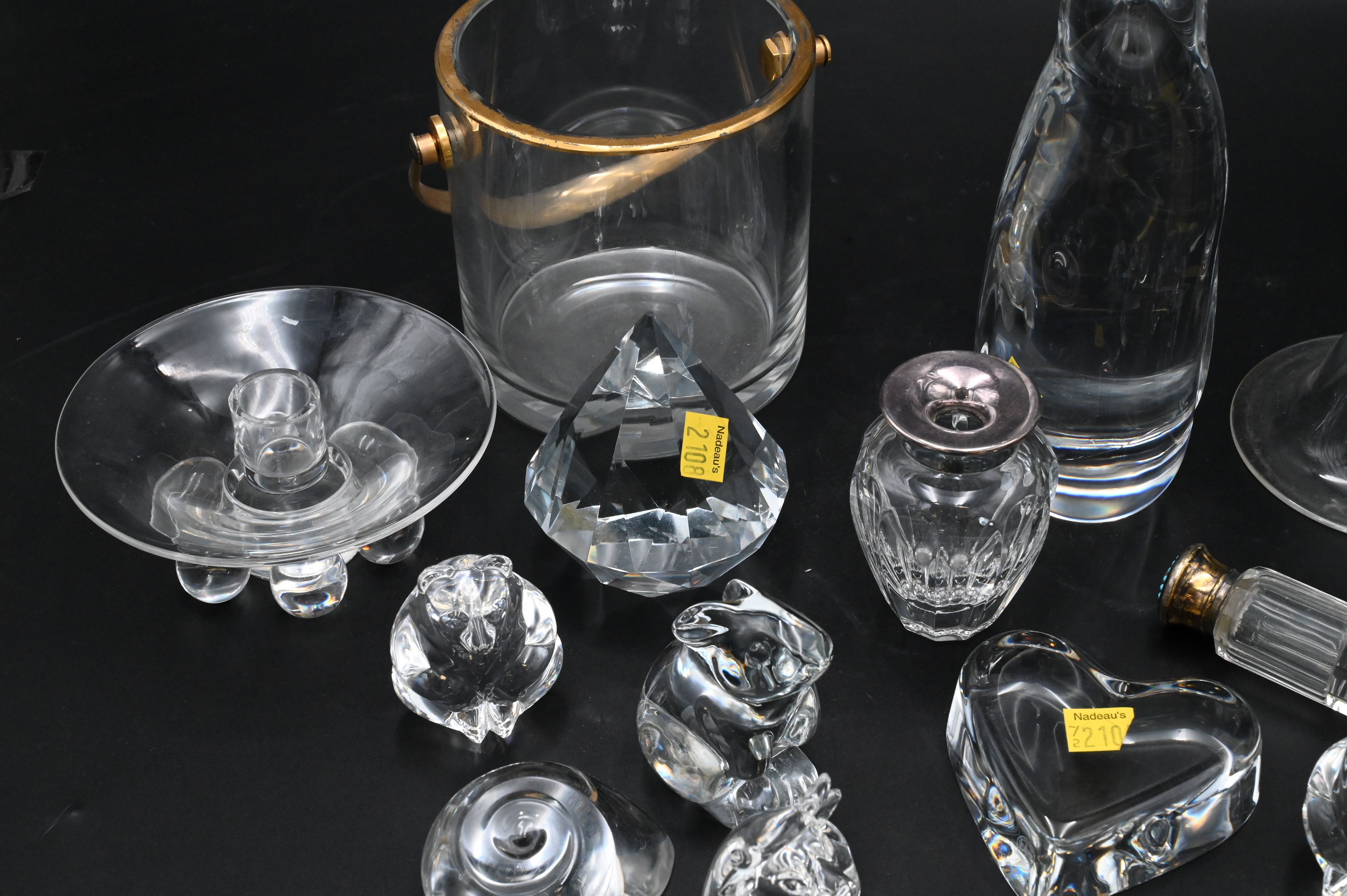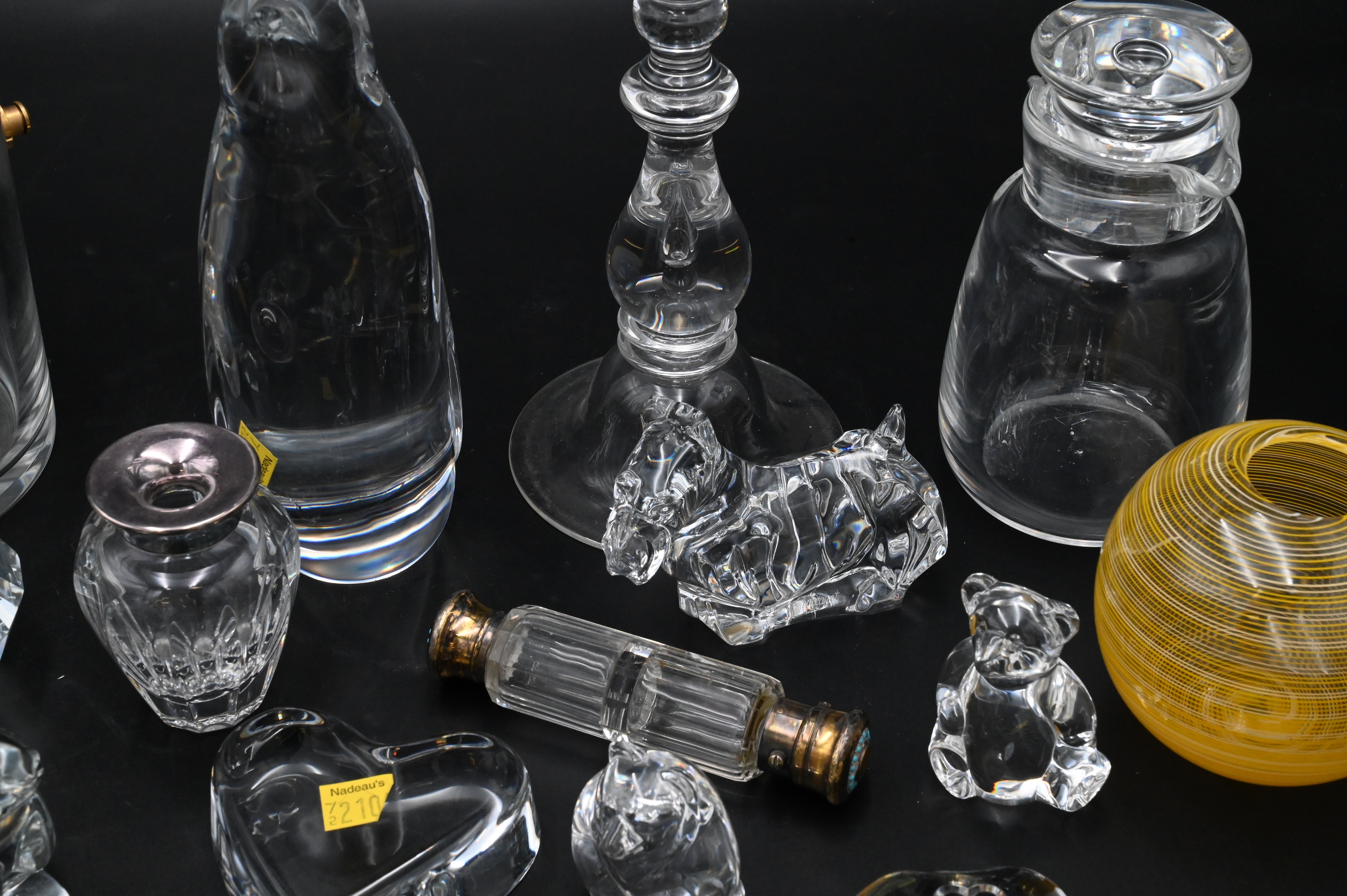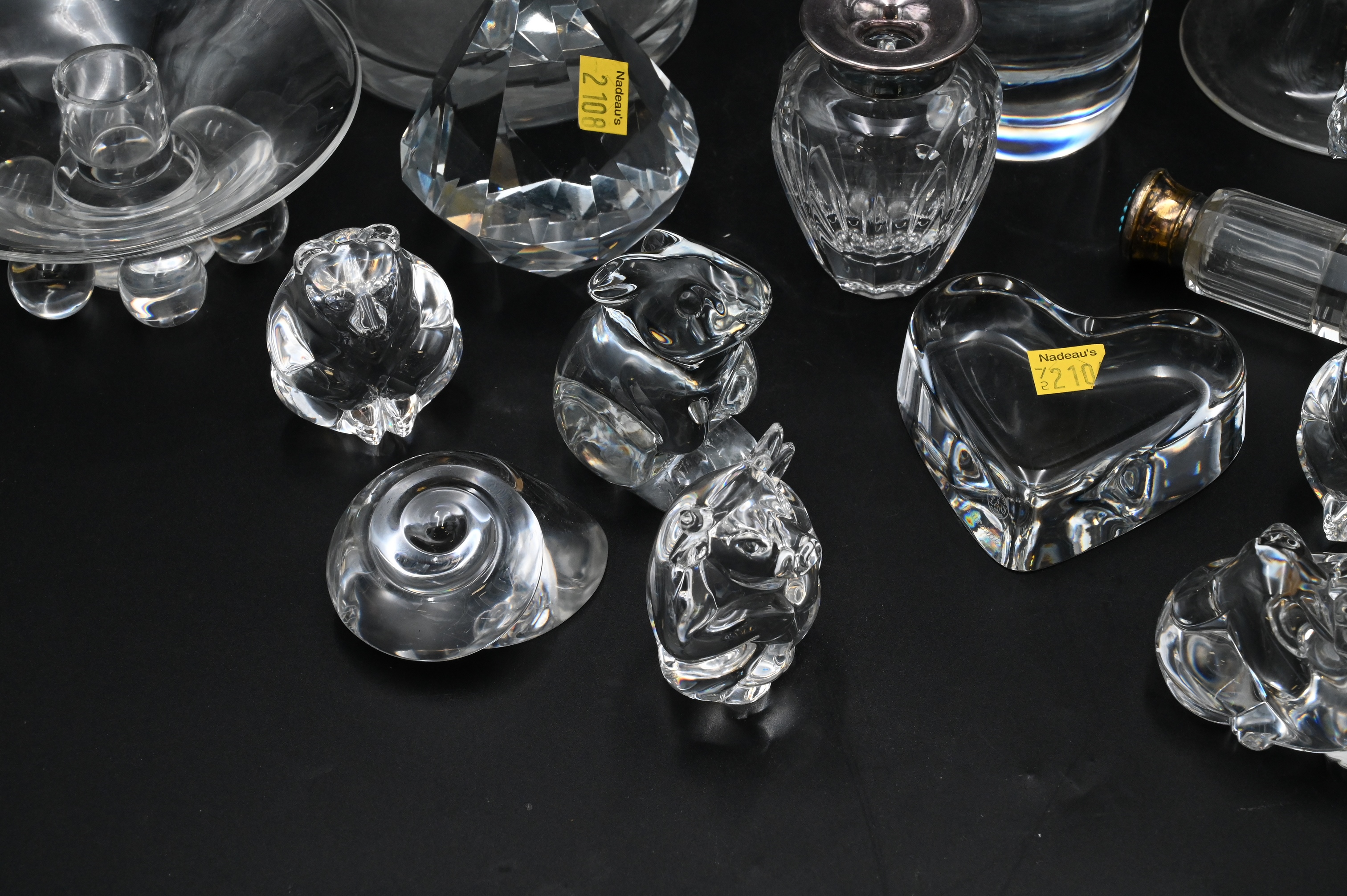 to include 10 Steuben animal paperweights and candlesticks, Baccarat ice bucket and animal paperweights, Lundberg Studios 94 gourd, Tiffany and Company diamond paperweight, etc