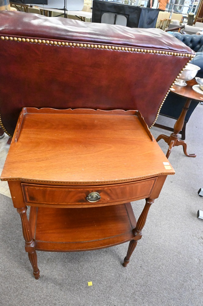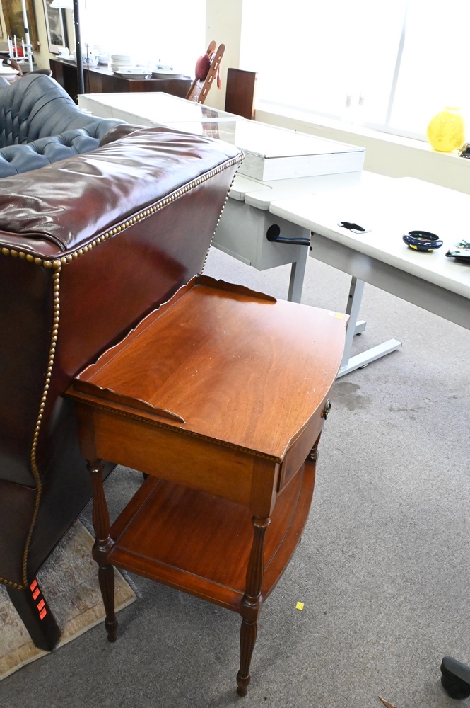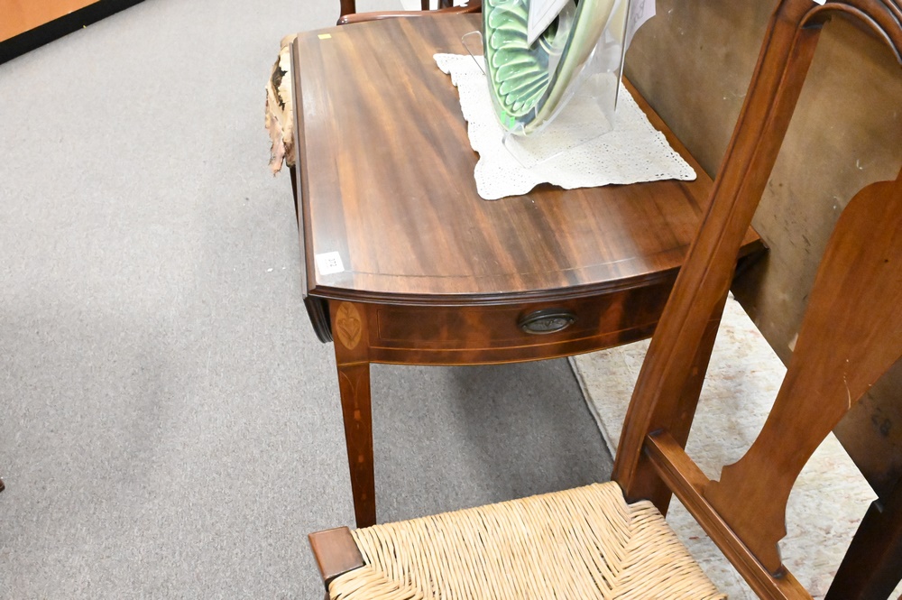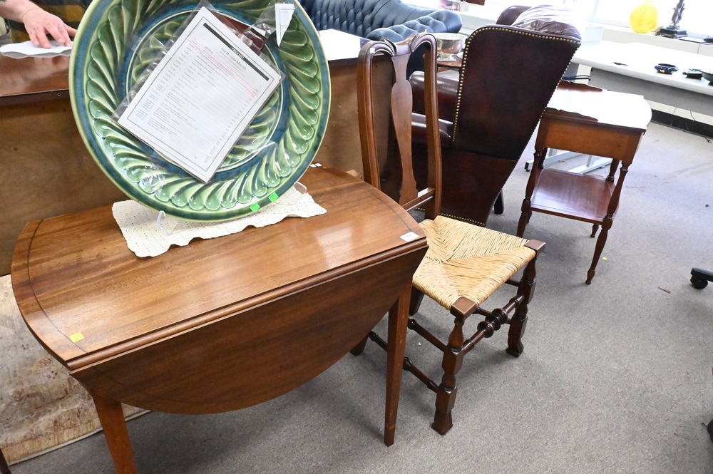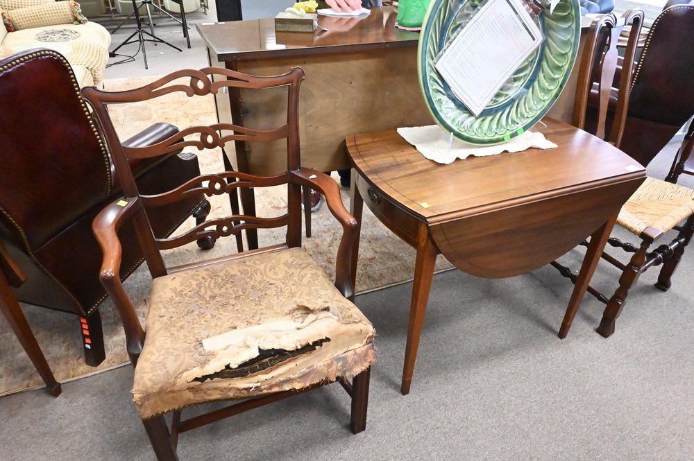 Lot 372: Margolis Four Piece Lot, to include Pembroke drop leaf table, height 28 inches, open top 42″ x 33″, top closed 20″ x 33″; Sheraton nightstand, Queen Anne style chair, along with a Chippendale style armchair.