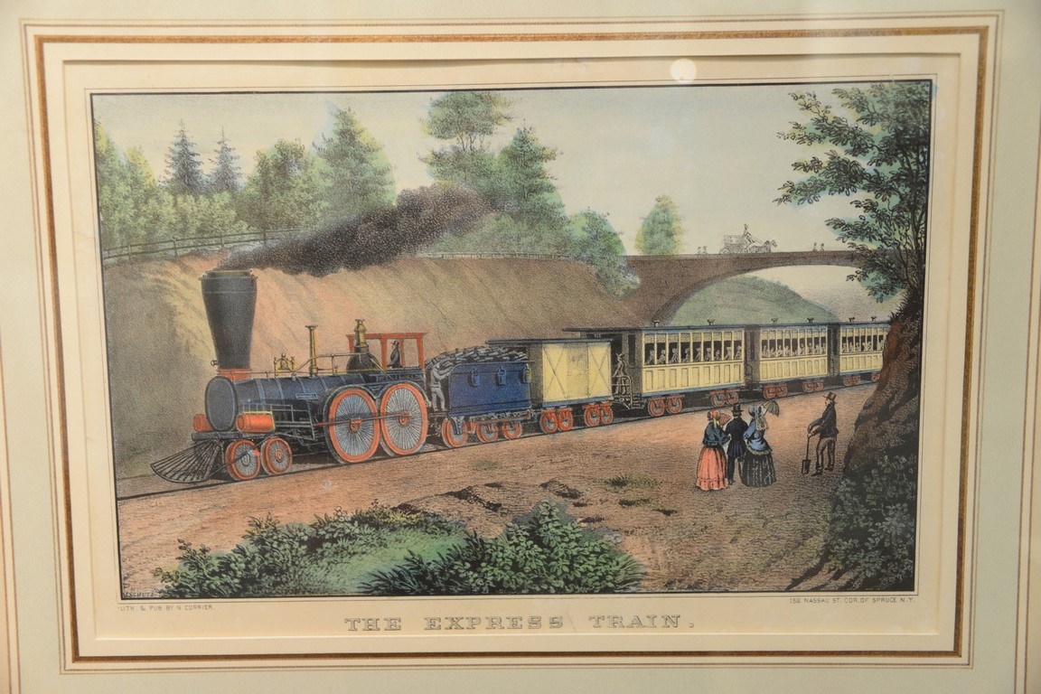 Nathaniel Currier, small folio hand colored lithograph, The Express Train, Lith & Pub by N. Currier, J. Schutz delineator, sight size 8 3/4 x 13 Provenance: Property from Credit Suisse’s Americana Collection