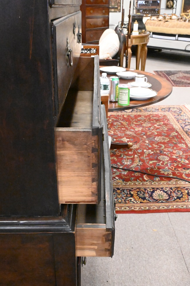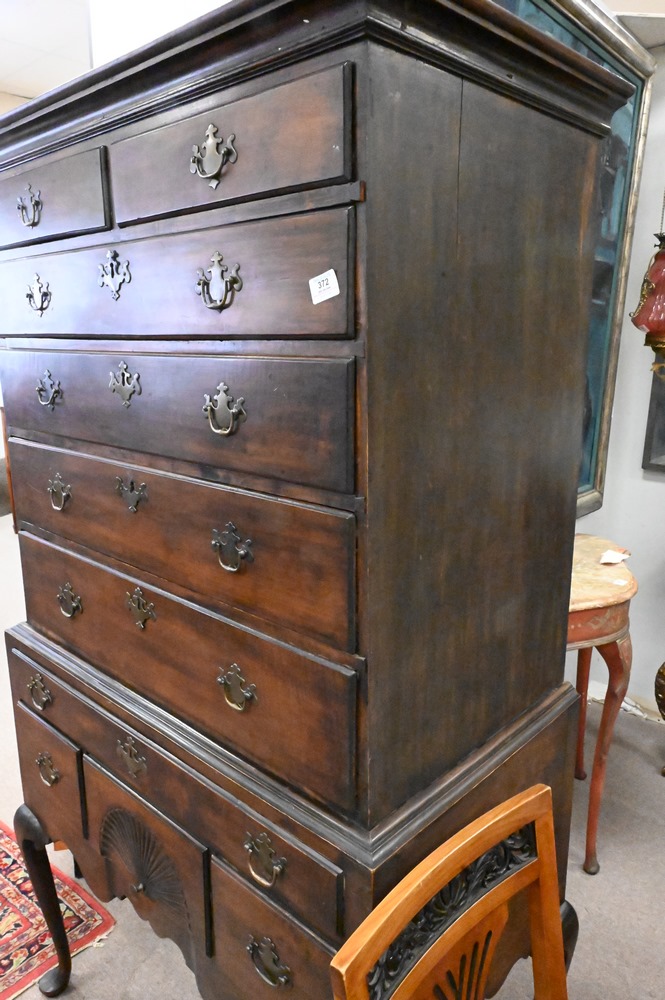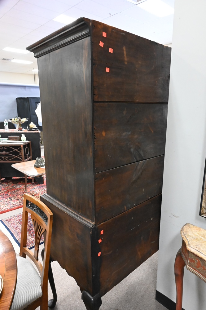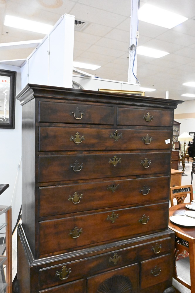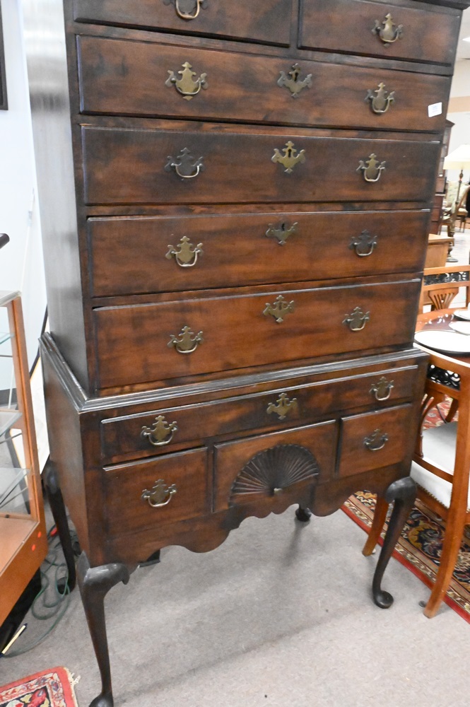Queen Anne Maple Highboy, in two parts having flat top over two drawers over four drawers on lower section, with one long drawer over three drawers with center fan carvings set on cabriole legs ending in pad feet, height 71 inches, upper width 36 inches.