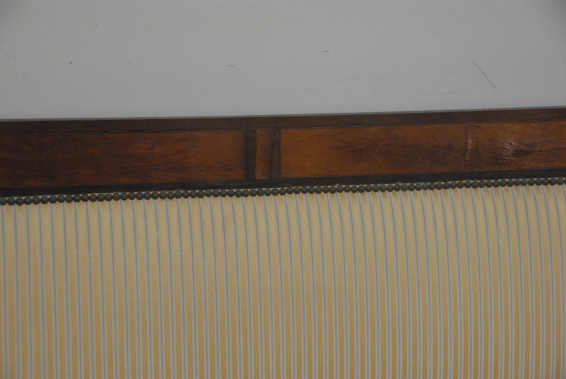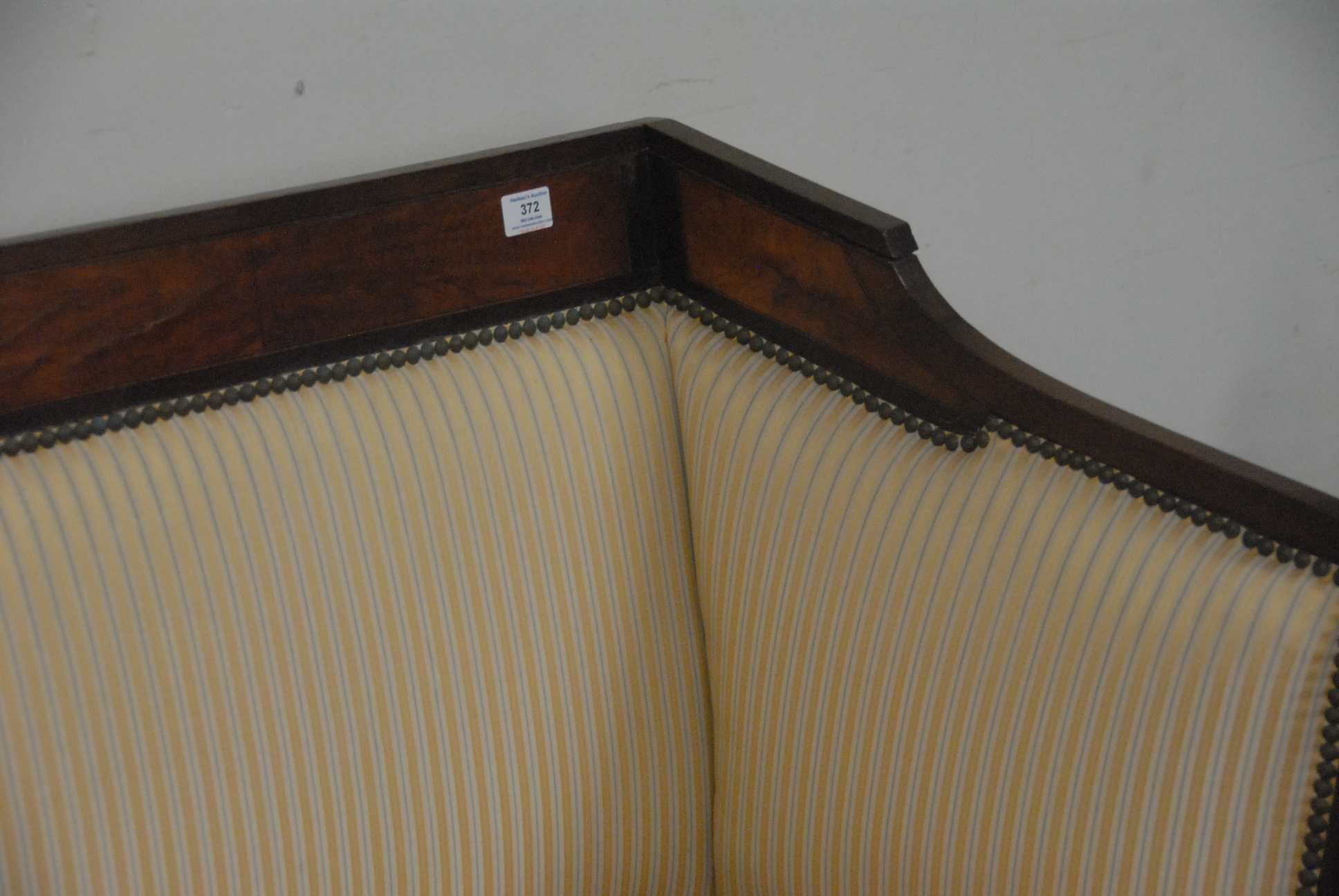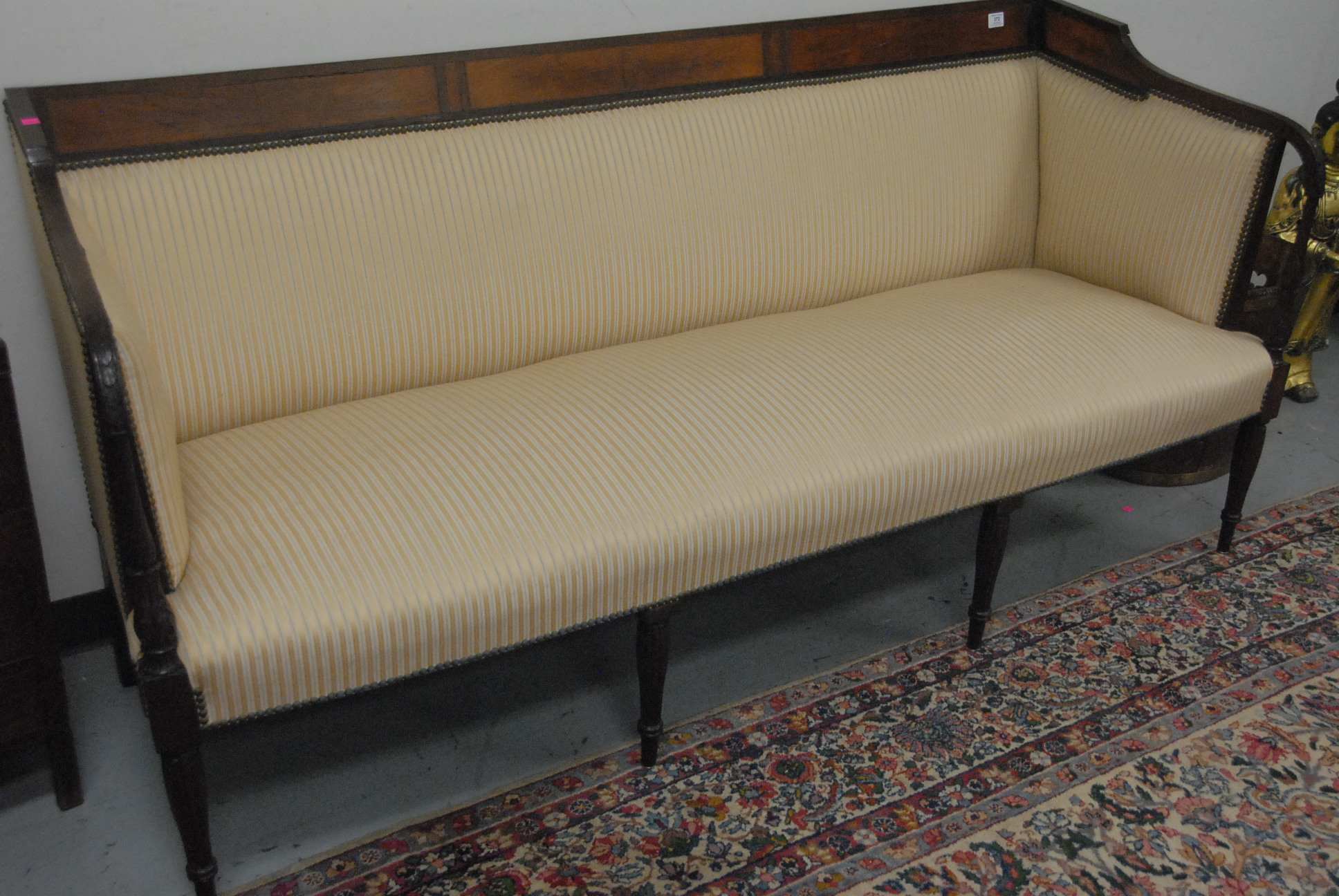 Lot 372: Sheraton sofa having burlwood paneled back and carved hand rests and arm supports, set on round fluted legs, circa 1830. ht. 37 in. wd. 80 in.