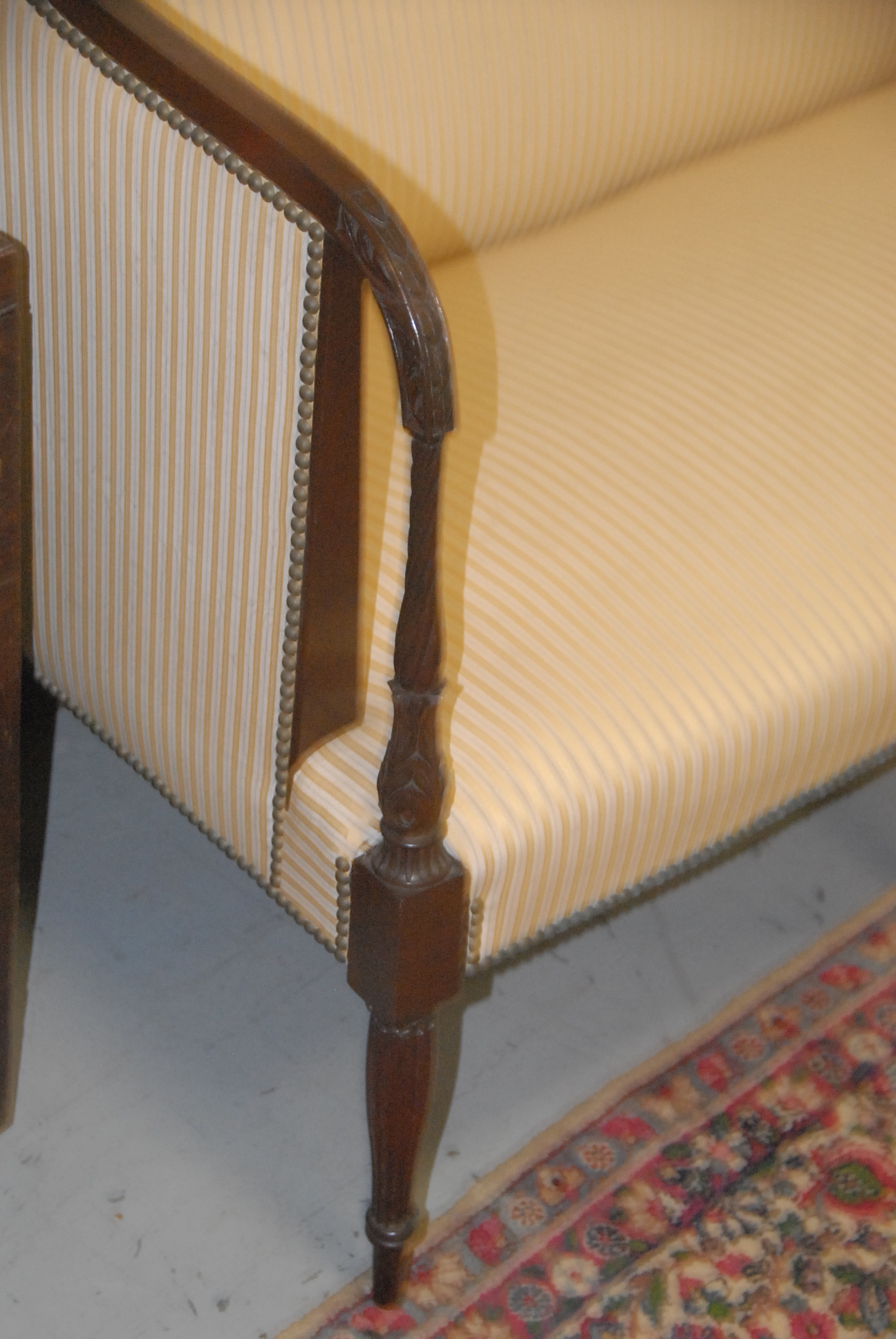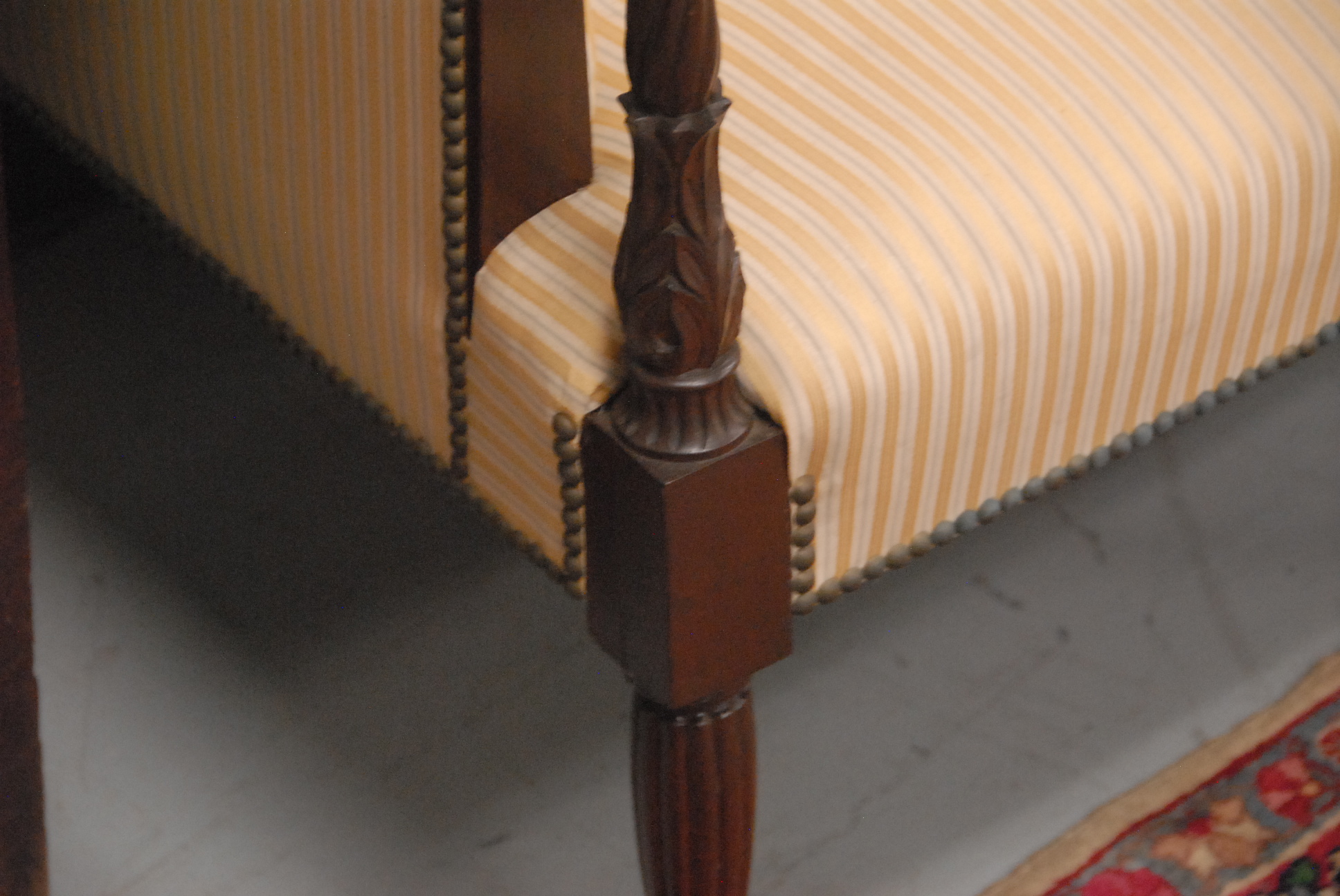 Sheraton sofa having burlwood paneled back and carved hand rests and arm supports, set on round fluted legs, circa 1830. ht. 37 in. wd. 80 in.