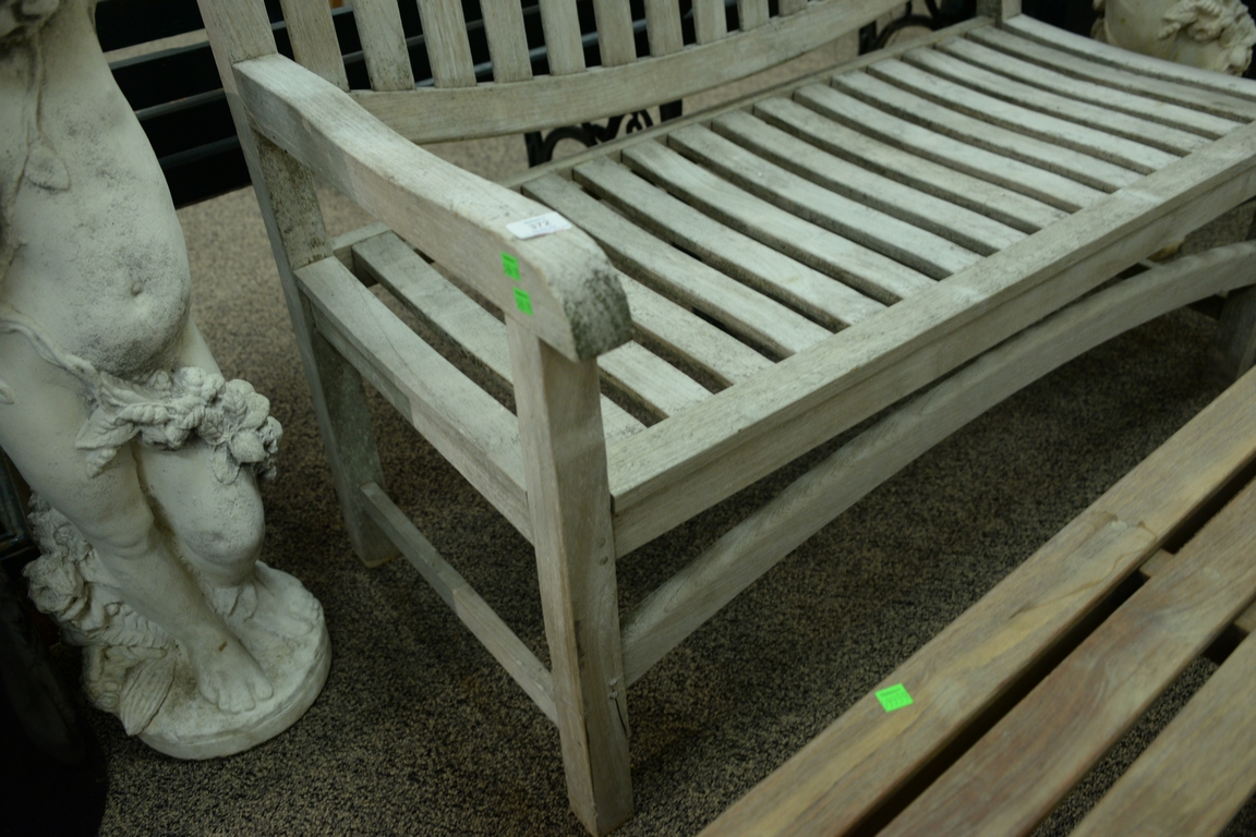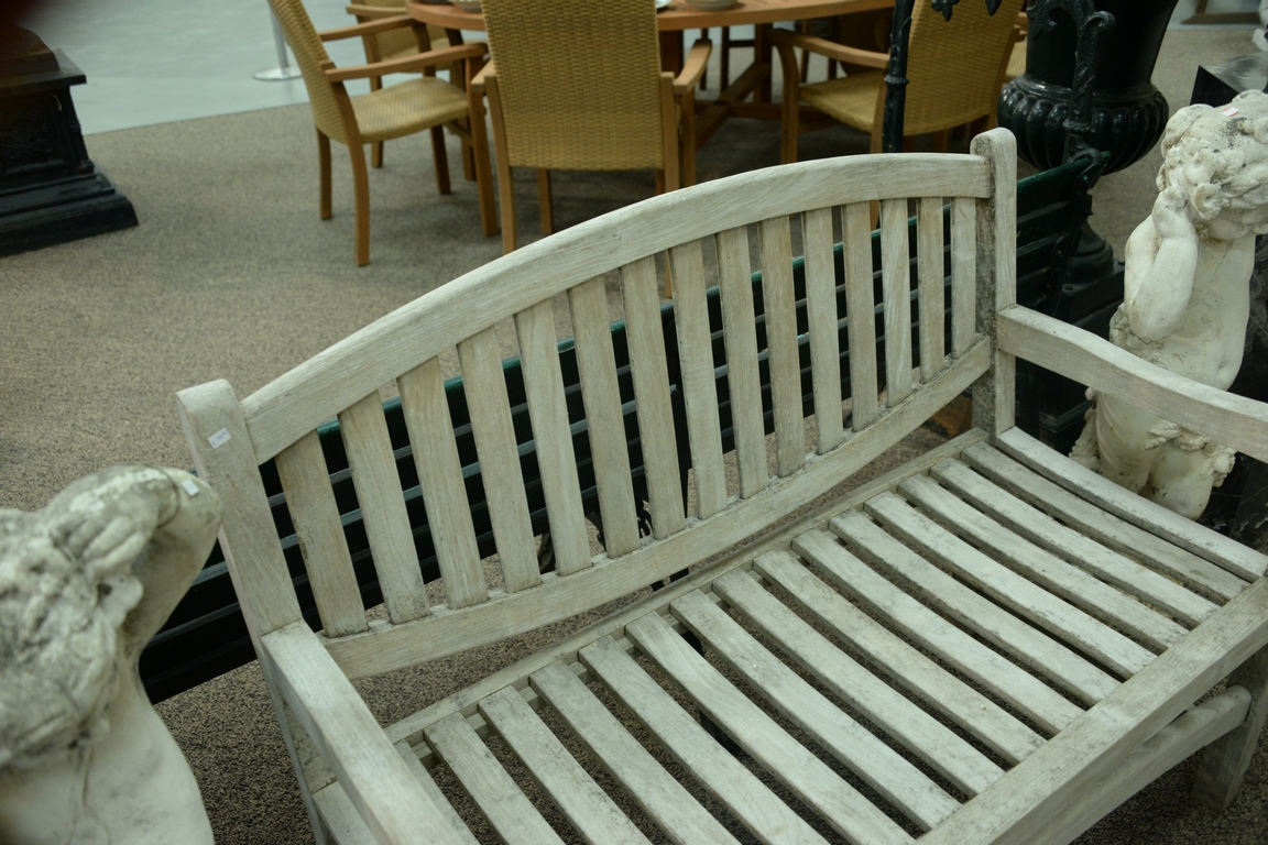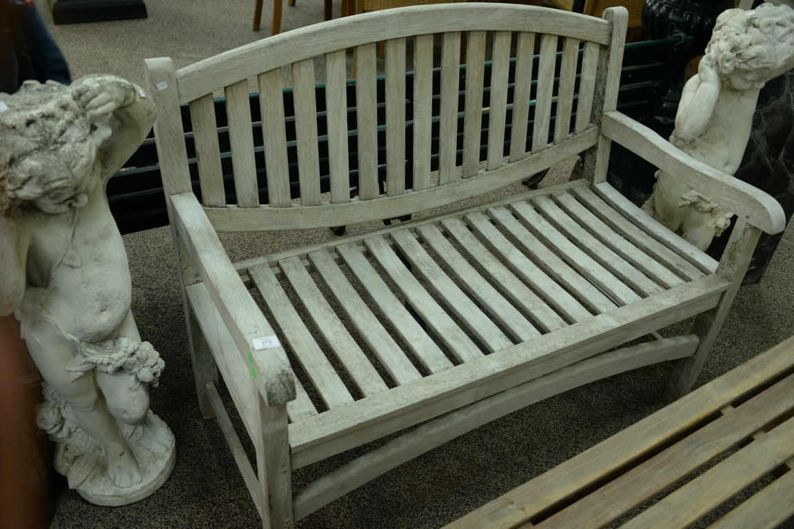 Teak bench with arms. ht. 38in., wd. 48 1/2in.
