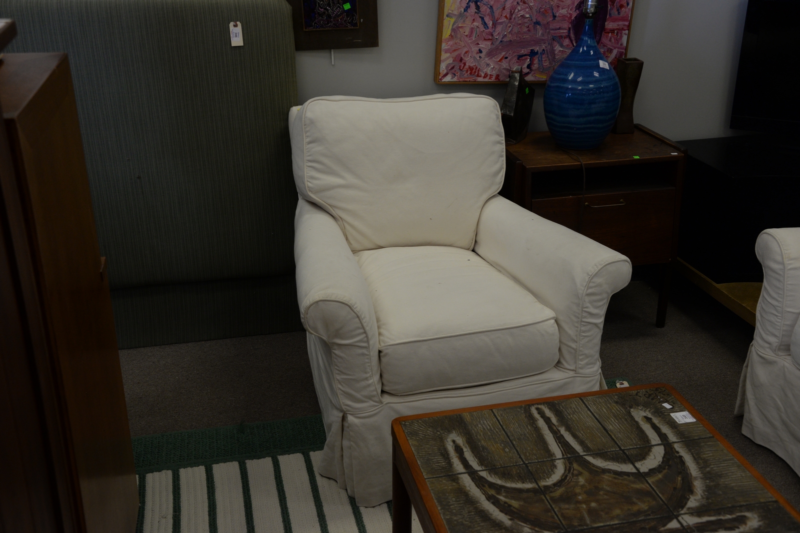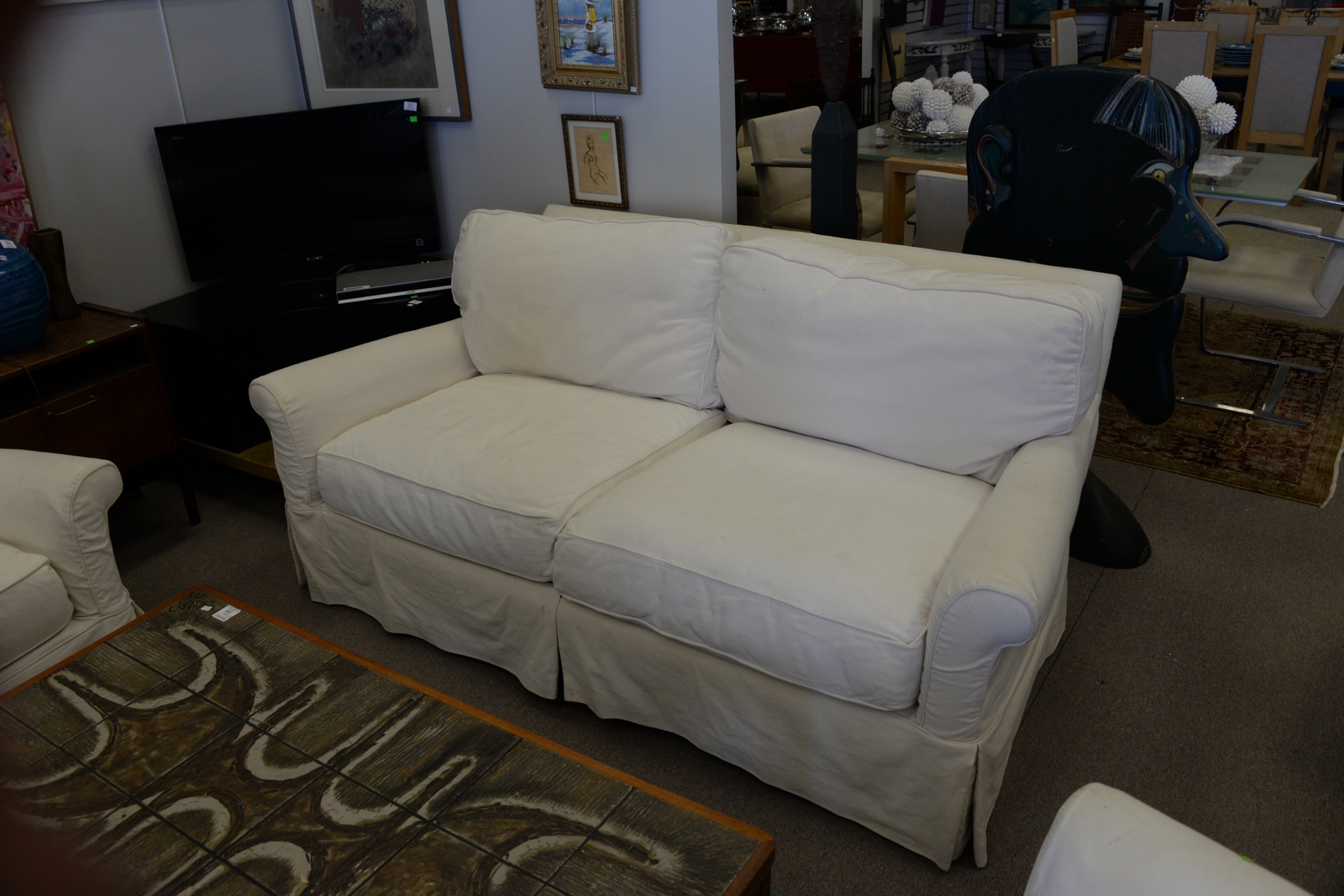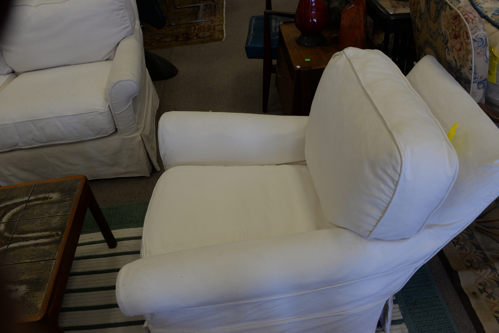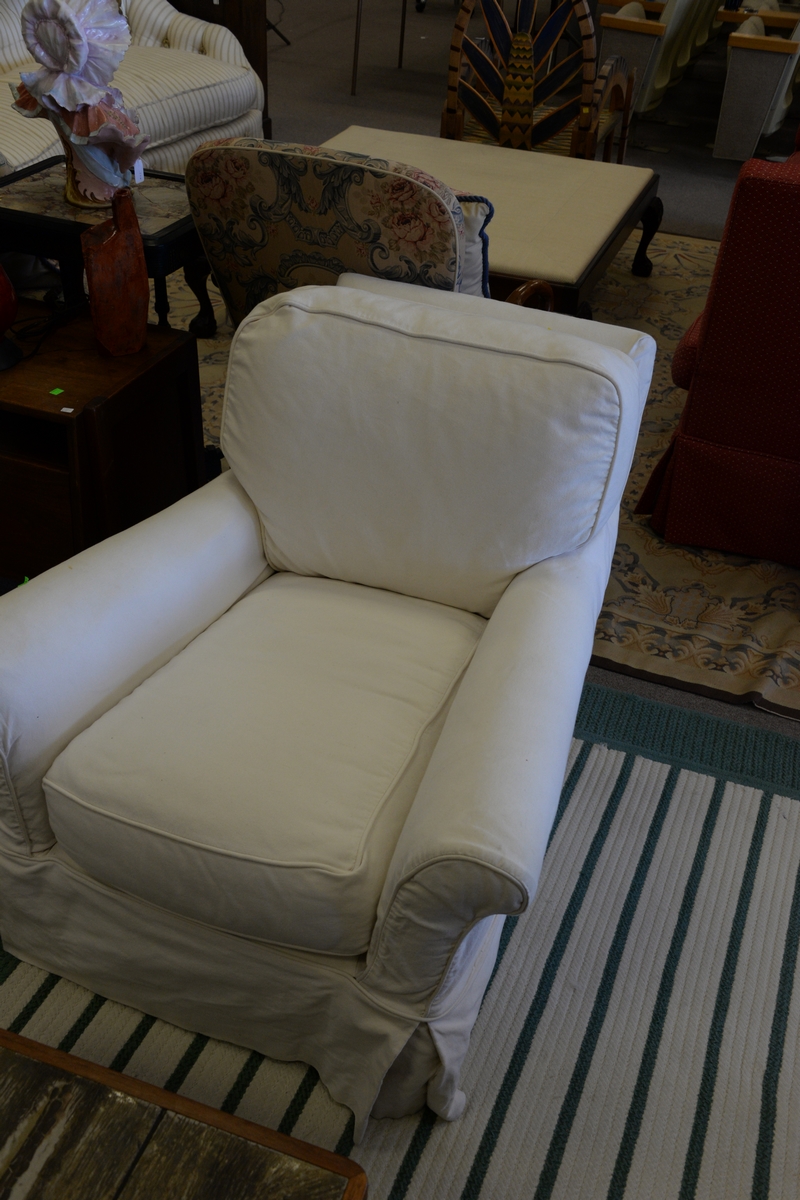 Three piece set including sofa and two chairs, all with custom slipcovers. lg. 75in.