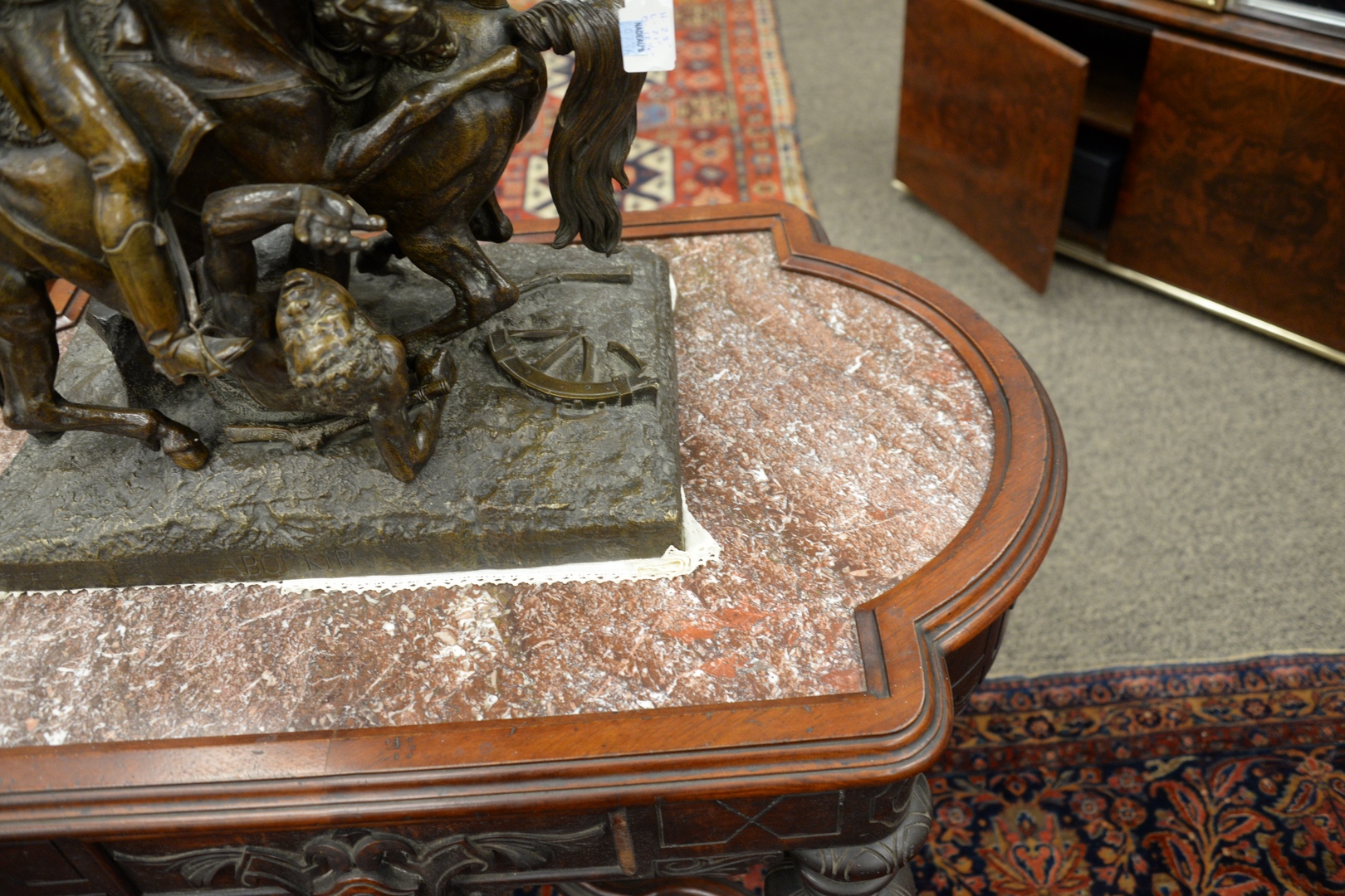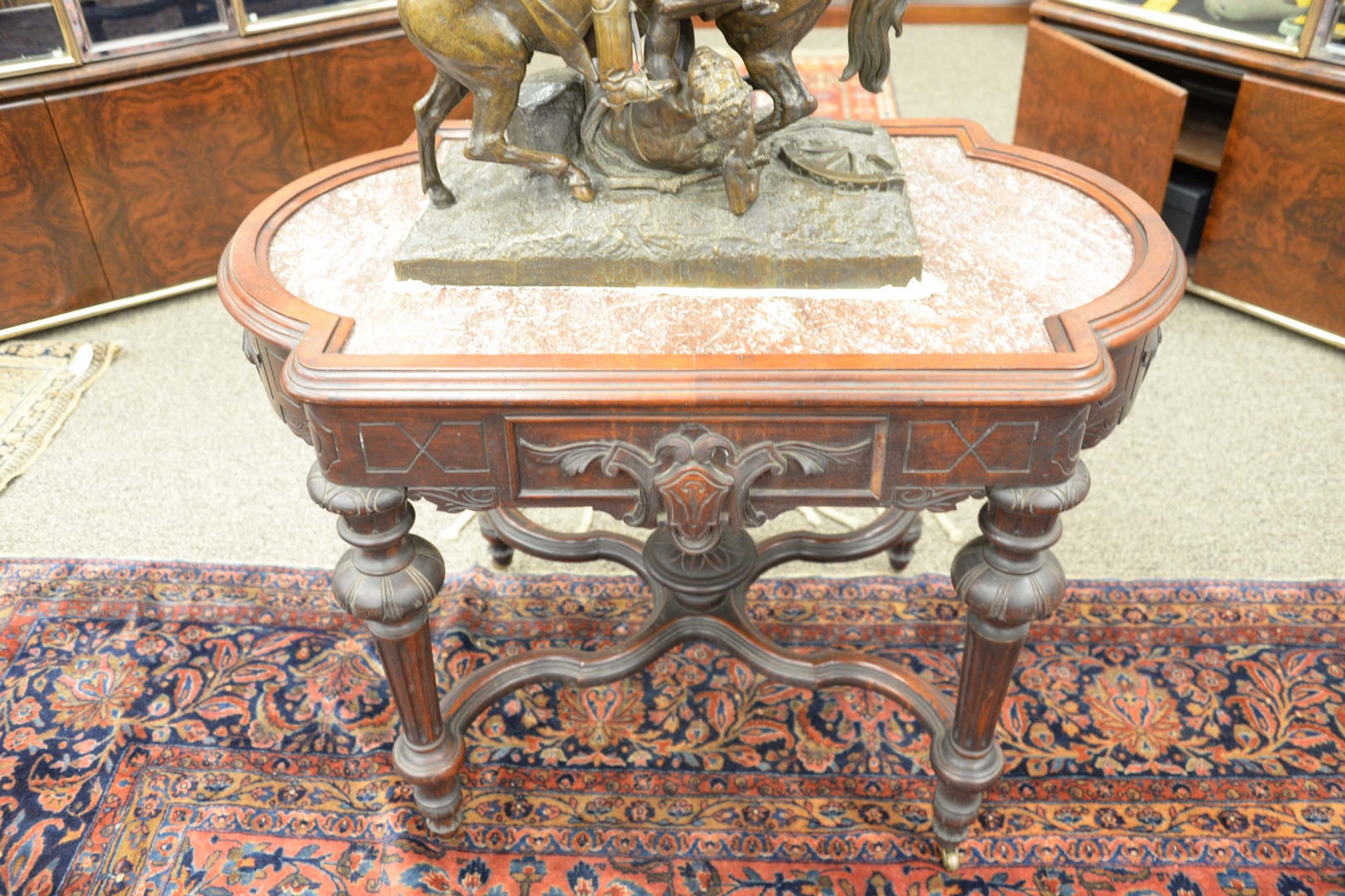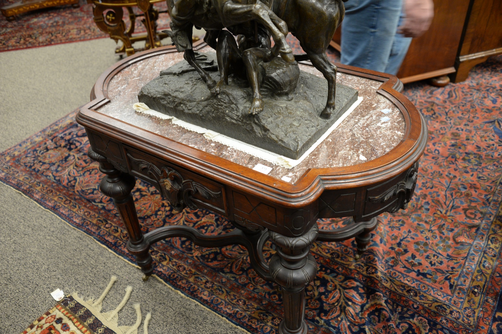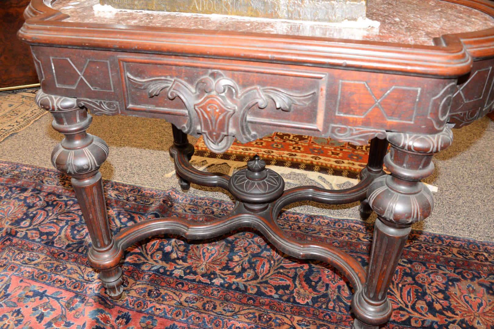 Lot 372: Victorian Walnut Center Table with brown inset marble height 30 1/2 inches, top 25 1/2 x 41 1/2 Provenance: Thirty-five year coll…