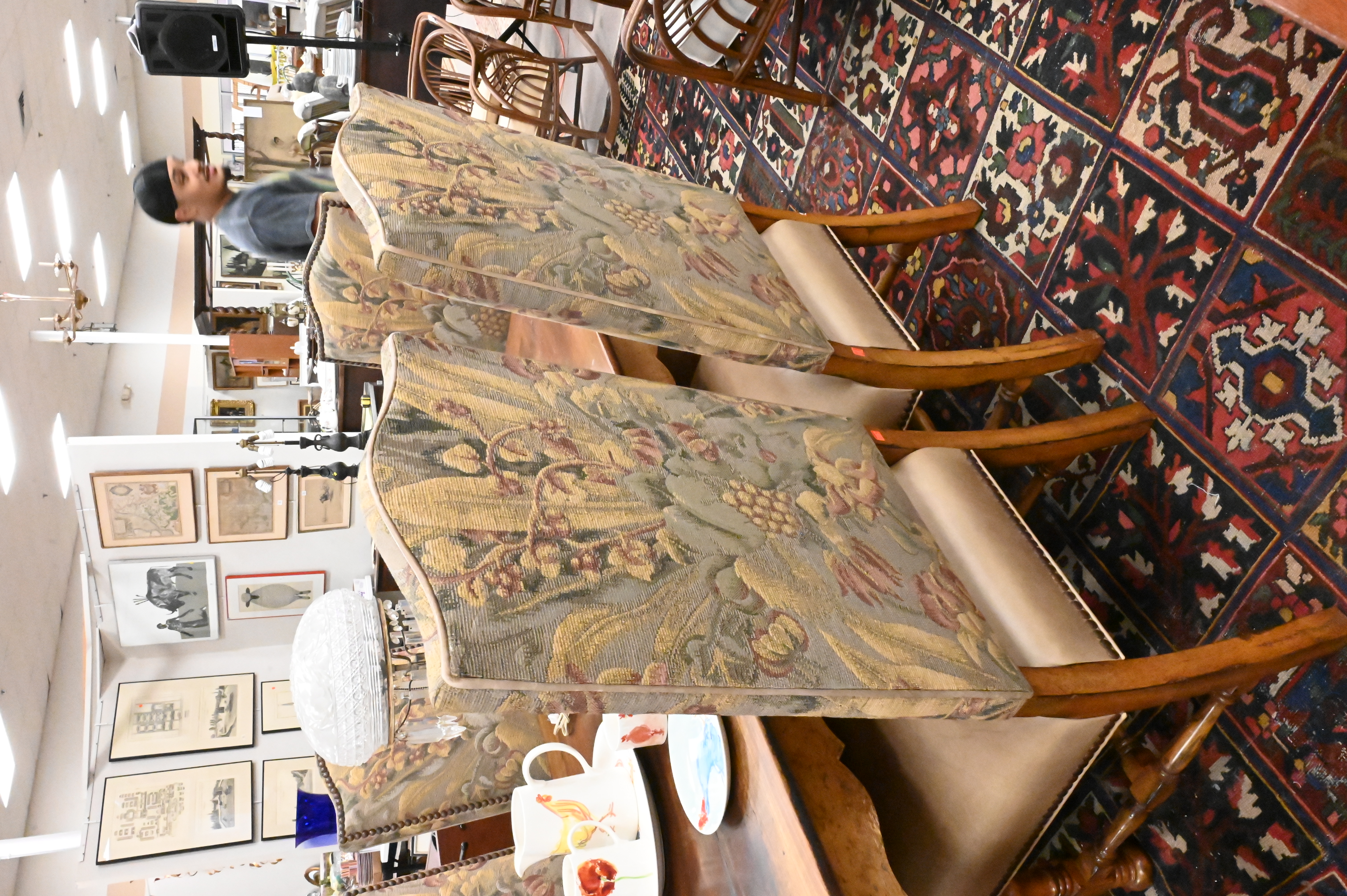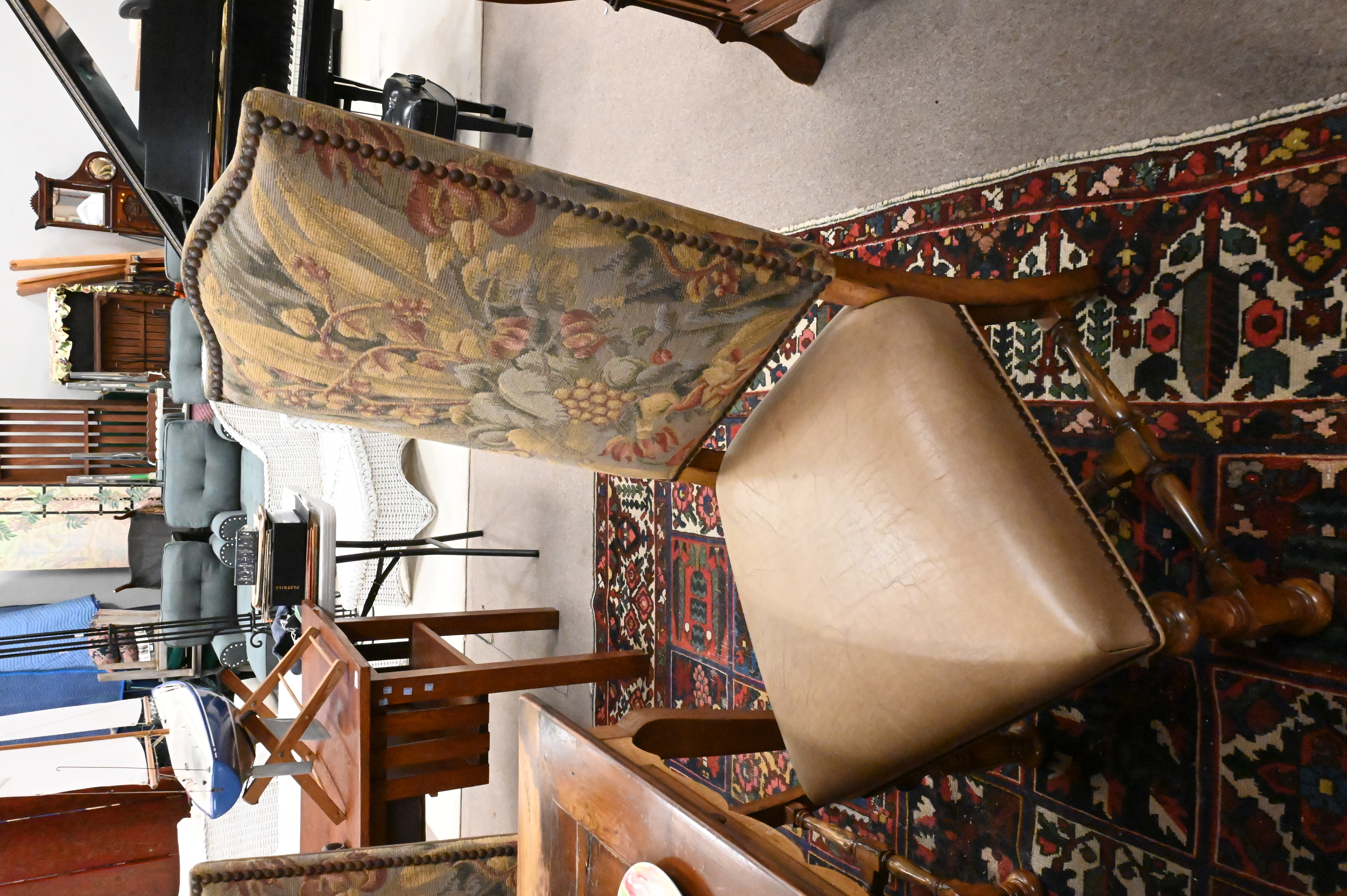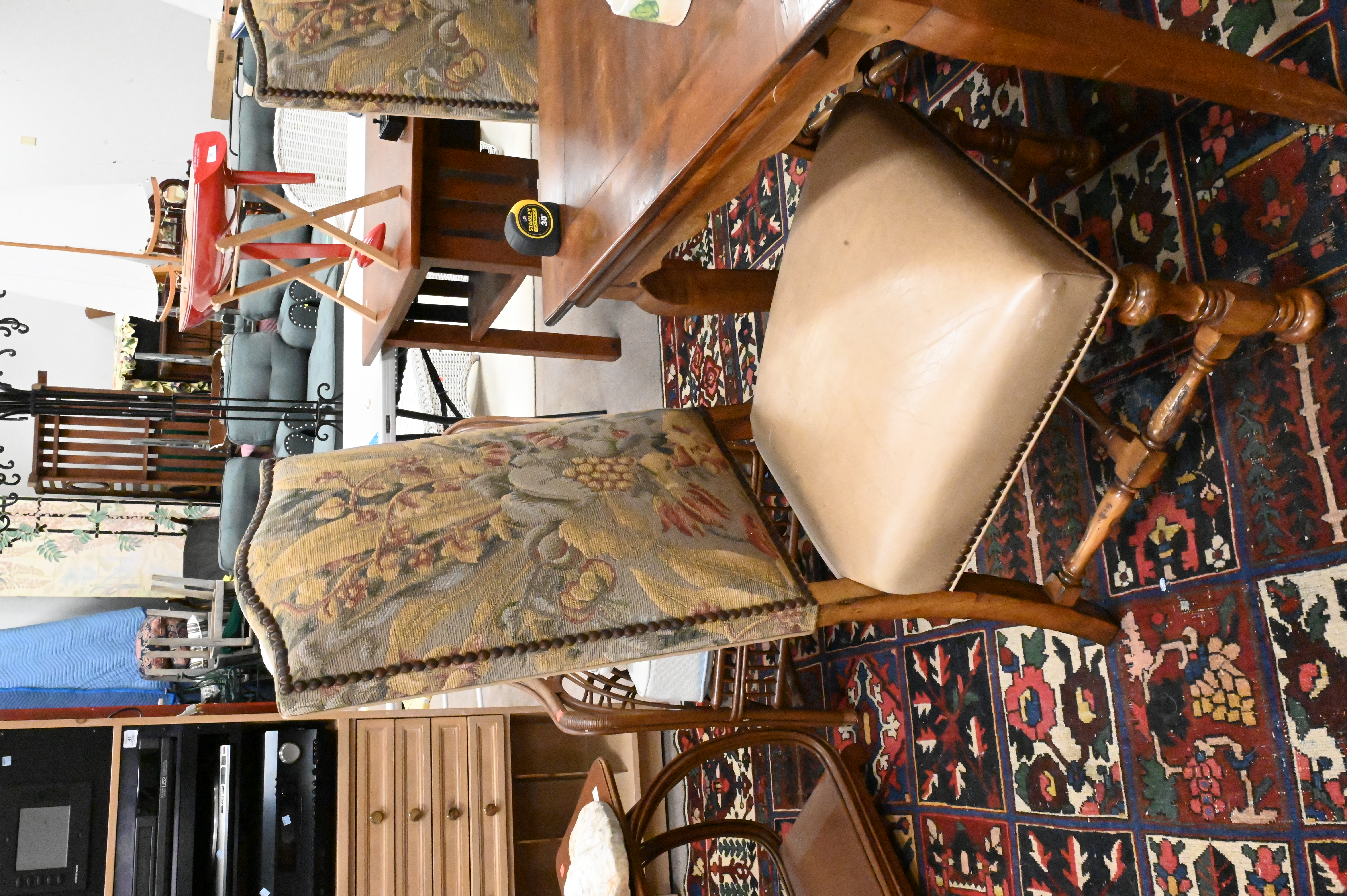 Lot 372A: Set of Six Dining Chairs having Leather Seats and Tapestry Style Backs